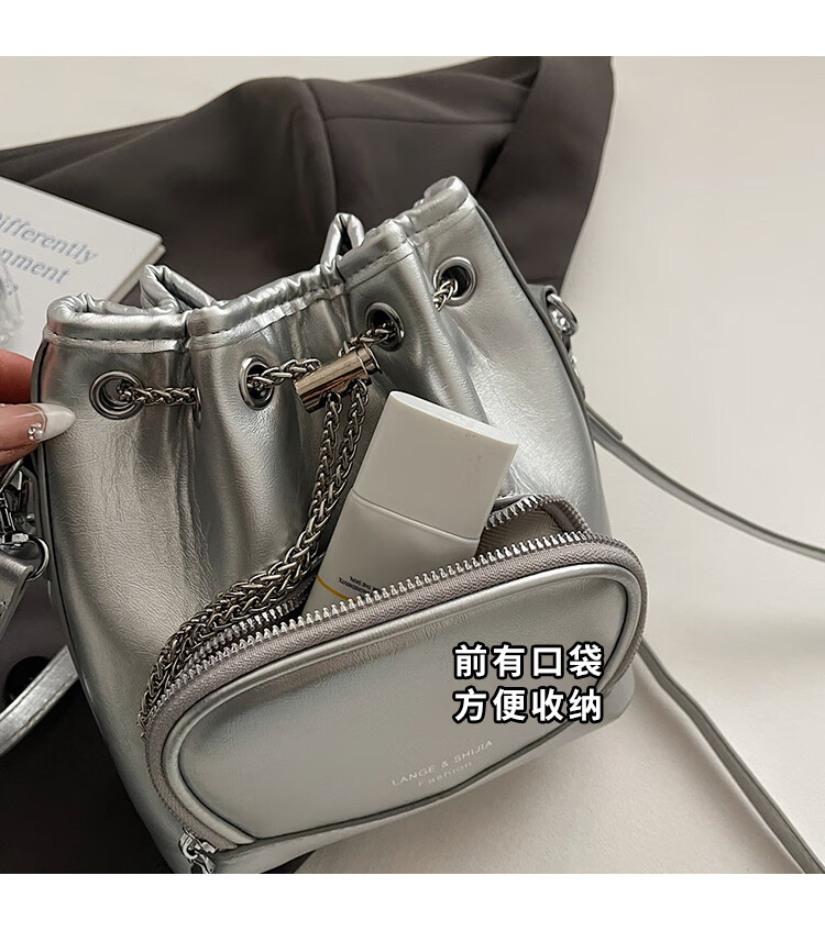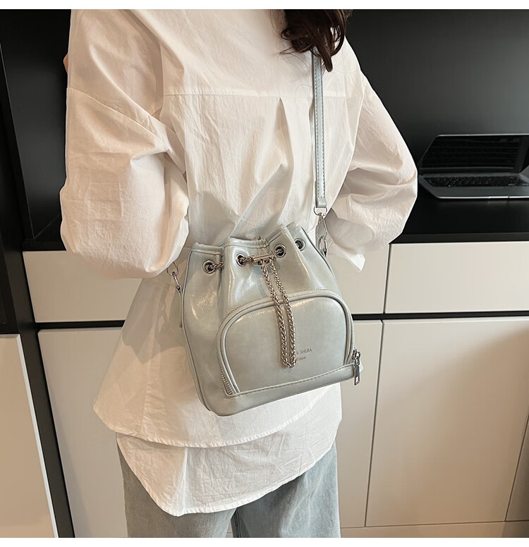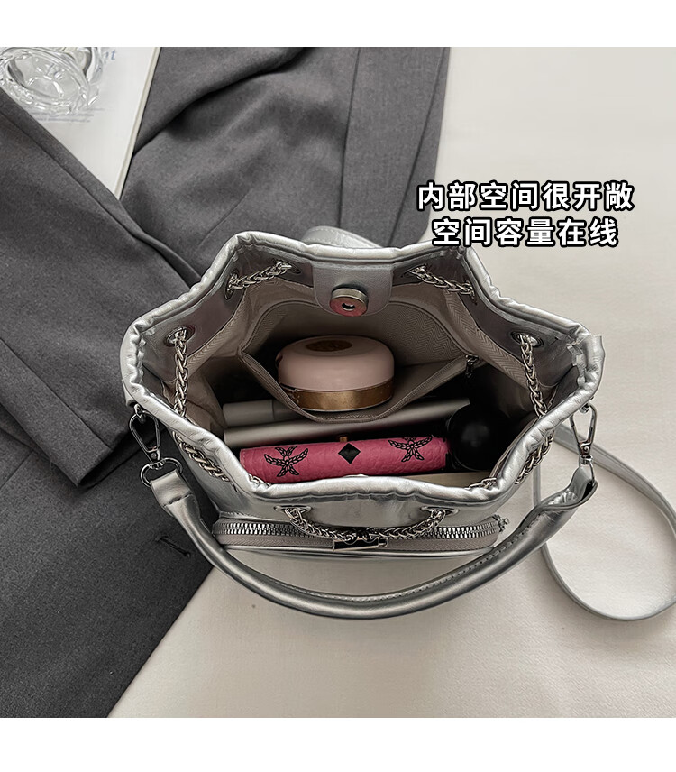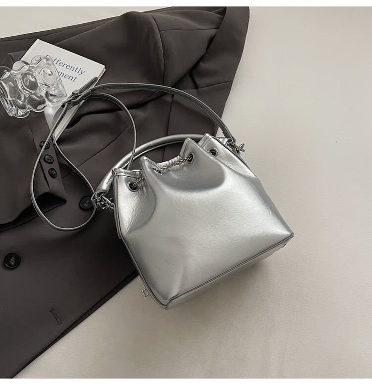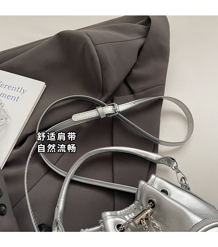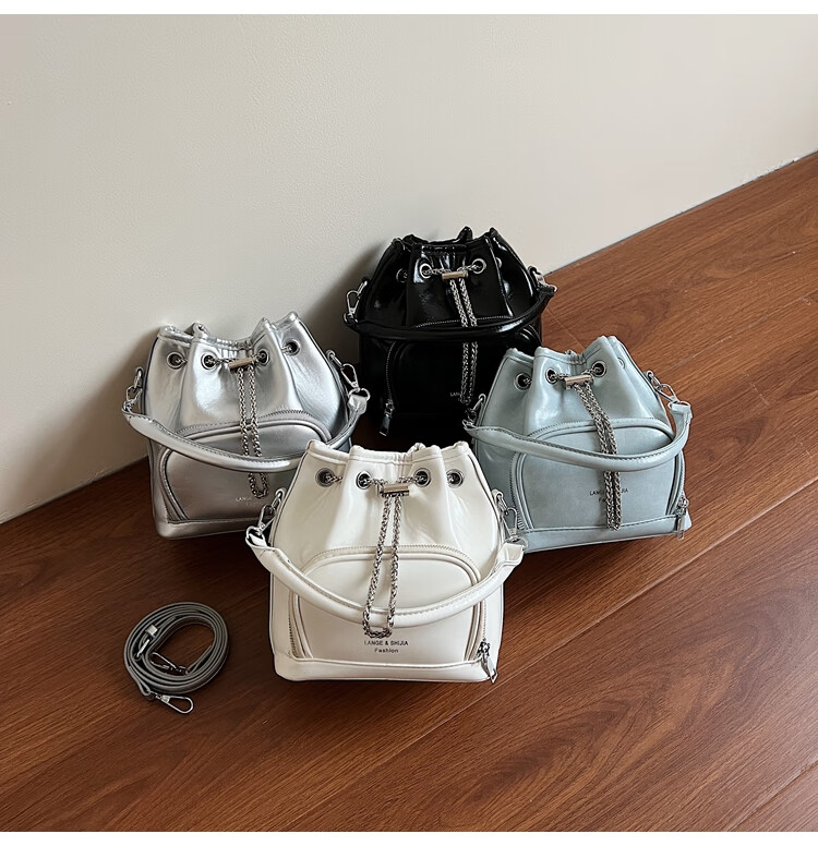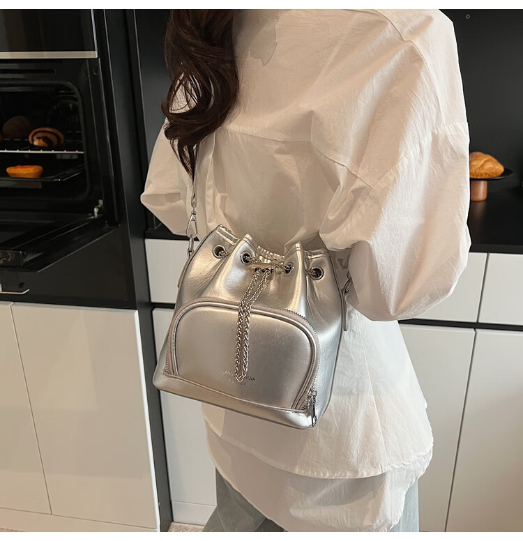 啄木鸟简约洋气抽绳手拎包包女式2025超火新款感流行单肩斜挎水桶包 黑色