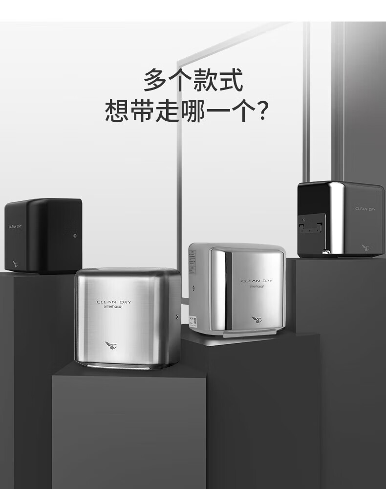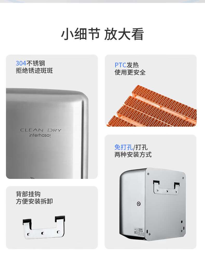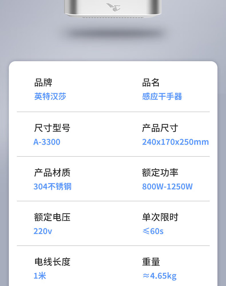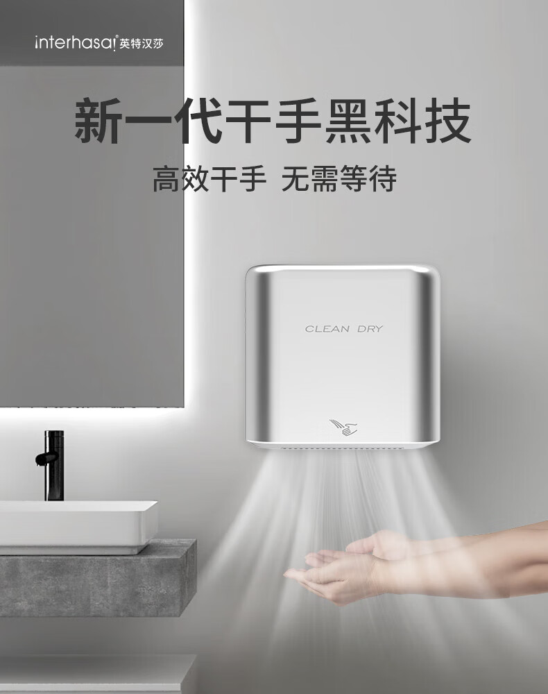英特汉莎不锈钢厕所烘手器烘干机卫生间烘手机全自动感应干手器吹干手机 A3893白色不锈钢[短款]