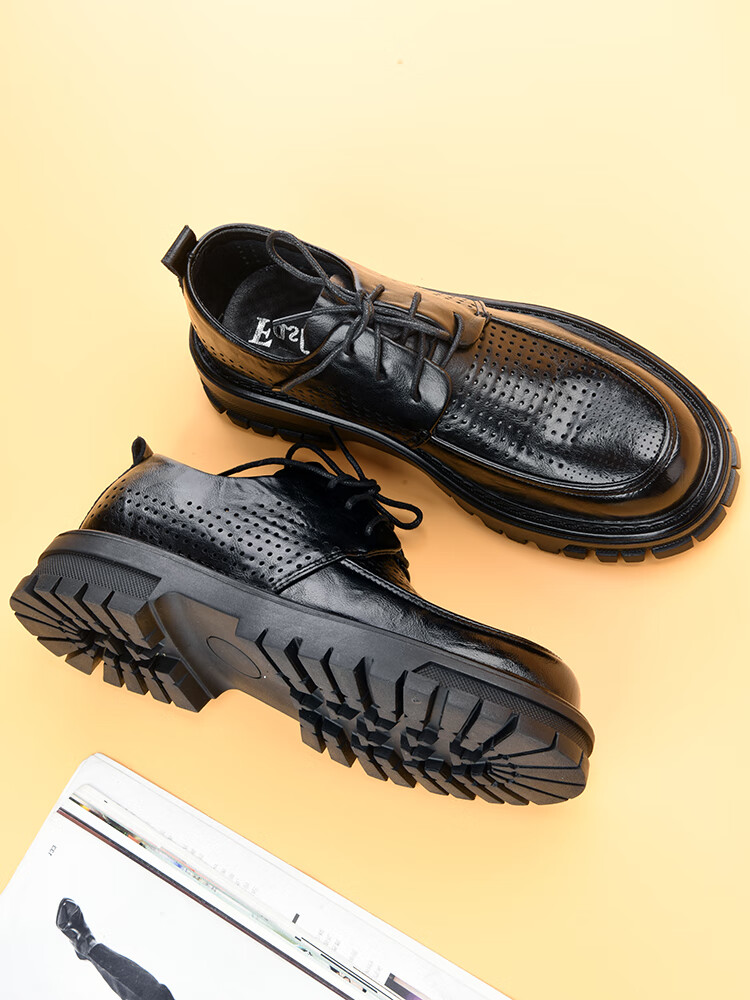 Oein Retro Genuine Leather Big Toe Derby Shoes Business Casual Men's Shoes Summer Breathable Hollow Leather Sandals Men's Perforated Thick Soles Black Lace Up 15267-0 Summer Perforated Single Layer 38 This One Size Larger