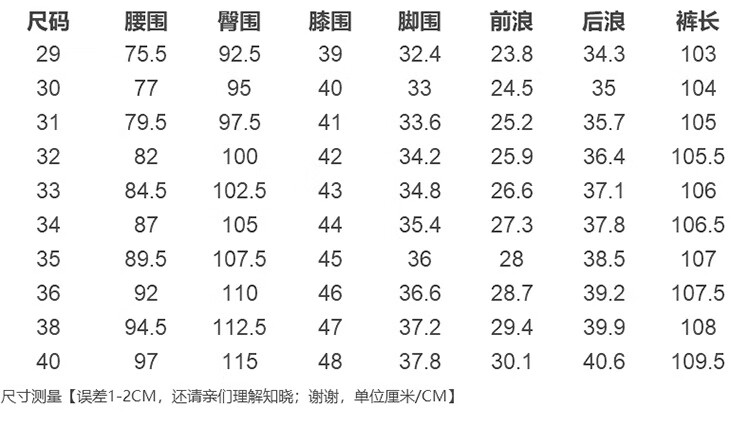 Outseam (cm) 99 cm 101.5 cm 104 cm 106.5 cm 109 cm