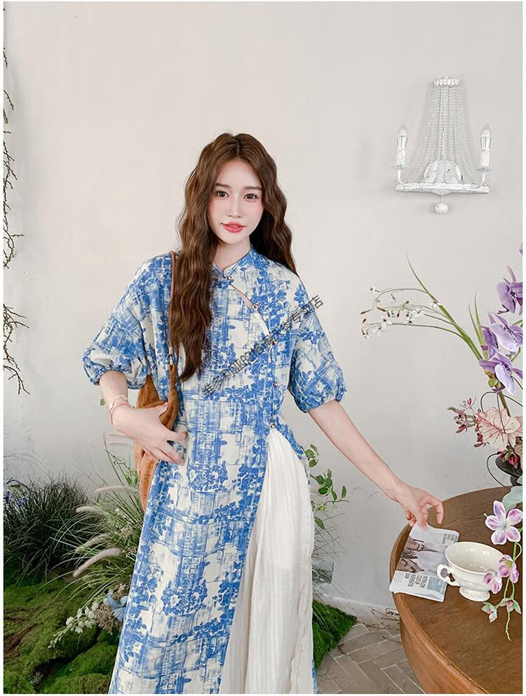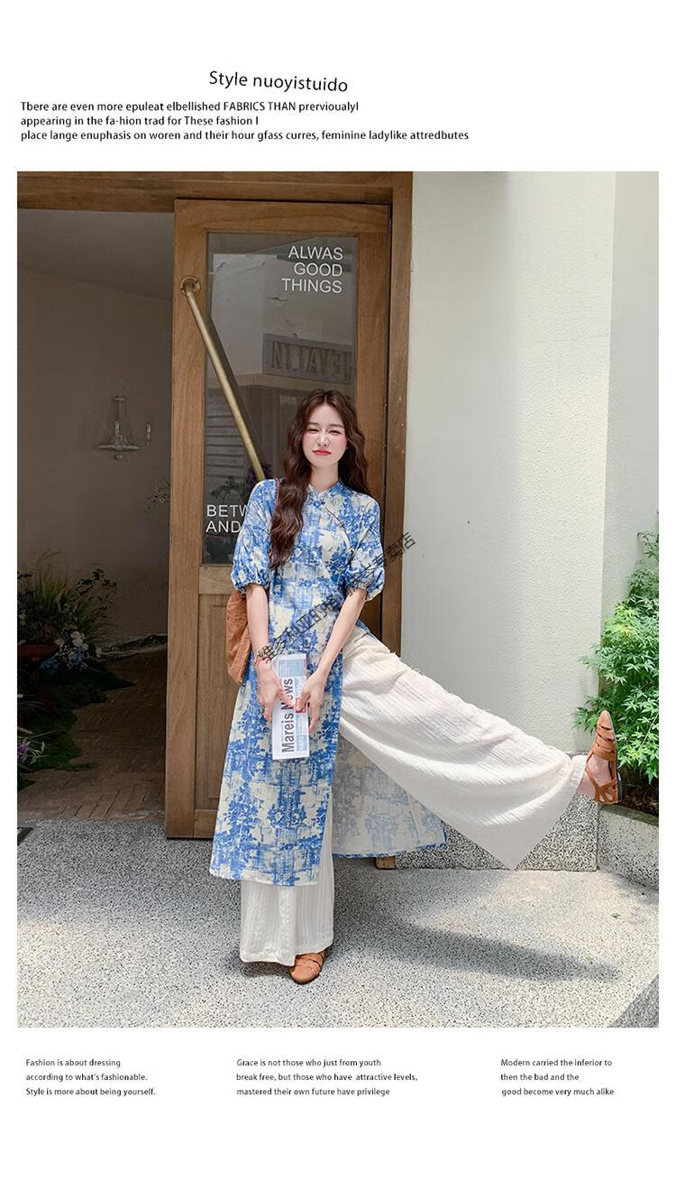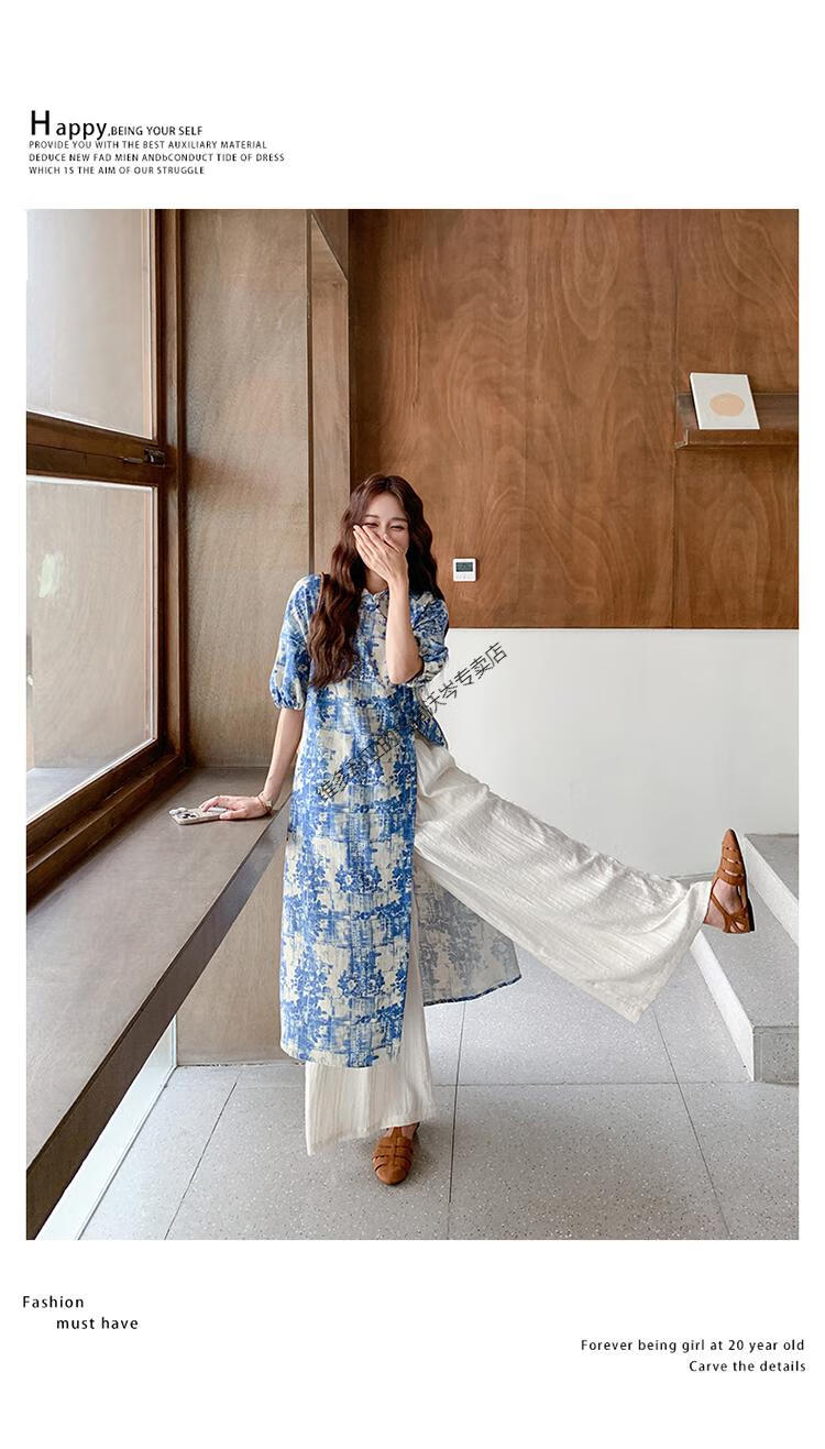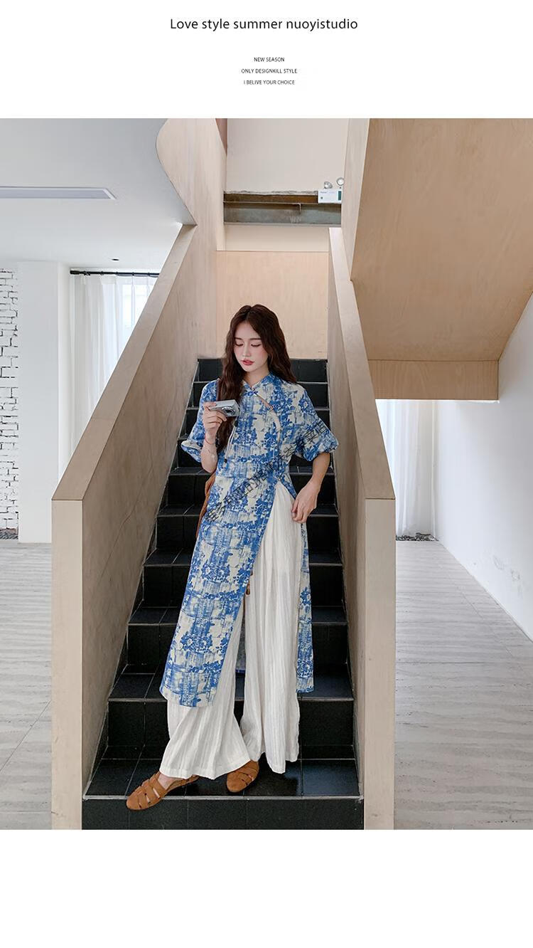 Style Victoria bleu nouveau style chinois style littéraire chemisier imprimé blanc mince pantalon large empilé ensemble deux pièces nouveau costume d'été pour femme ensemble deux pièces original XS recommandé 80Jin Jin équivaut à 0,5 kg -95Jin Jin équivaut à 0,5 kg