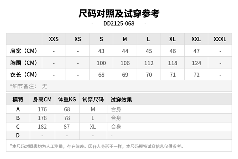 China (cm) 160-165/84-86 165-170 / 88-90 167-172 / 92-96 168-173 / 98-102 170-176 / 106-110