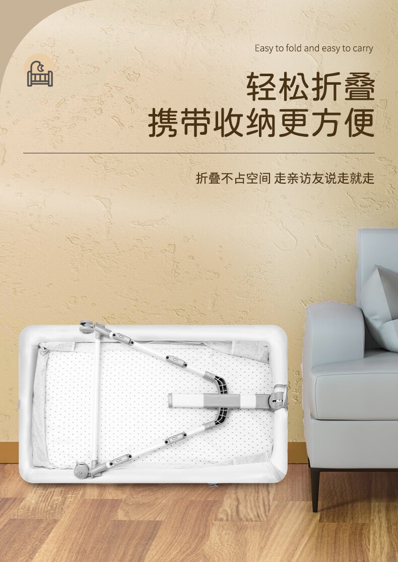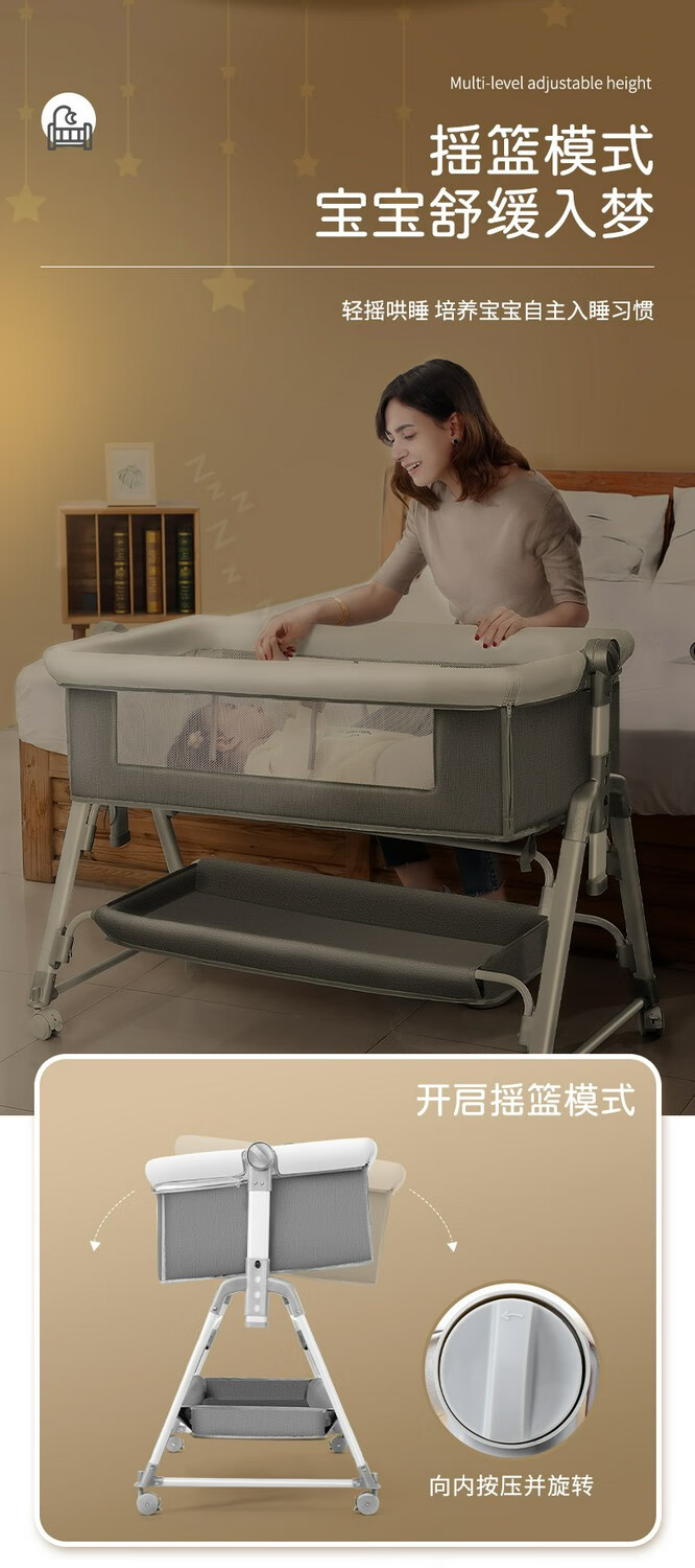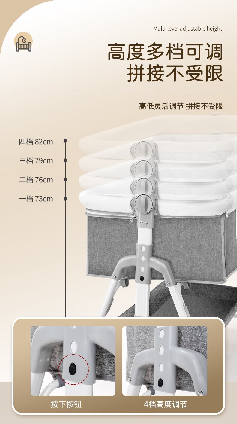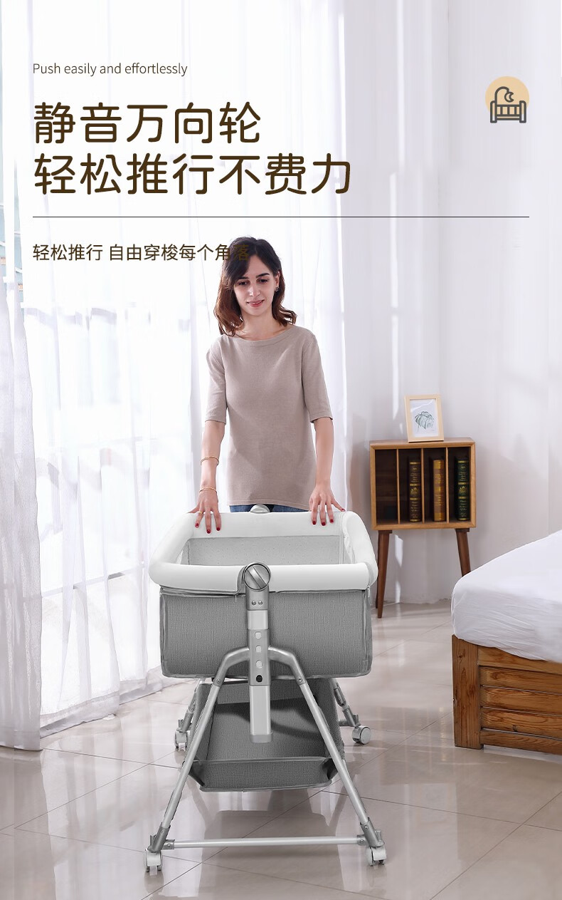 多功能可折叠婴儿床可移动便携式新生儿摇篮床欧式宝宝床拼接大床 灰色+蚊帐+床垫+尿布台