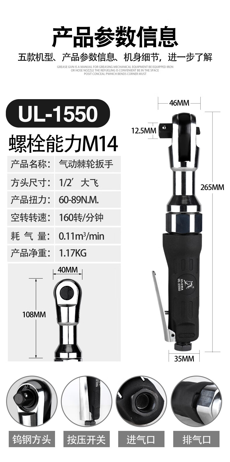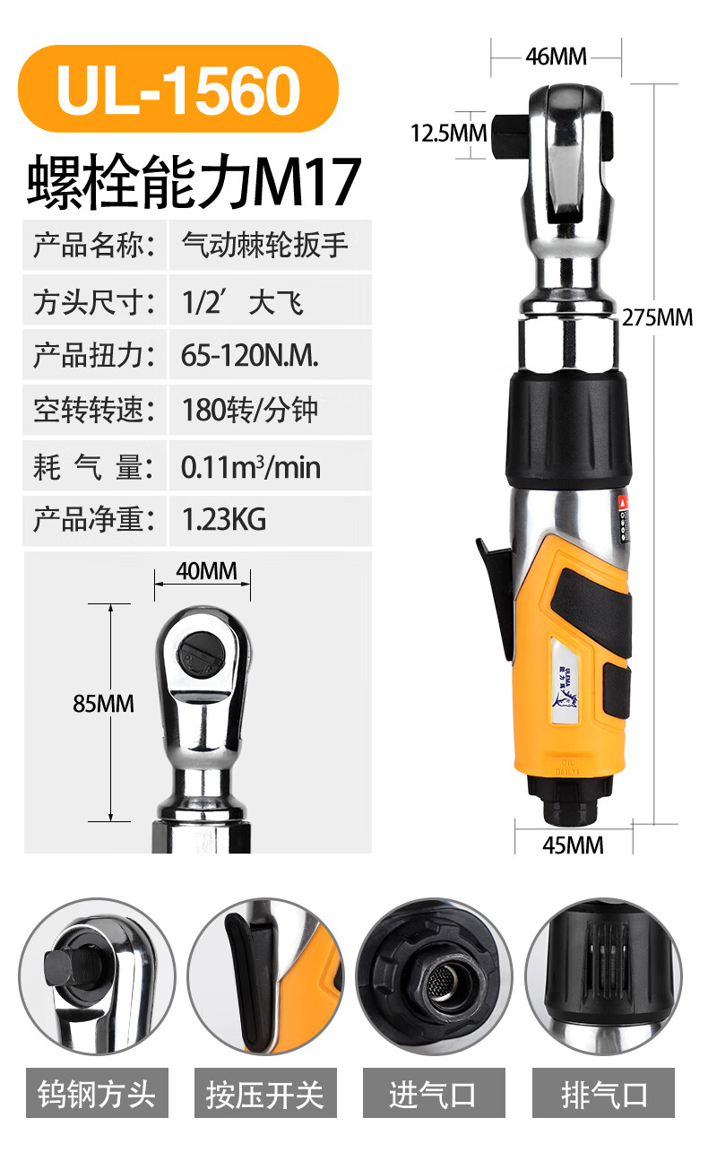 锐力马(ULEMA)1/2寸3/8寸90度气动棘轮扳手小风炮直角风扳手气动扳机工具 UL-15 UL-15601/2寸方头大飞套筒