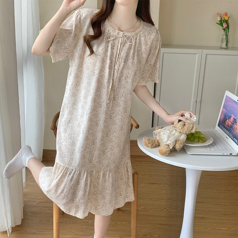 维多利亚的格调带胸垫睡衣女夏季2025新款宽松可爱韩版碎花睡裙中长款家居服大码 M16862【带胸垫】 M