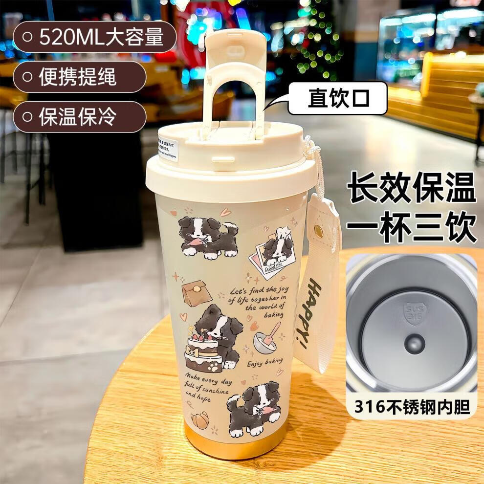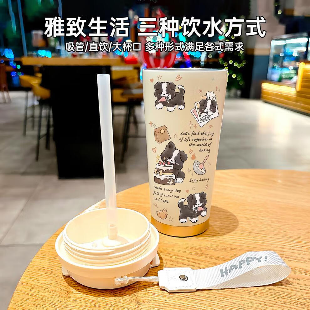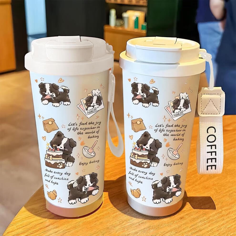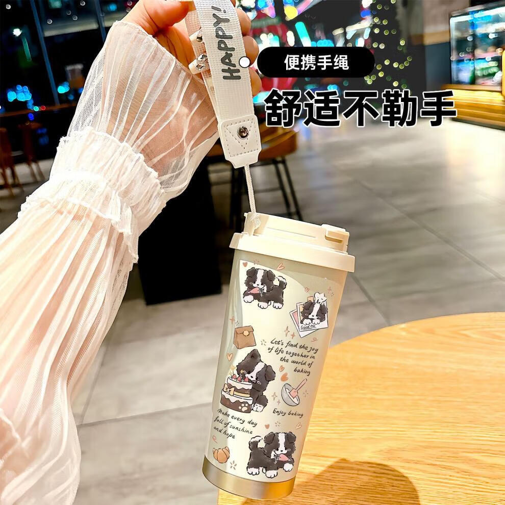 SUPOR taza termo para mujeres con buena apariencia 2025 nuevo cachorro feliz taza de café especial para estudiantes de acero inoxidable portátil DX1047 gato de tinta de arco + con cordón de acero inoxidable 316
