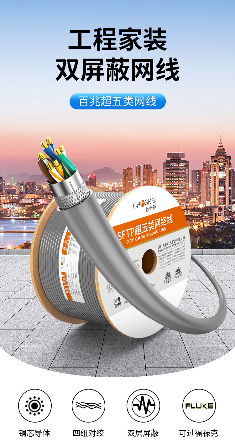 Akihabara (CHOSEAL) Category 5e double-shielded network cable with Fluke anti-interference and attenuation pure copper core engineering home decoration monitoring wiring box line gray 305 meters QS2603AT305