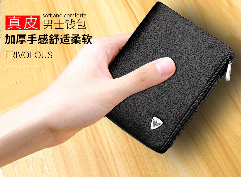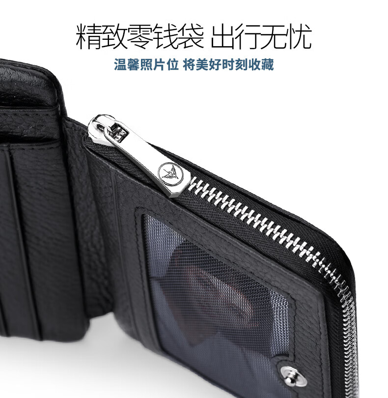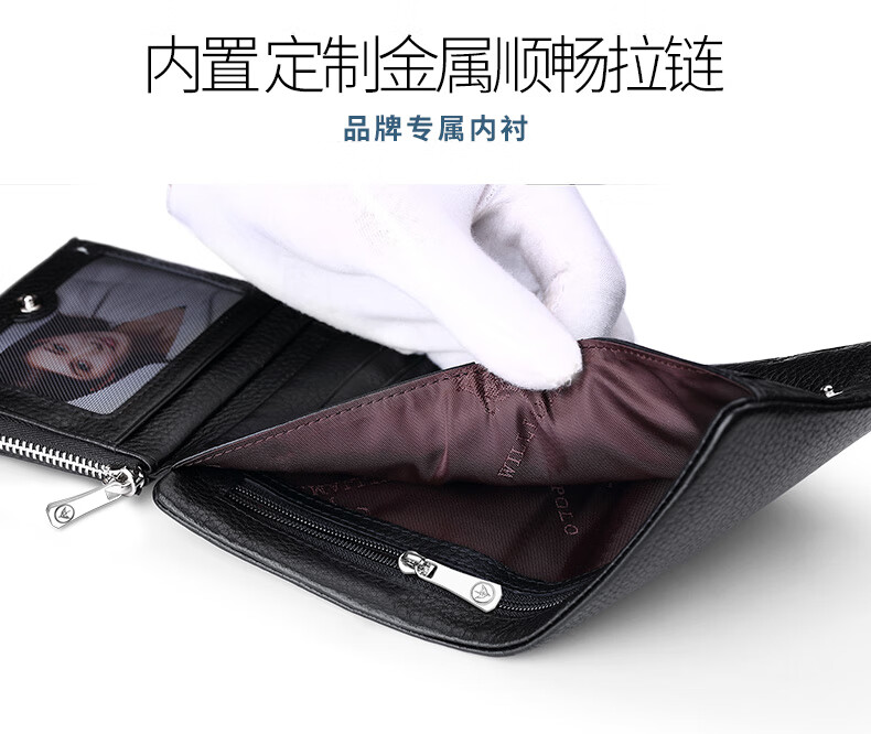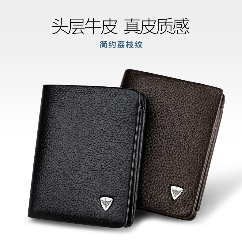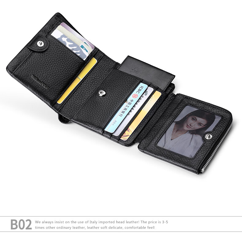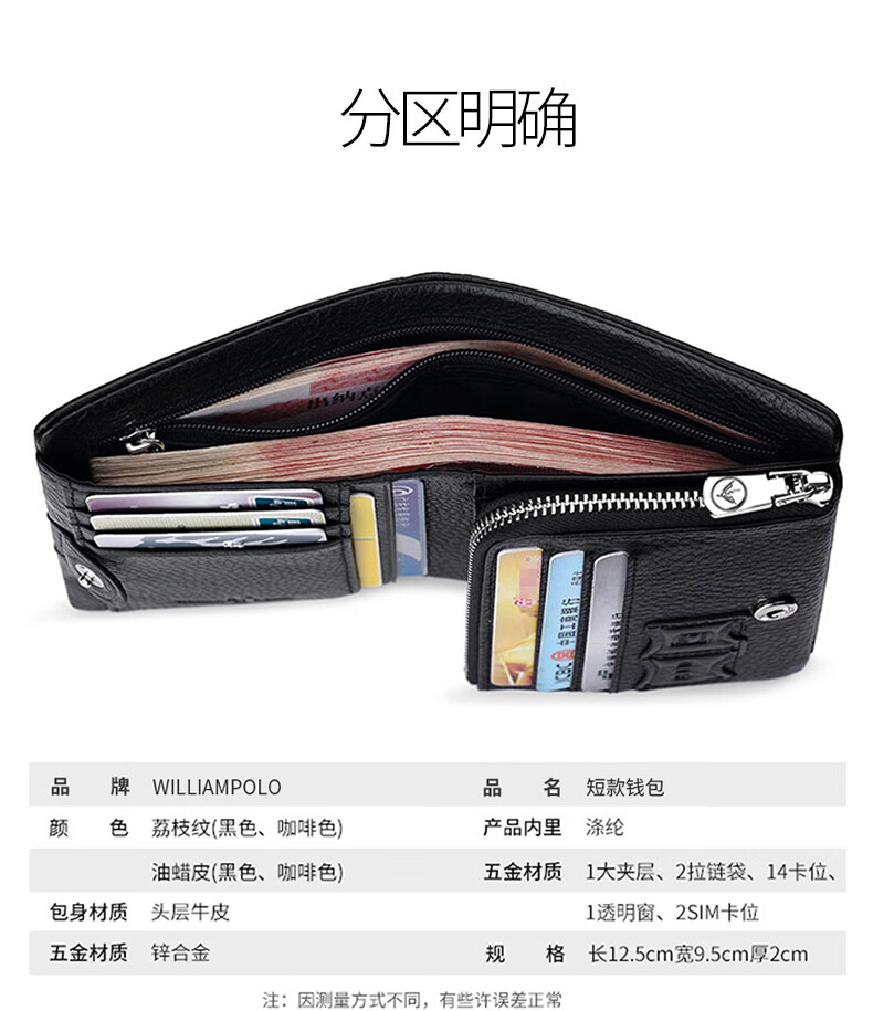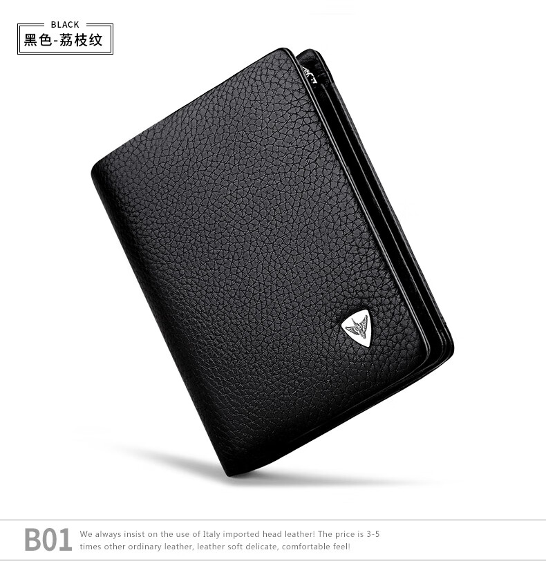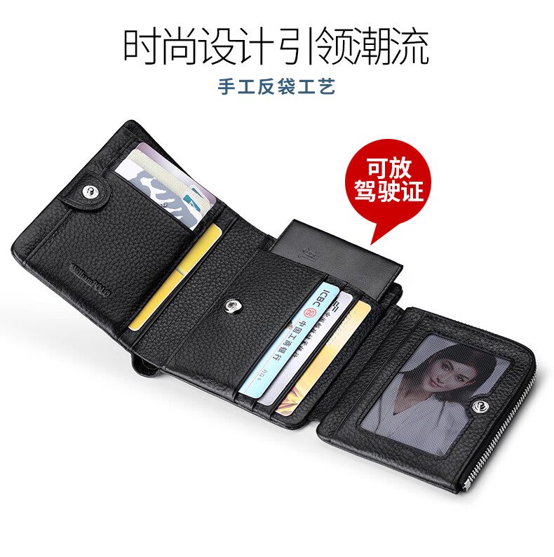 WILLIAMPOLO Empereur Paul Porte-cartes de permis de conduire à trois volets en cuir de vache première couche pour hommes Boucle multi-fentes Court Porte-monnaie vertical Motif Litchi noir Original avec comptoir Boîte-cadeau (Portefeuille) Version brosse antivol