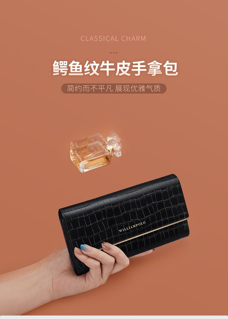 WILLIAMPOLO Emperor Paul patrón de cocodrilo bolso de mano de moda de cuero cartera larga multifuncional para mujer pantalla grande teléfono móvil bolso de mano pequeño negro
