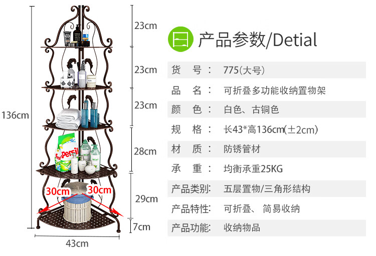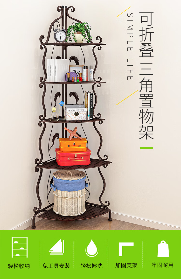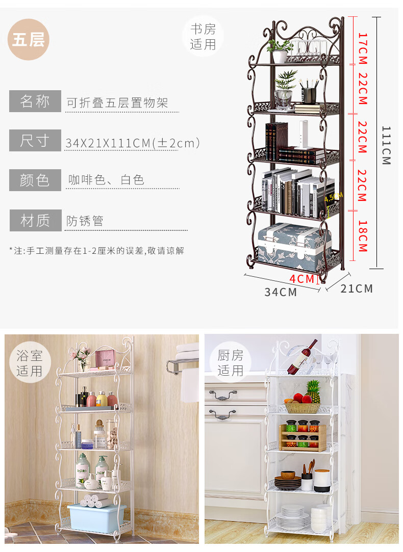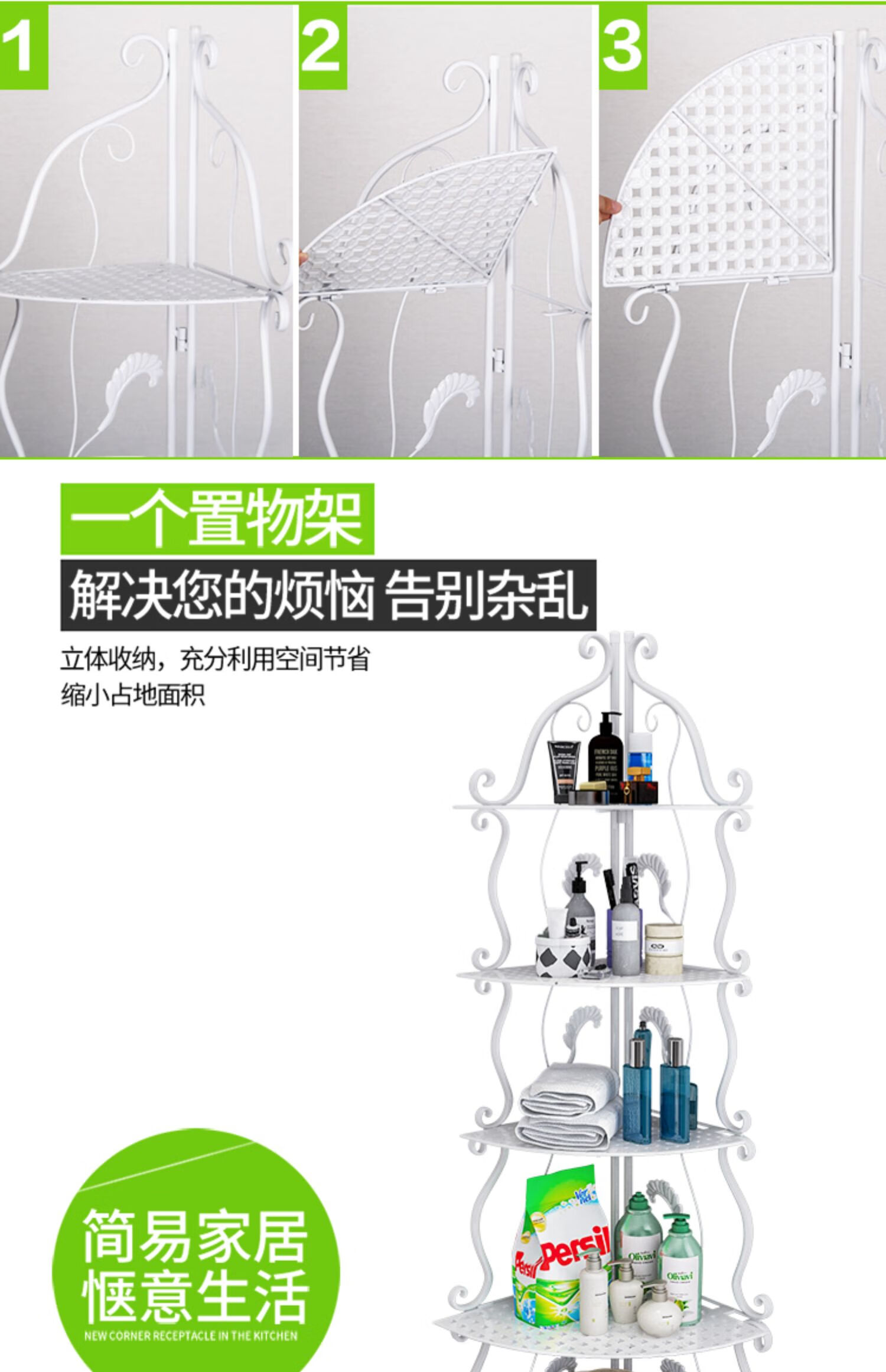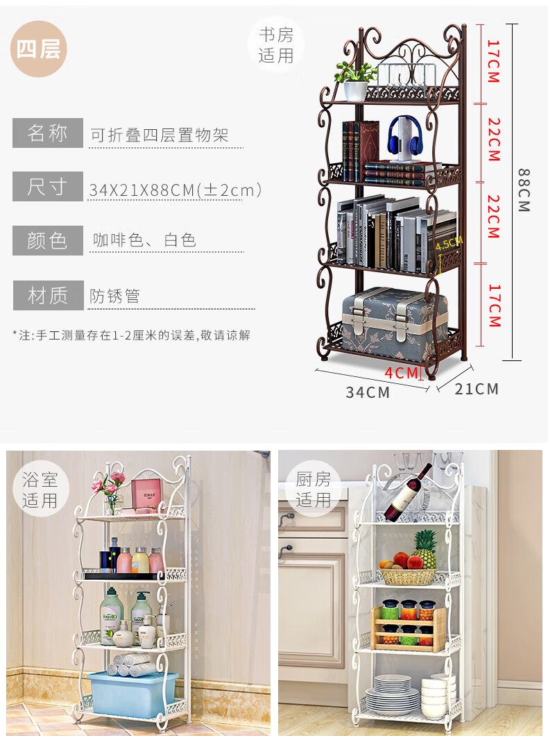 林仕屋免安装折叠置物架铁艺卫生间脸盆架洗手间厨房收纳储物架层架家用 【四角3层】白色-宽34高65cm 浴室卧室通用免安装