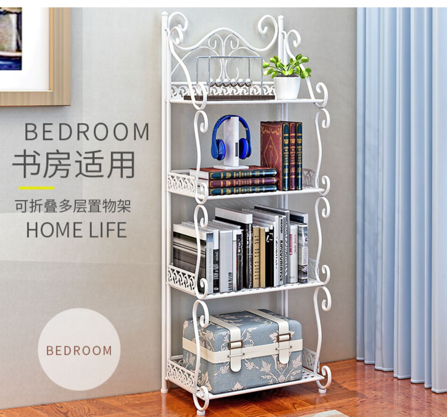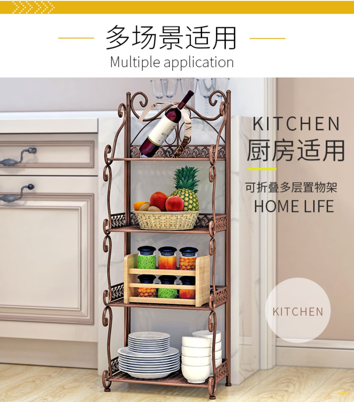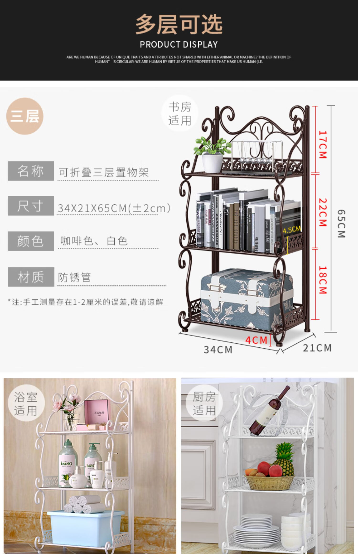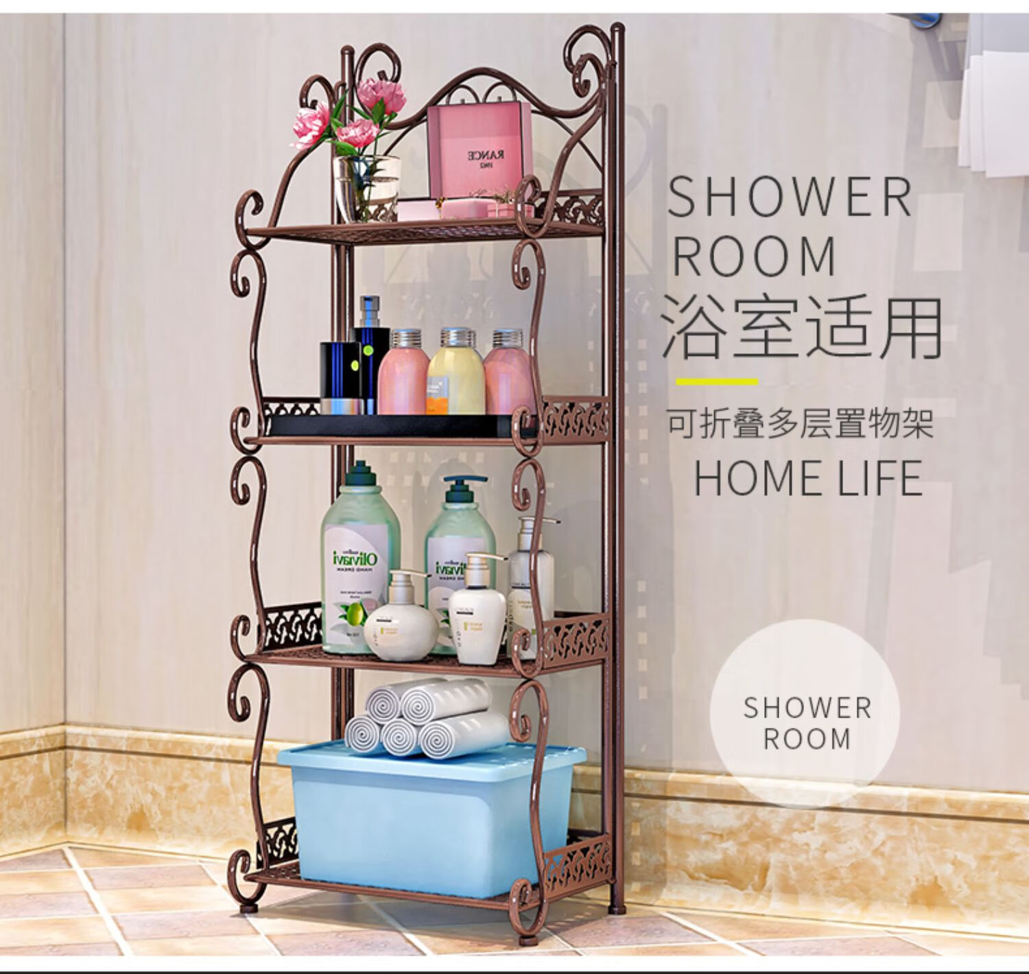 林仕屋免安装折叠置物架铁艺卫生间脸盆架洗手间厨房收纳储物架层架家用 【四角3层】白色-宽34高65cm 浴室卧室通用免安装