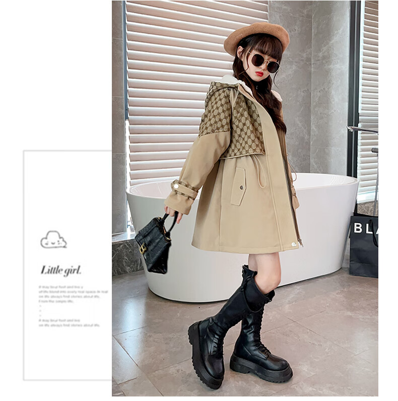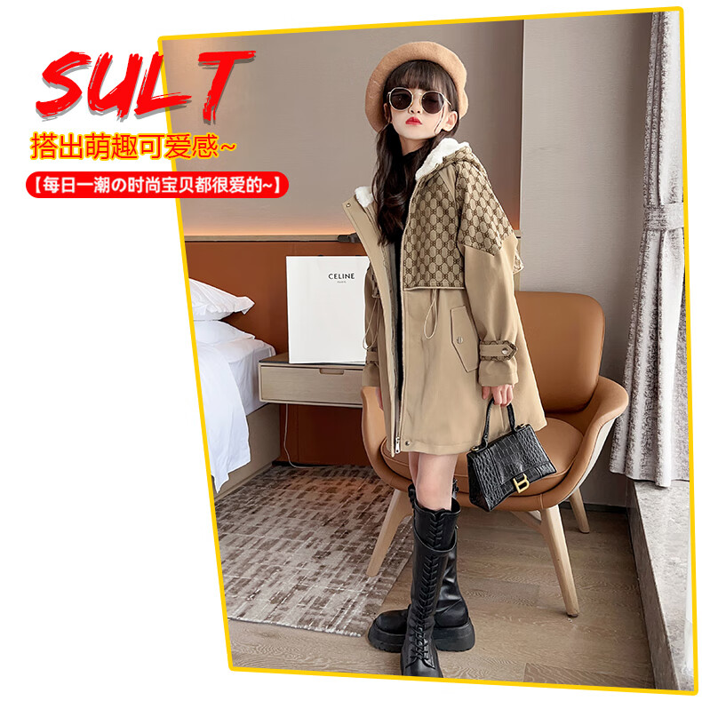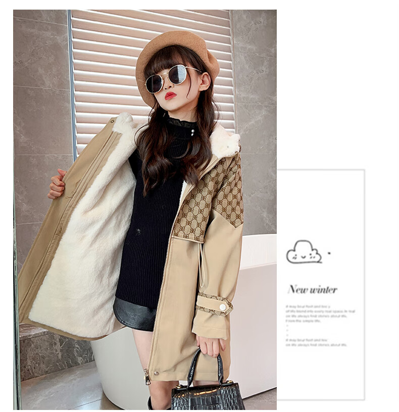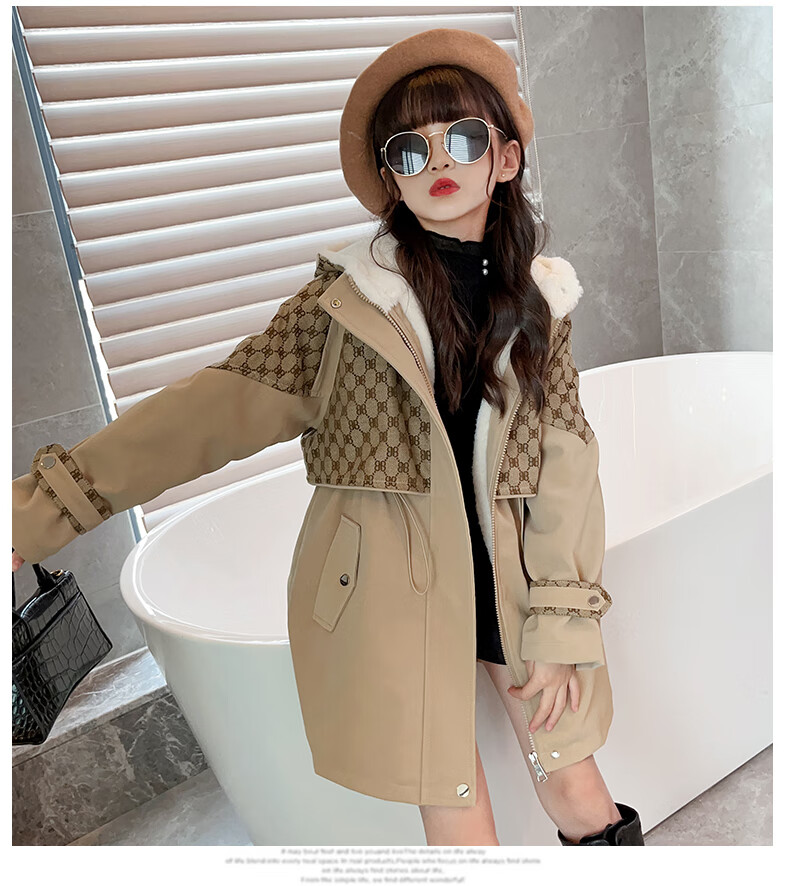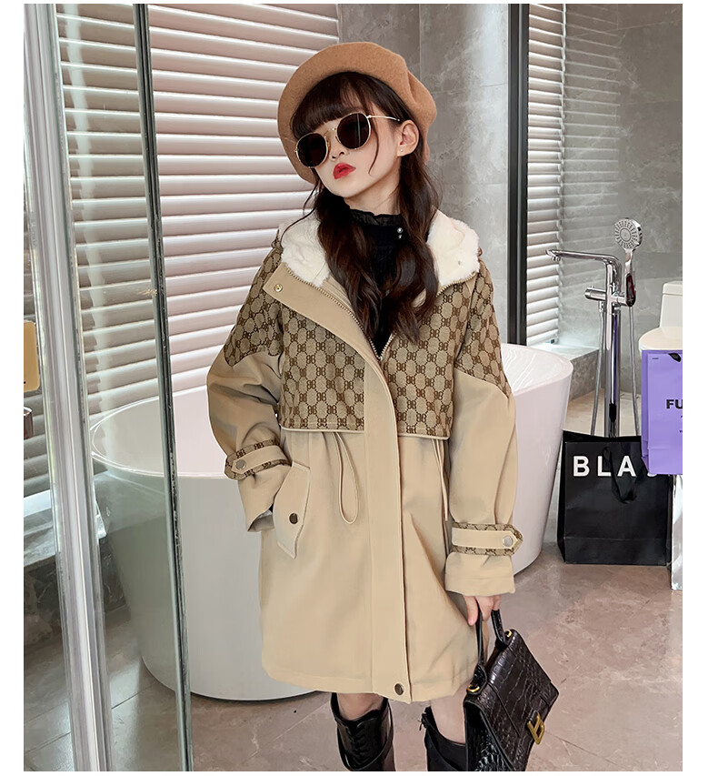 细仔码头儿童装女童派克服外套中大童毛领时尚加绒加厚中长款大衣棉服韩版 卡其色 毛领可拆卸 160