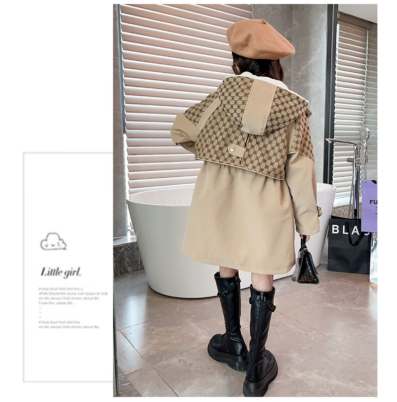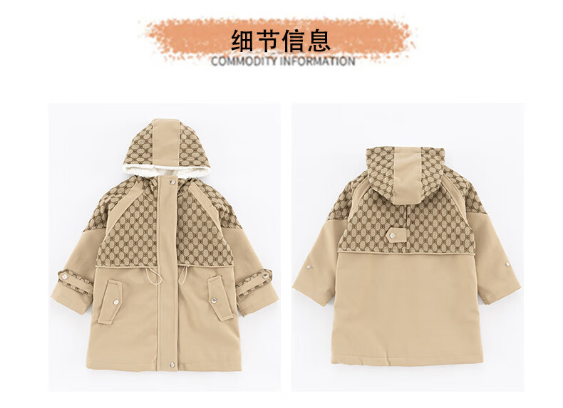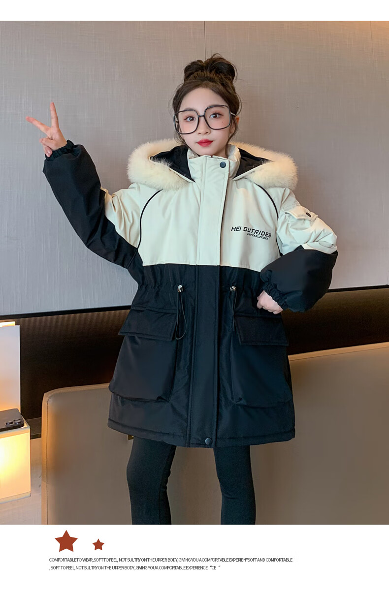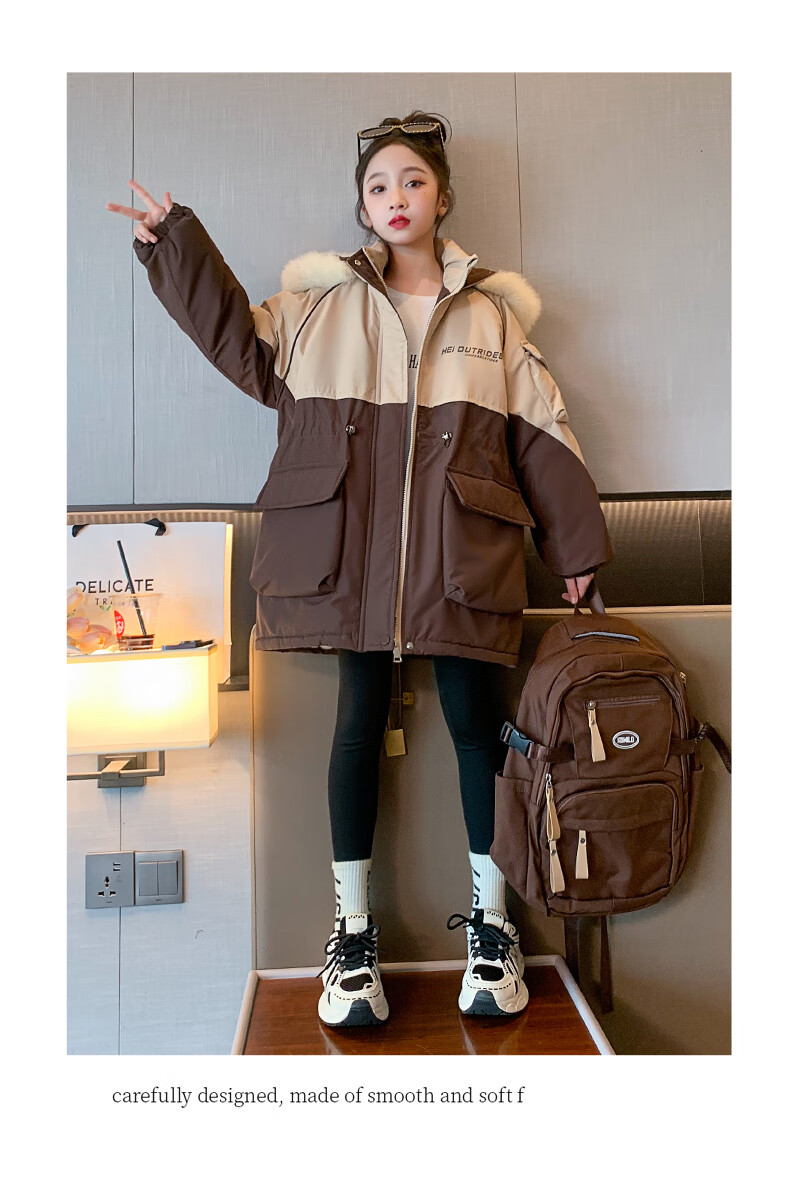 细仔码头儿童装女童派克服外套中大童毛领时尚加绒加厚中长款大衣棉服韩版 卡其色 毛领可拆卸 160