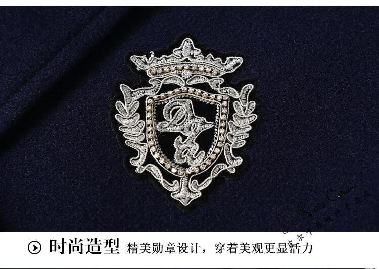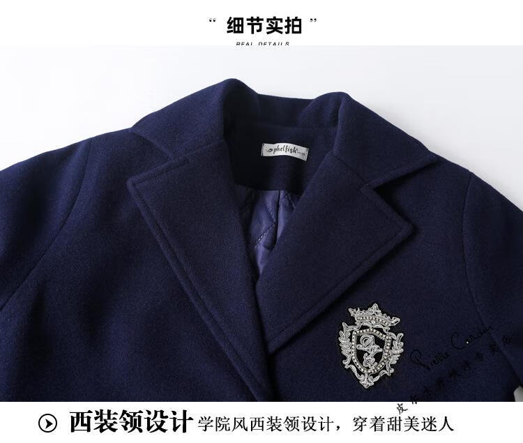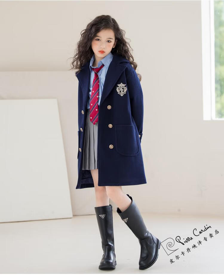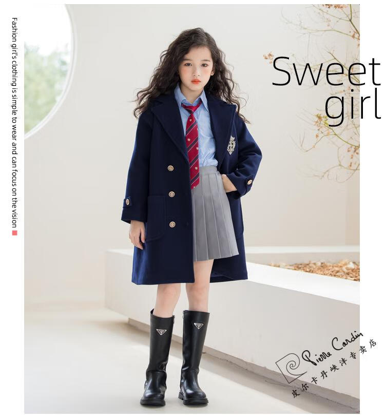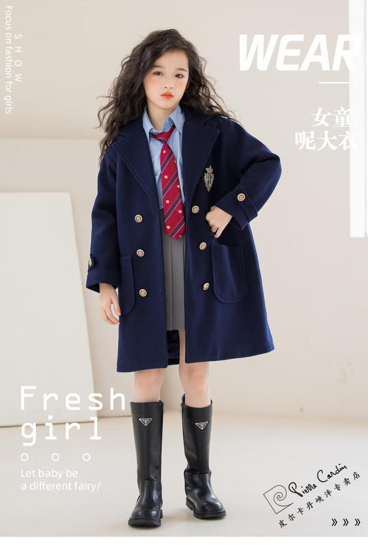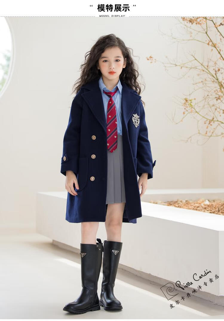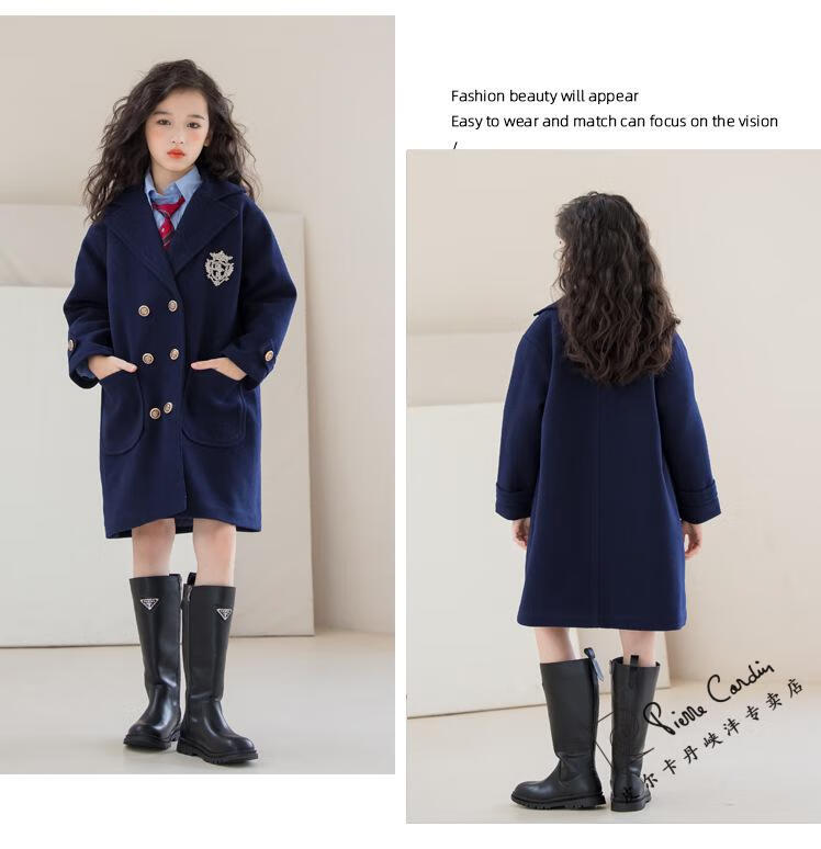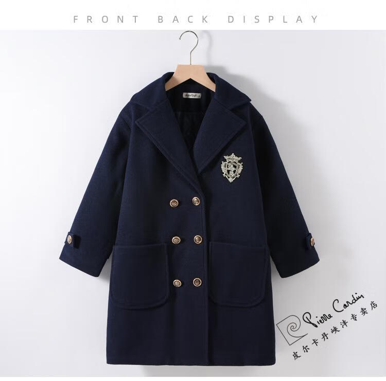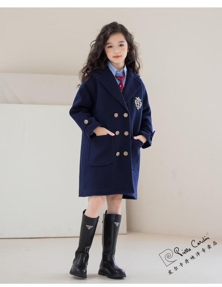 Pierre Cardin Wollmantel für Mädchen, britischer College-Stil, 2025, Winter, verdickt, mittellang, großer Wollmantel für Kinder, warm, Marineblau, 150 cm