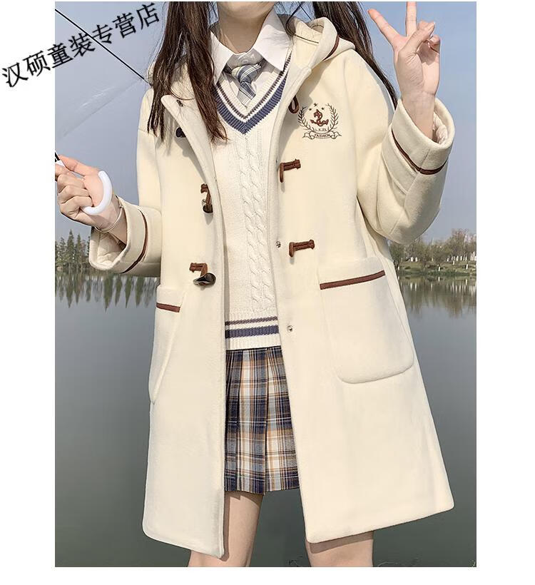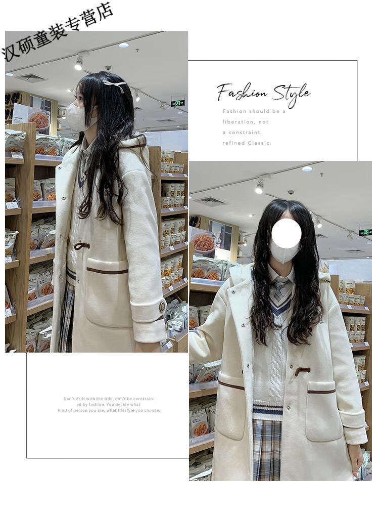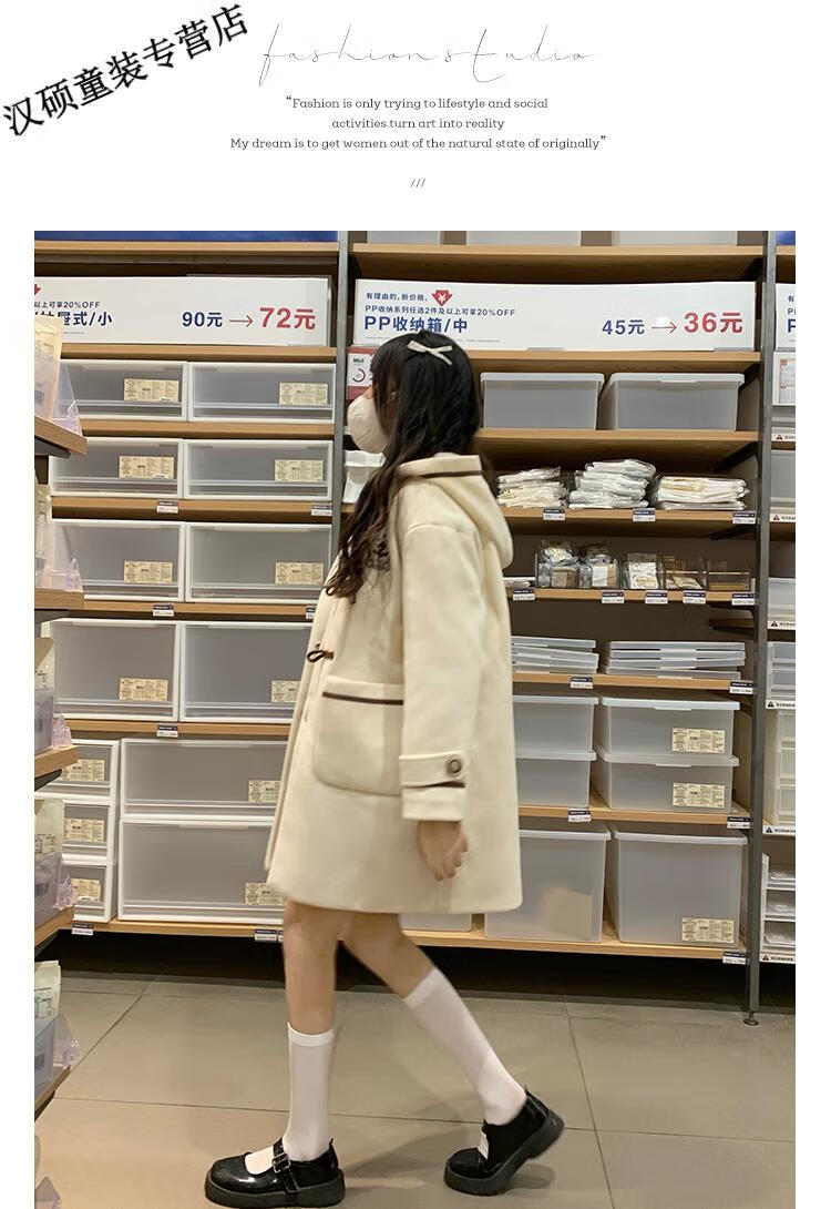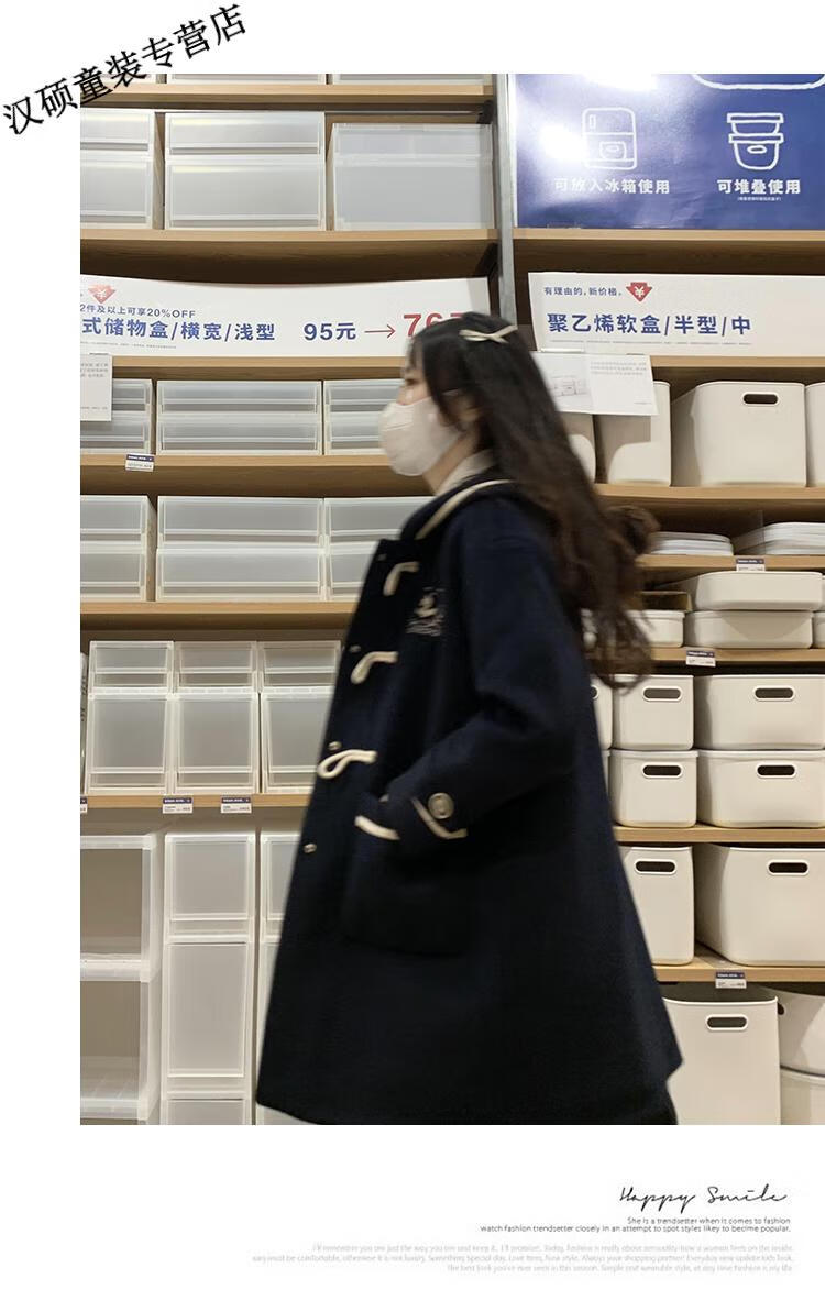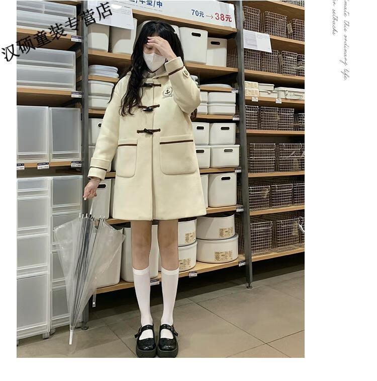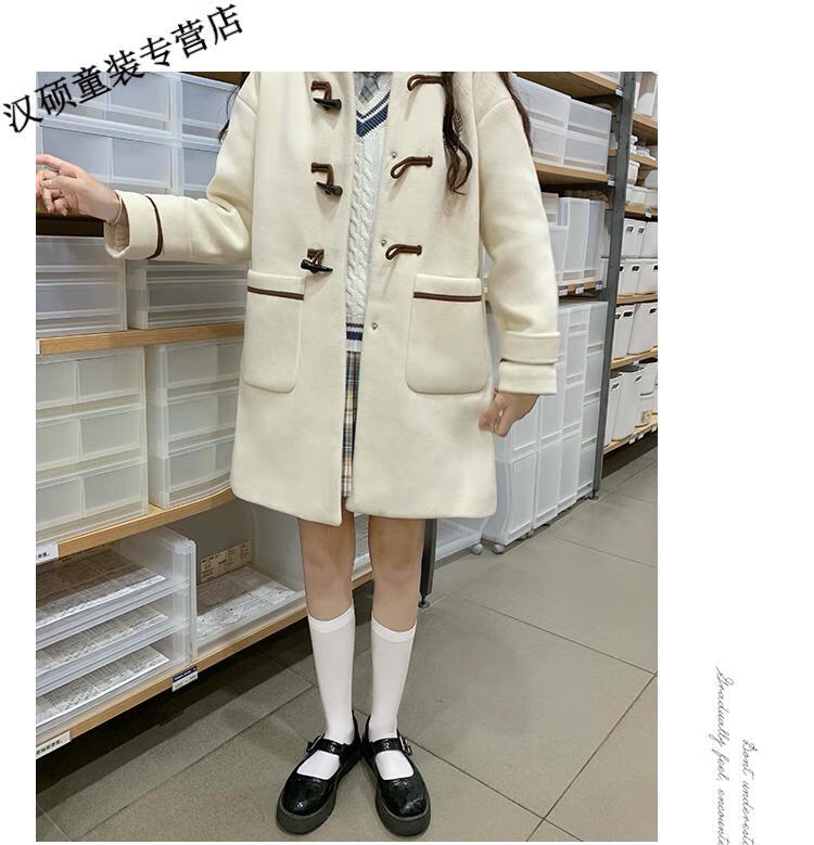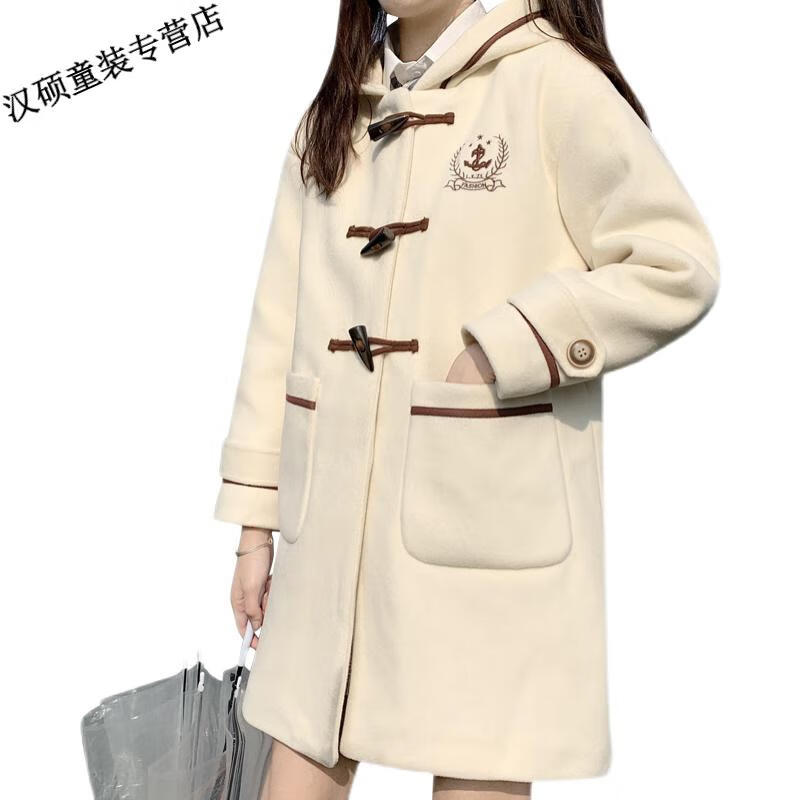 迪士尼(Disney)女大童学院风毛呢外套加棉加厚12-15岁高初中学生牛角扣呢子大衣 杏色 S码建议70-90斤