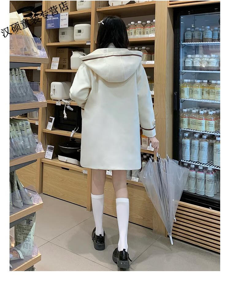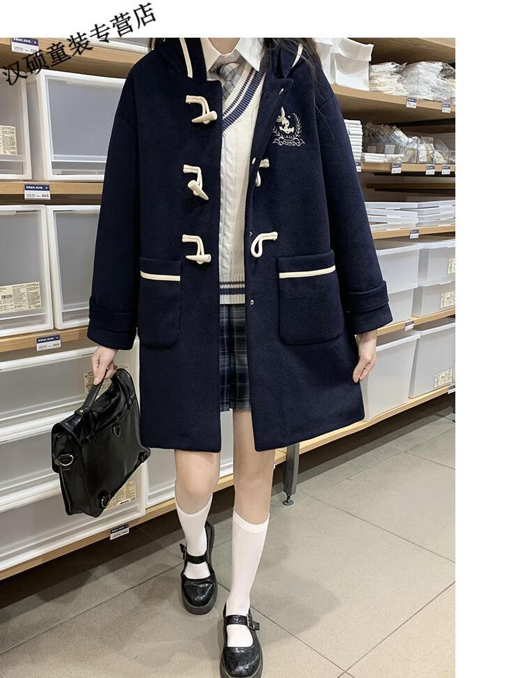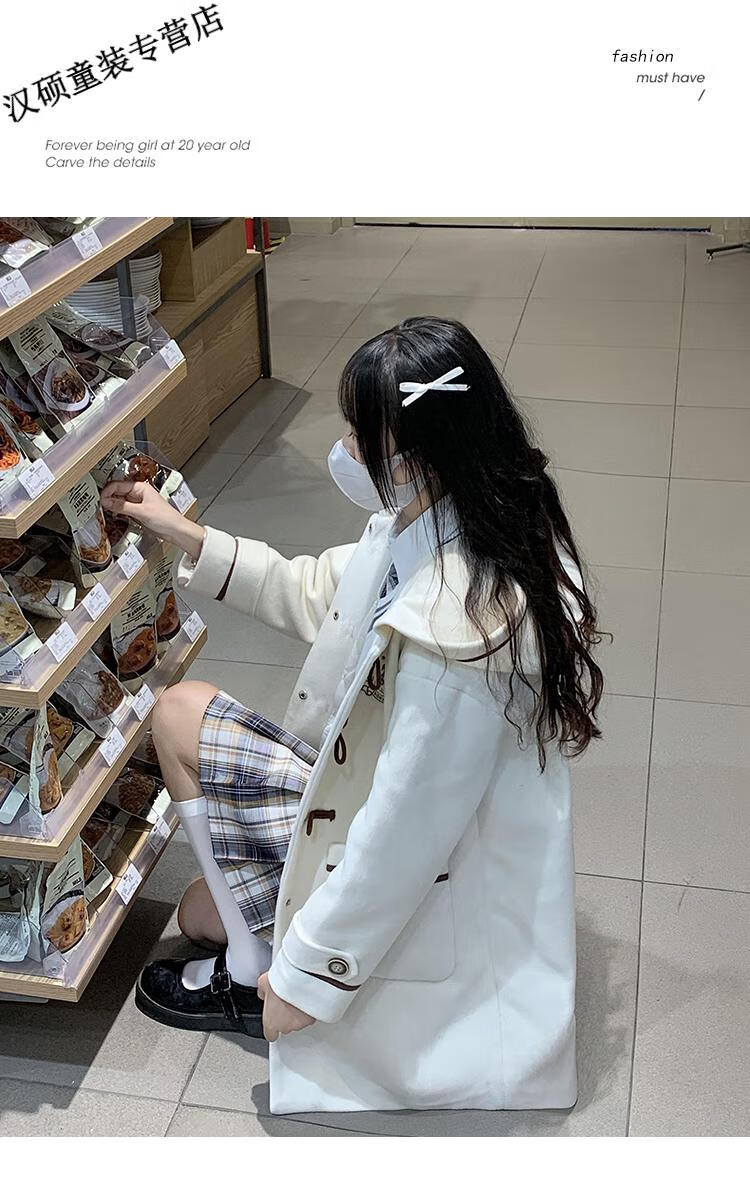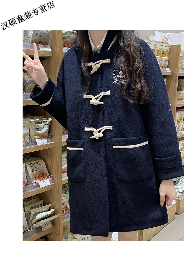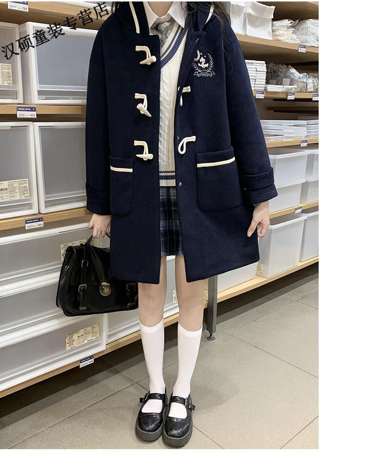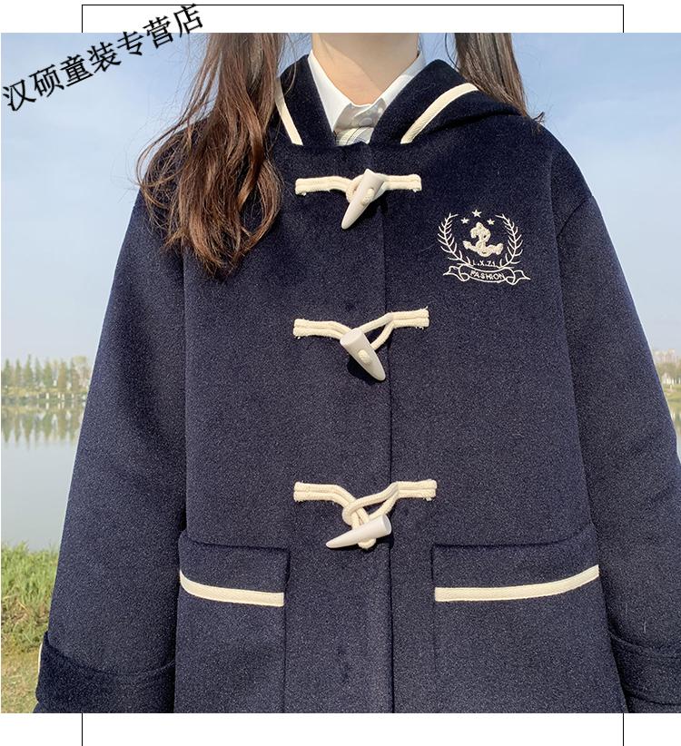 迪士尼(Disney)女大童学院风毛呢外套加棉加厚12-15岁高初中学生牛角扣呢子大衣 杏色 S码建议70-90斤