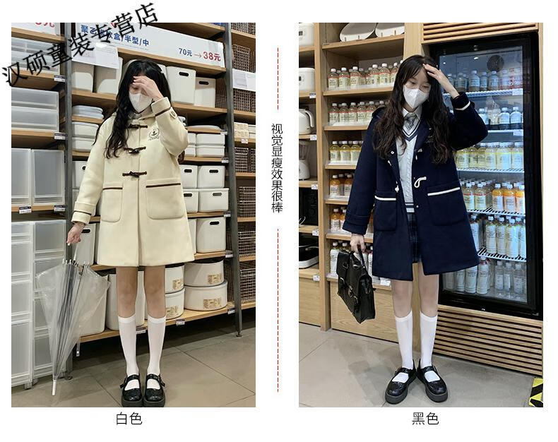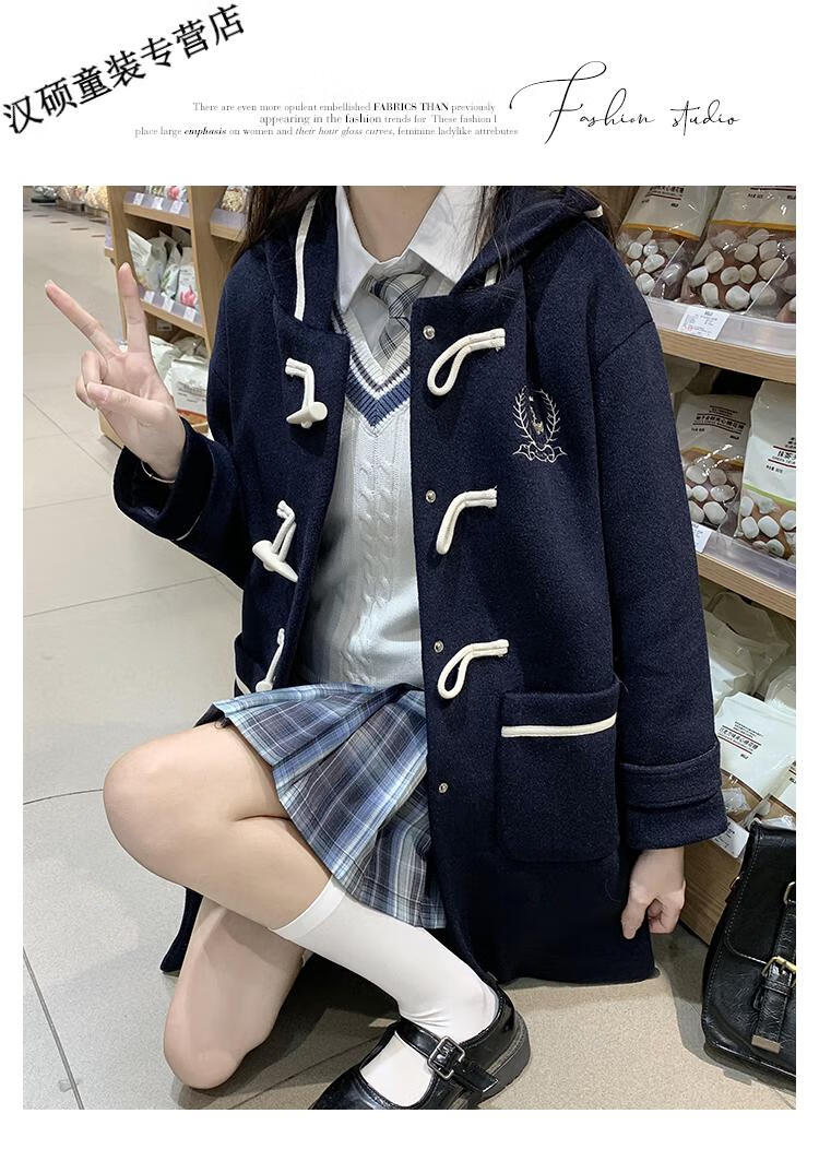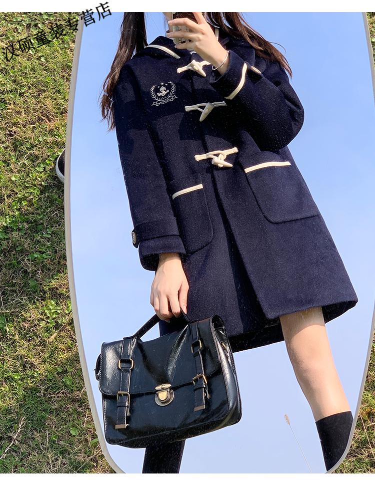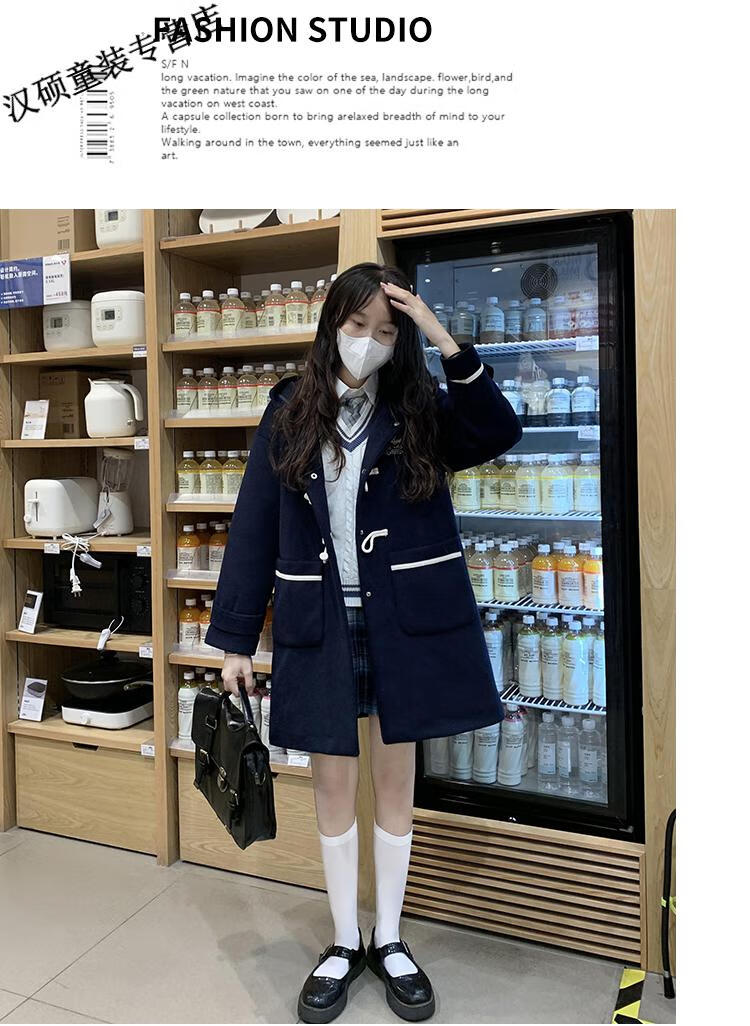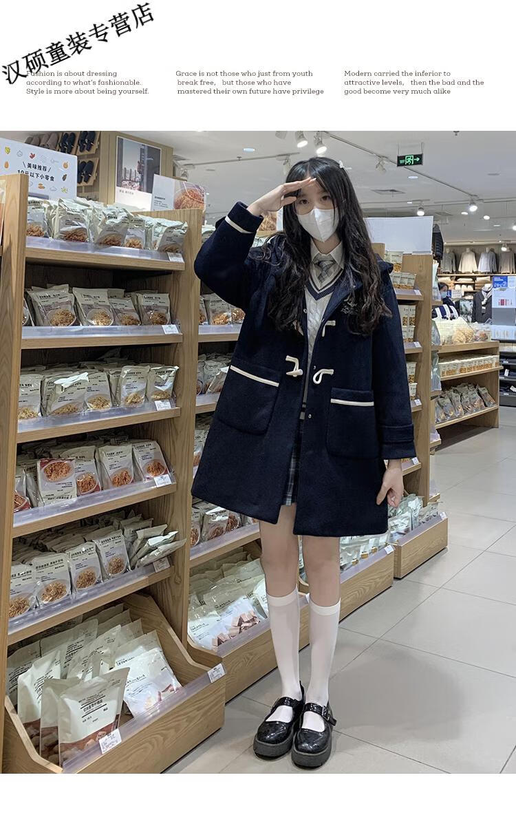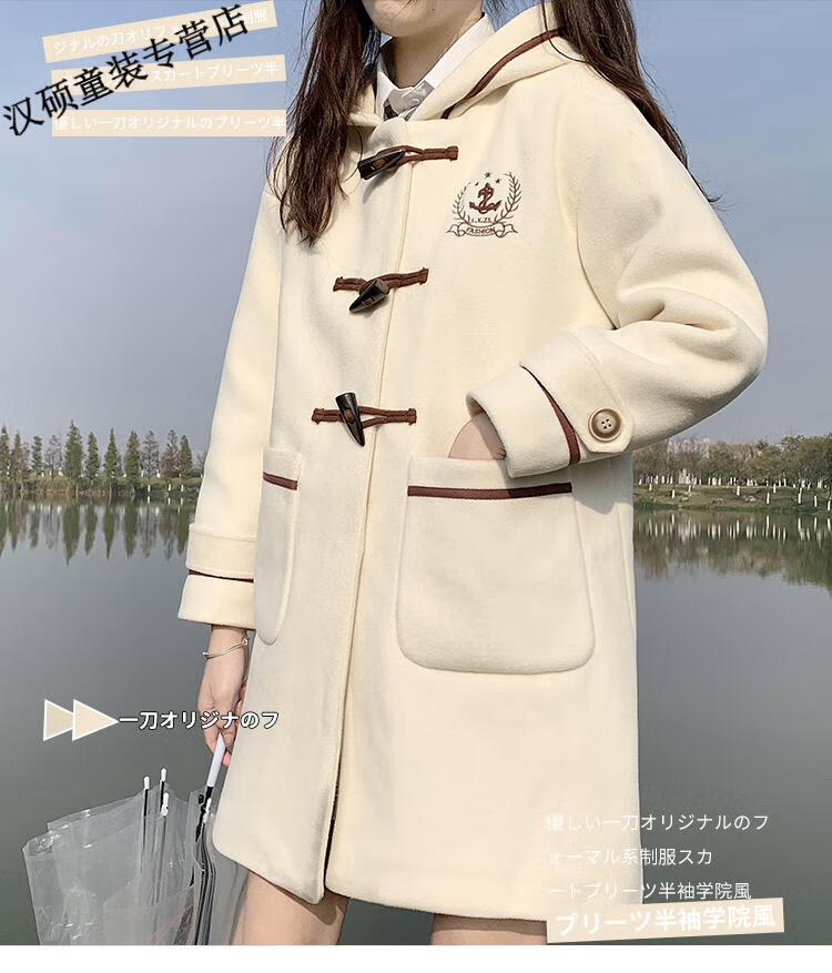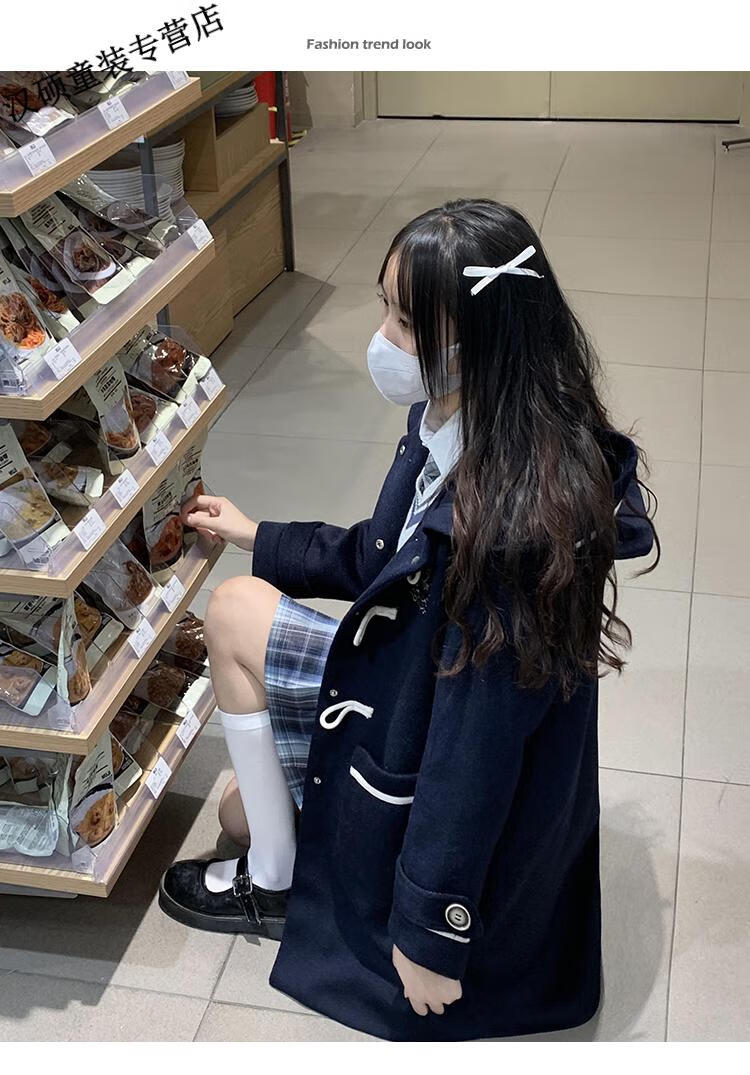 迪士尼(Disney)女大童学院风毛呢外套加棉加厚12-15岁高初中学生牛角扣呢子大衣 杏色 S码建议70-90斤