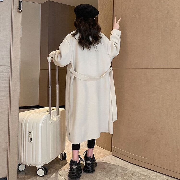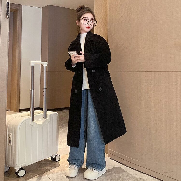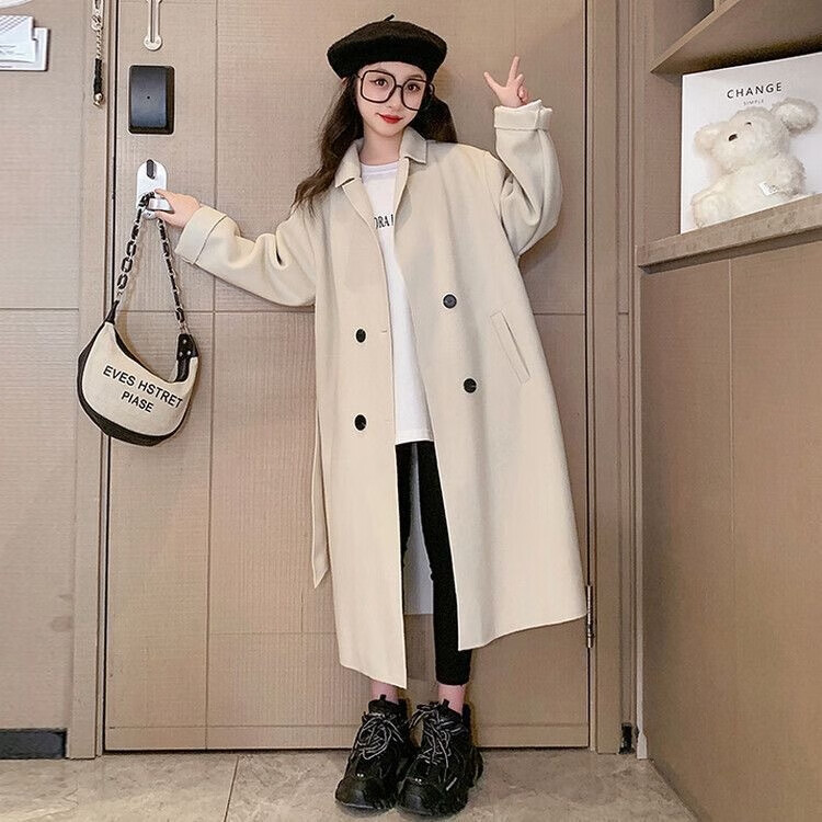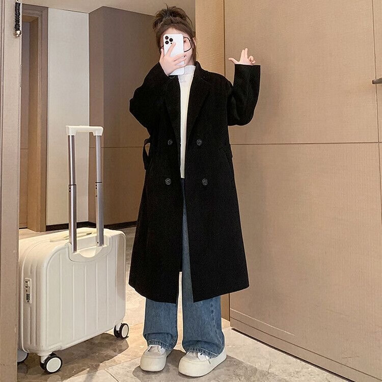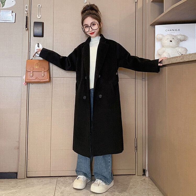 Rui Menghua Autumn and Winter 2025 Girls' New Woolen Coat Girls' Korean Style Large Children's Over-the-Knee Long Woolen Fashionable Jacket Black 150 Recommended height to be within 152cm