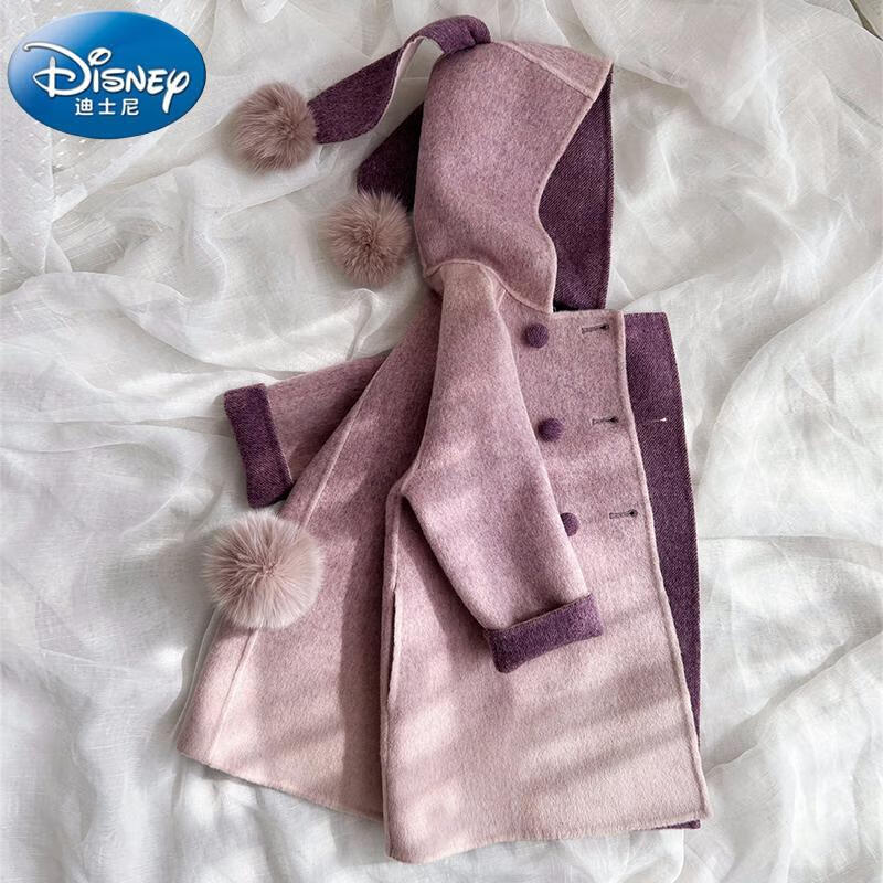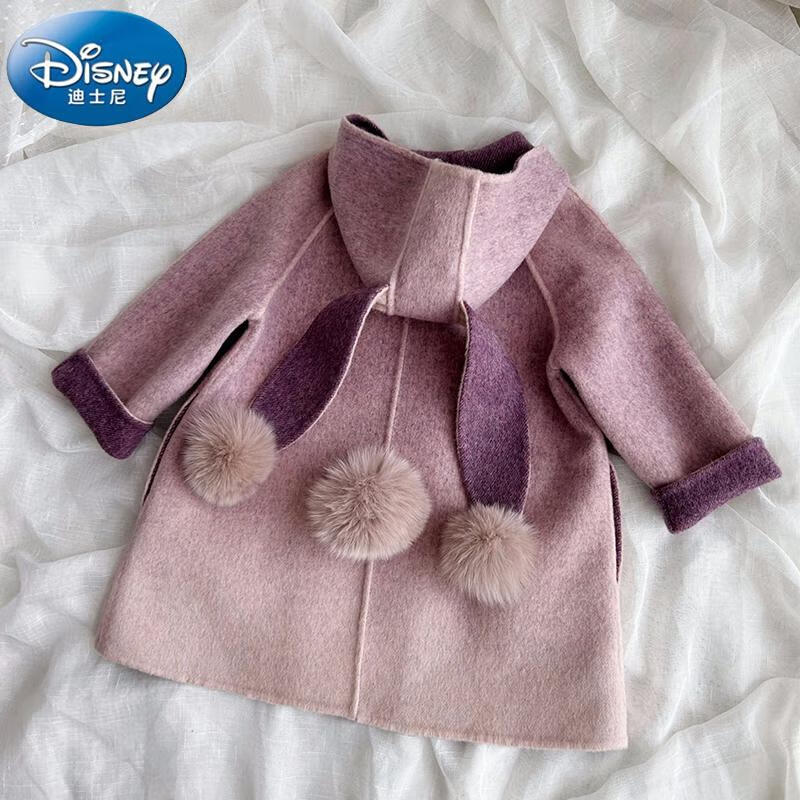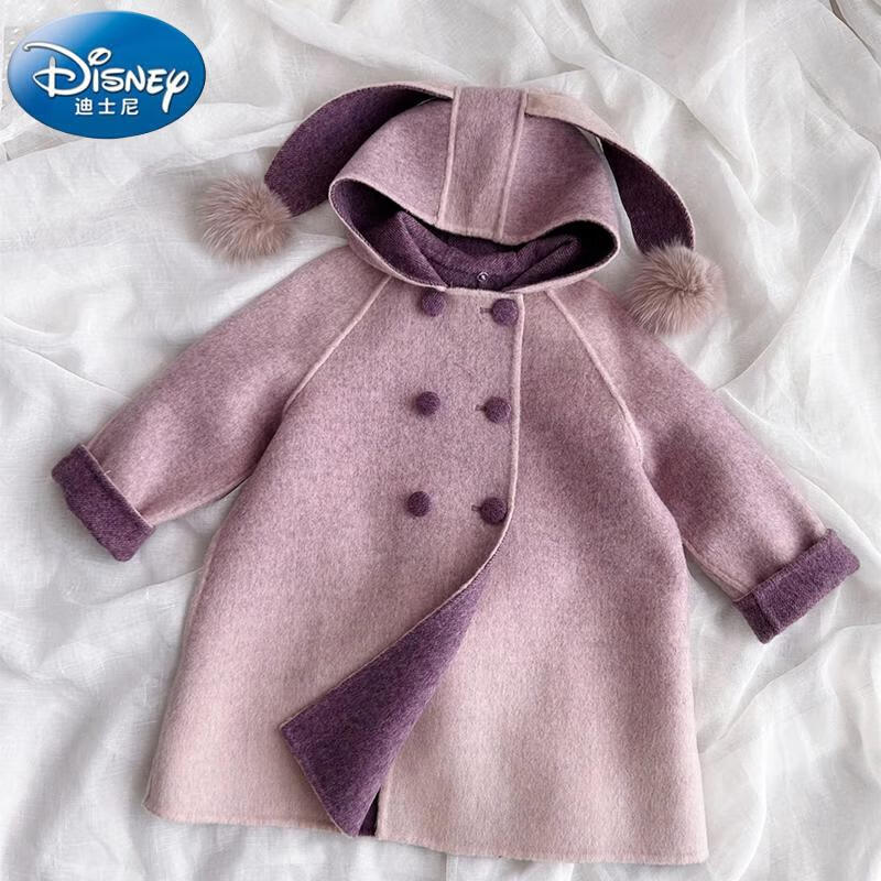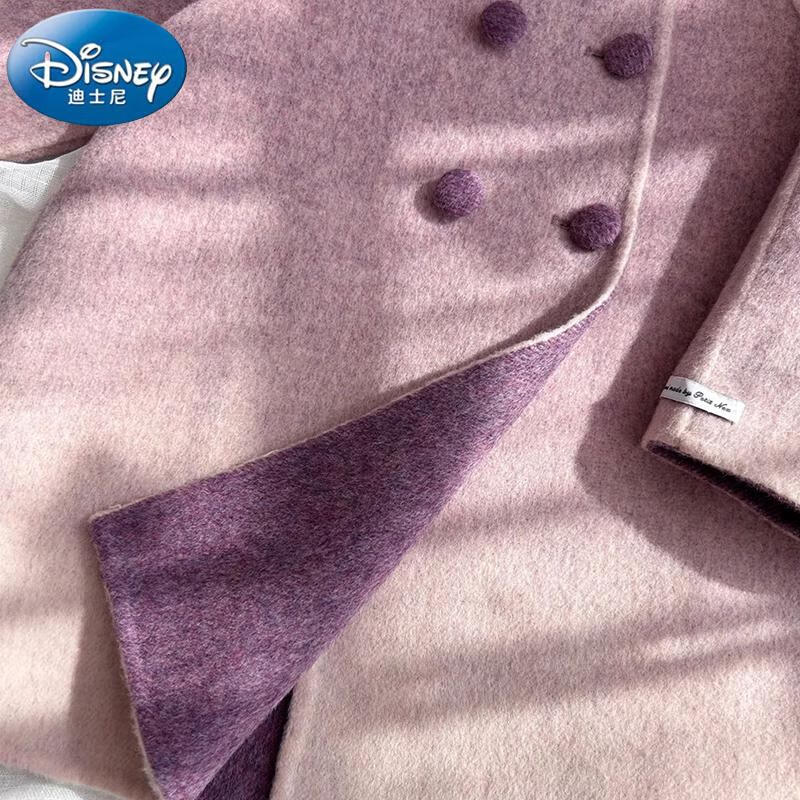 迪士尼女童加绒外套秋冬款2025新款洋气冬季小女孩呢子儿童加厚毛呢大衣 粉紫色【内里加绒 毛球都可拆卸 100cm