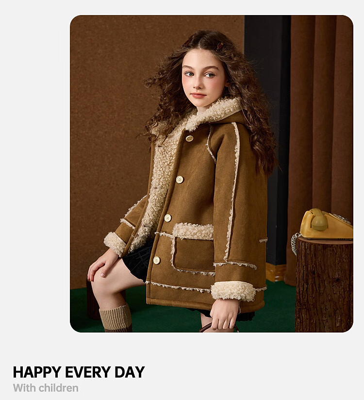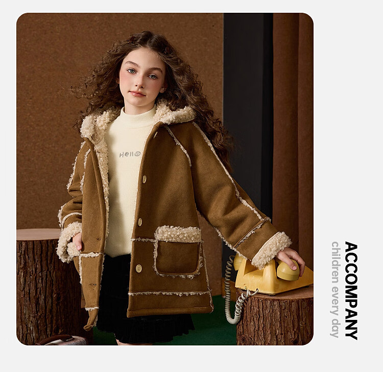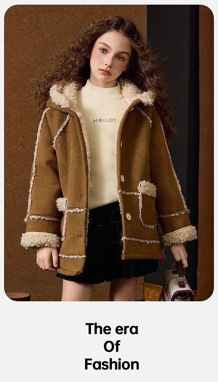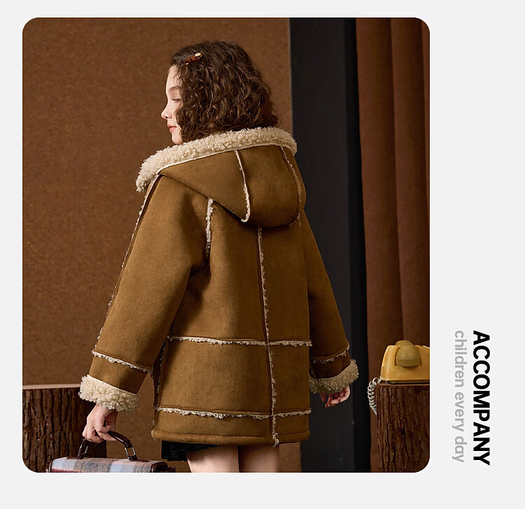 ASK JUNIOR Maillard children's coat girls autumn and winter new arrival medium and large children's hooded fleece jacket belt buttoned coat children's clothing khaki 170