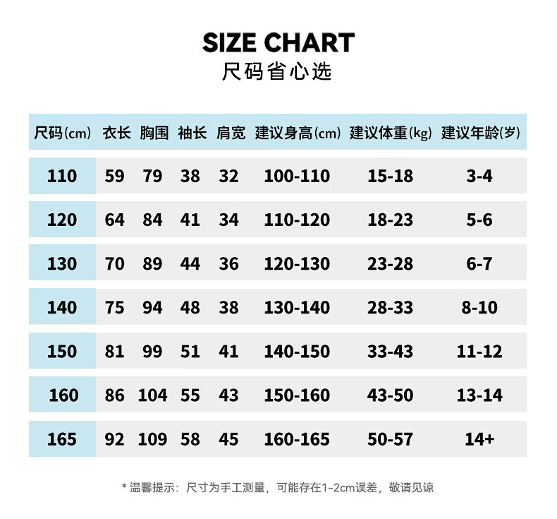China (cm) 165 / 88-90 170 / 96-98 175 / 108-110 180 / 118-122 185 / 126-130