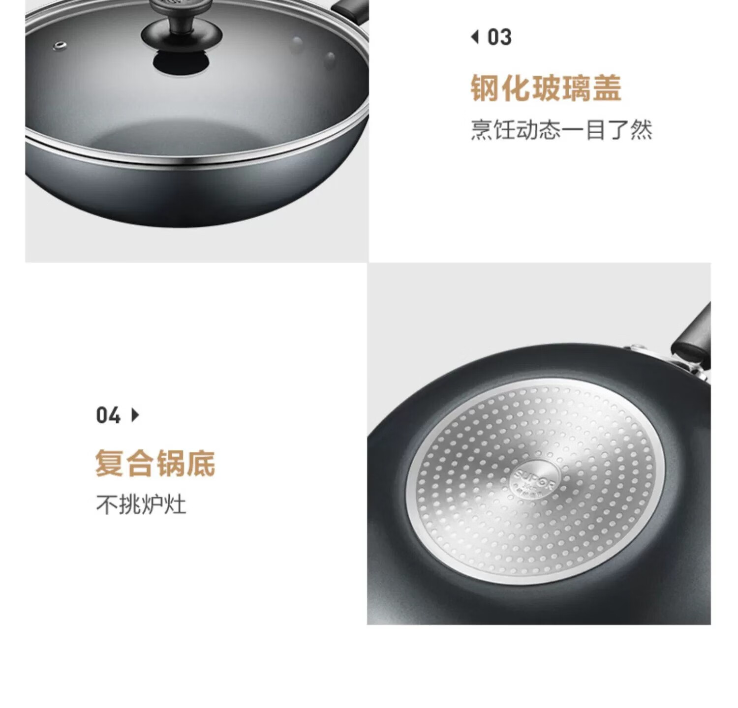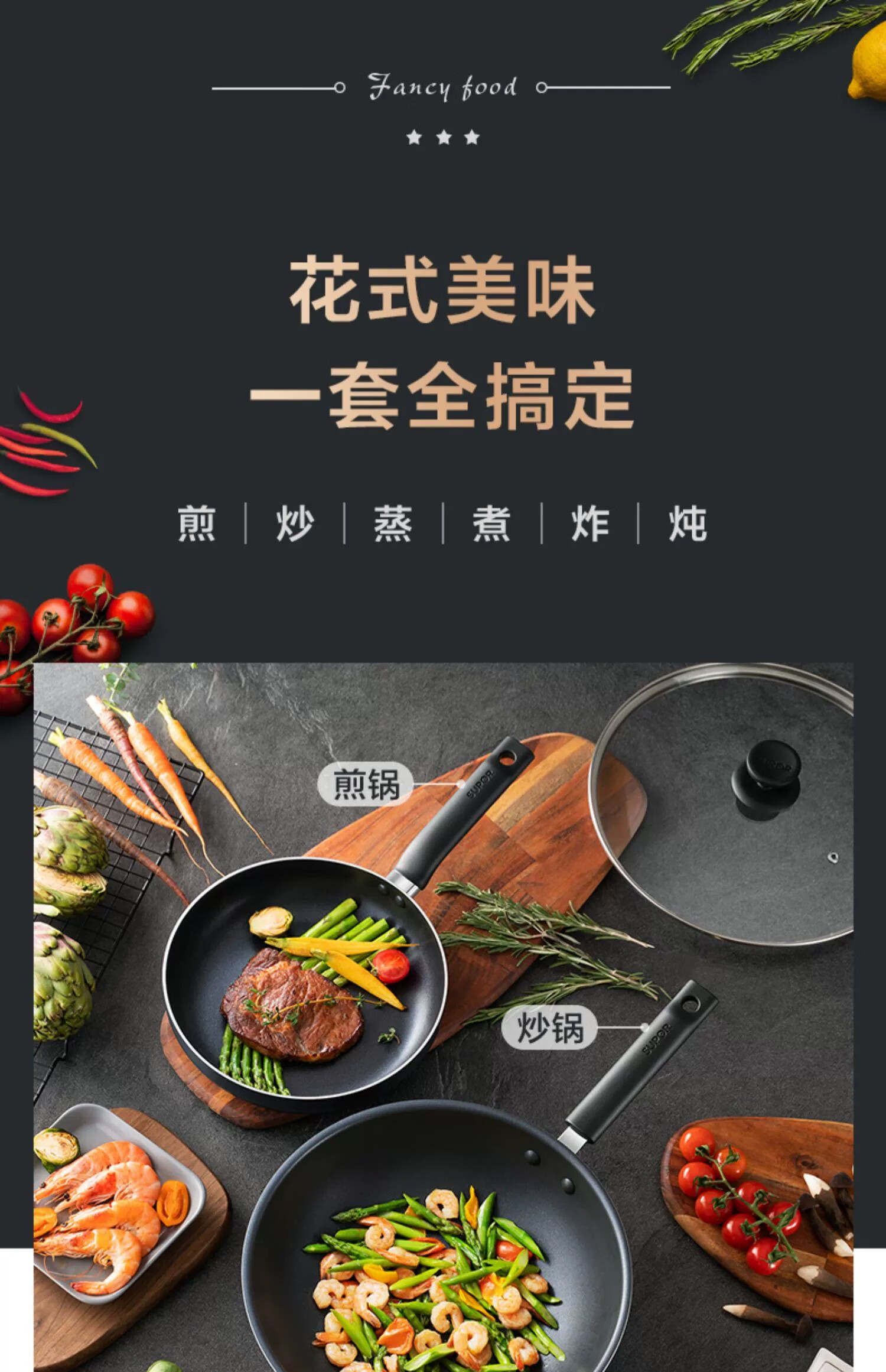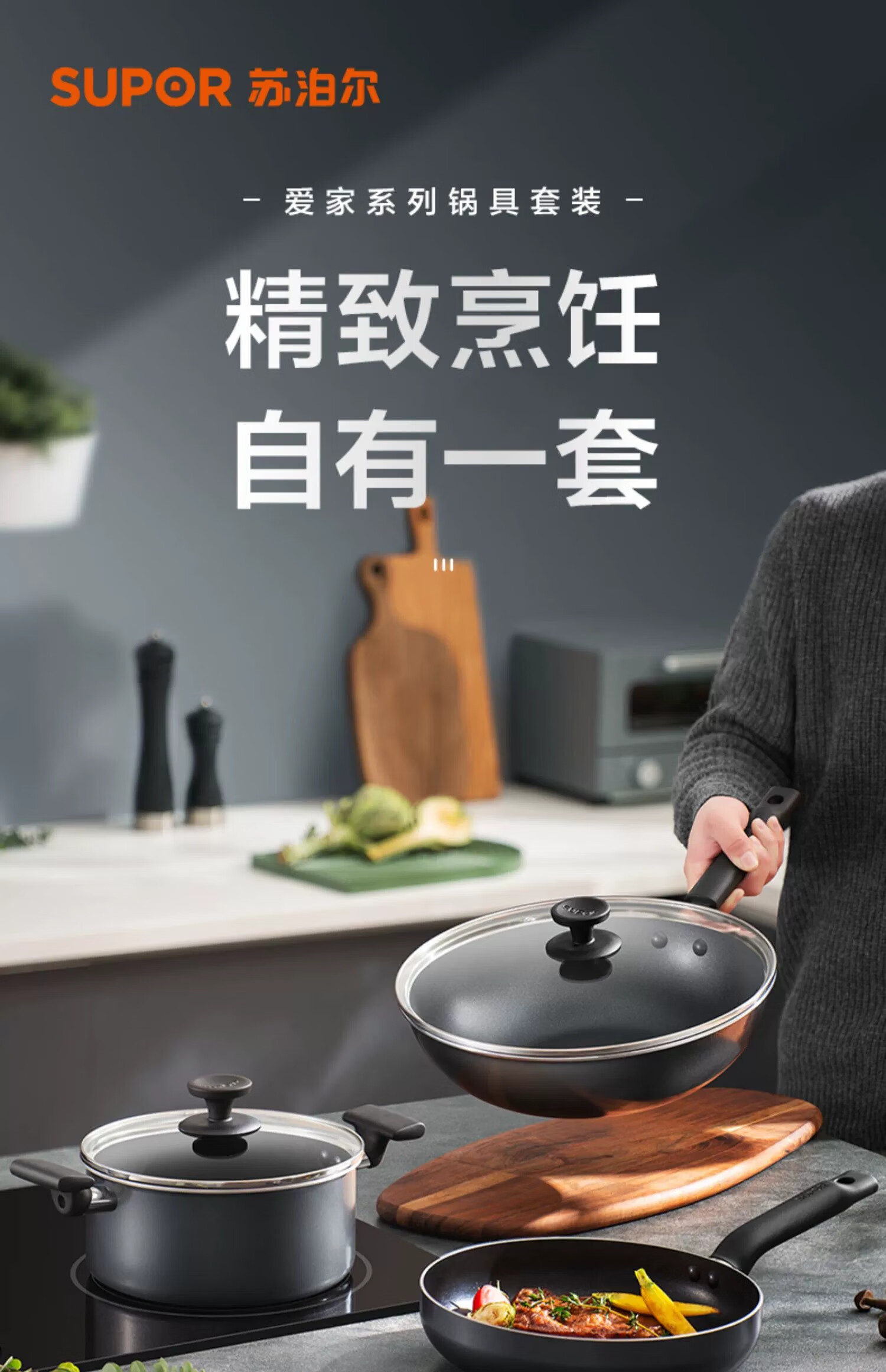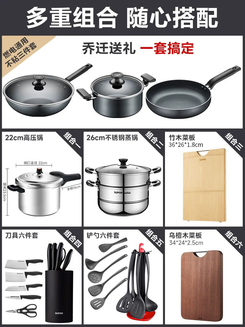 SUPOR non-stick pan, wok, complete set of kitchen utensils and pots, gas induction cooker, frying pan, soup pot, steamer, wok + frying pan + soup pot + steamer 4-piece set