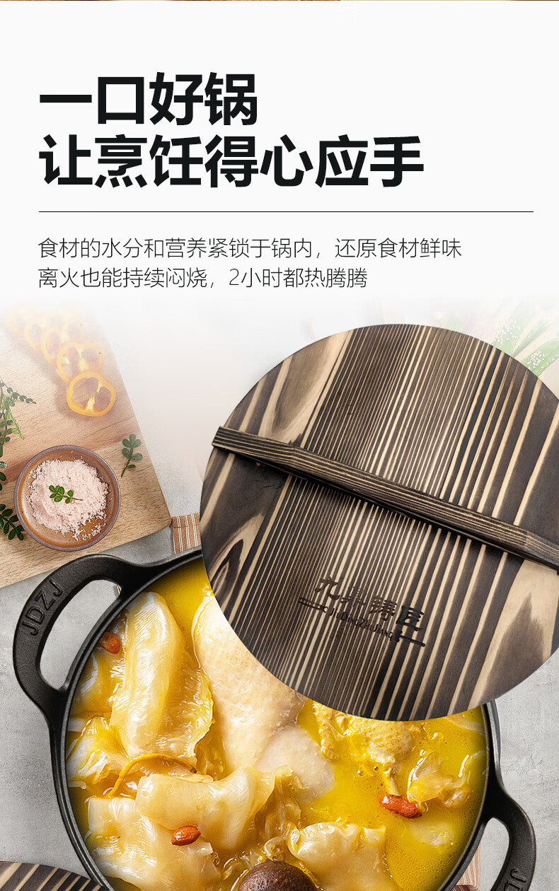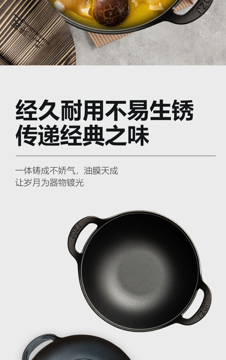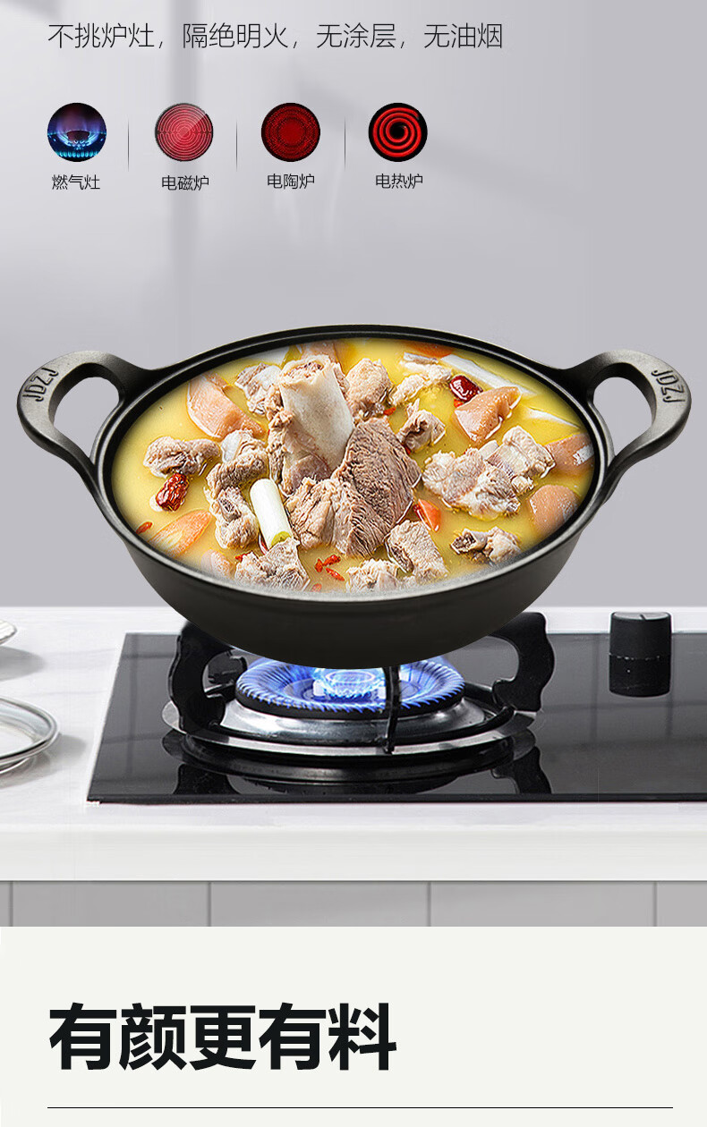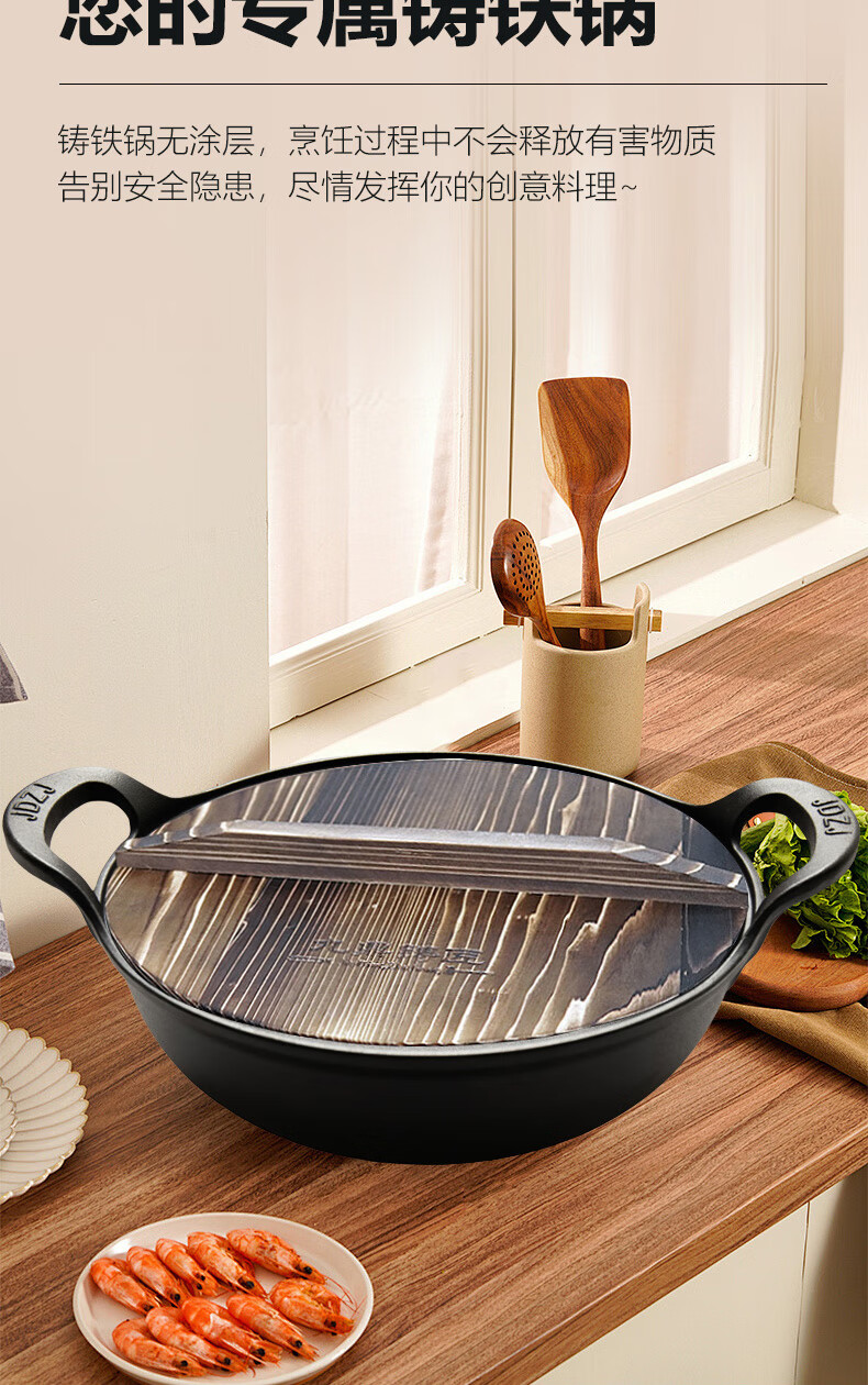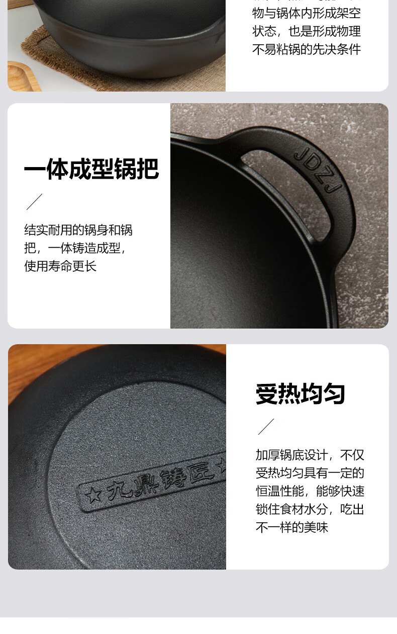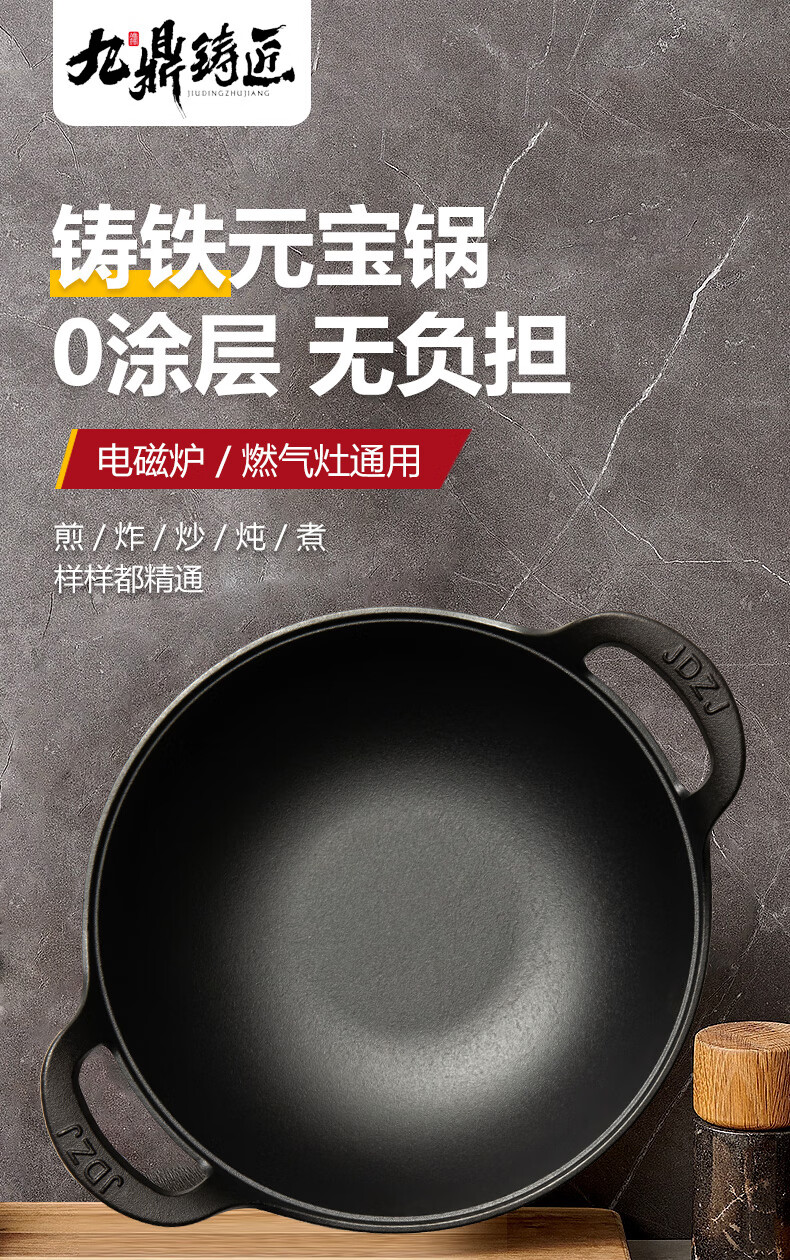 Jiuding Zhujiang cast iron ingot pot double-ear stew pot wok is not easy to stick to the pot uncoated old-fashioned multi-functional flat bottom pig iron pot flagship upgraded version 34cm - suitable for 4-6 people
