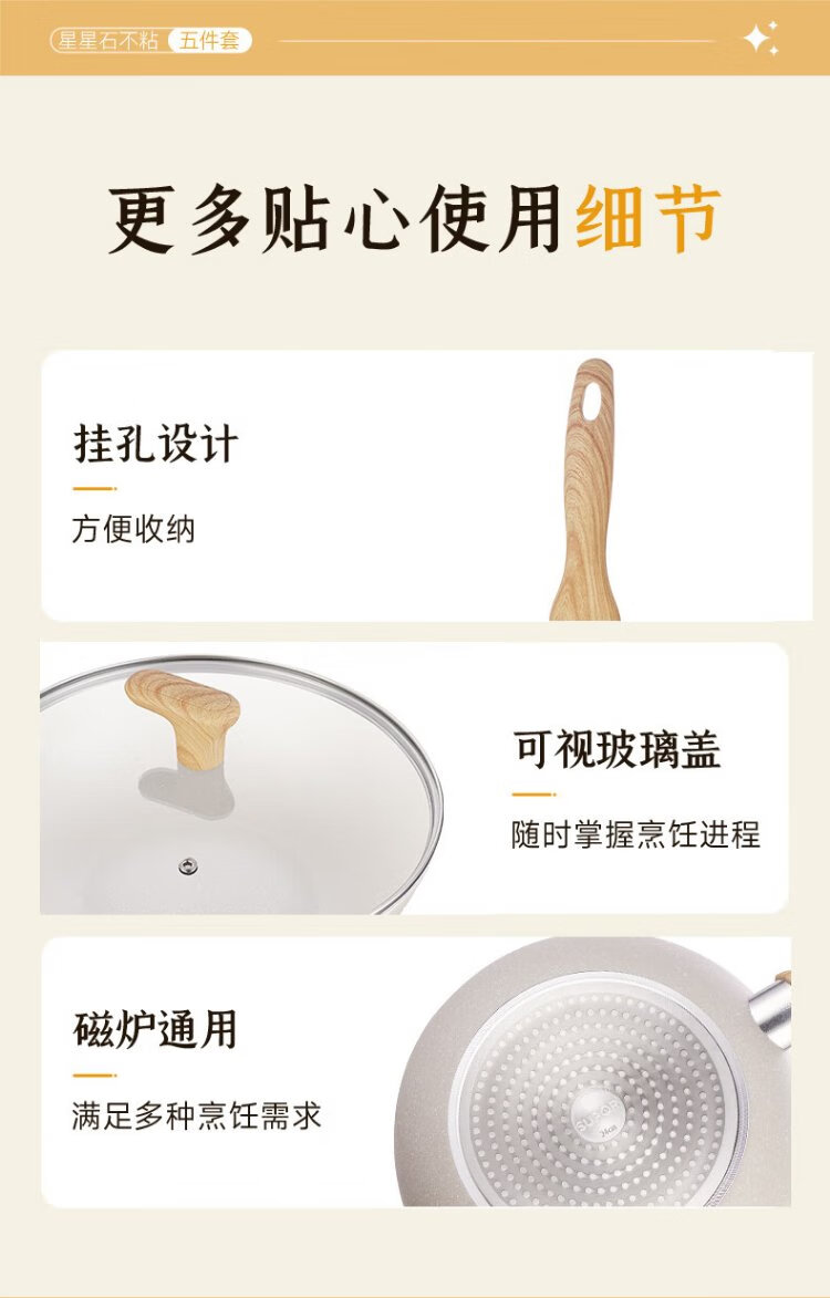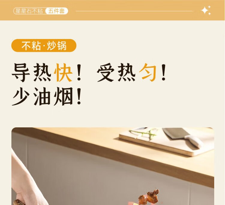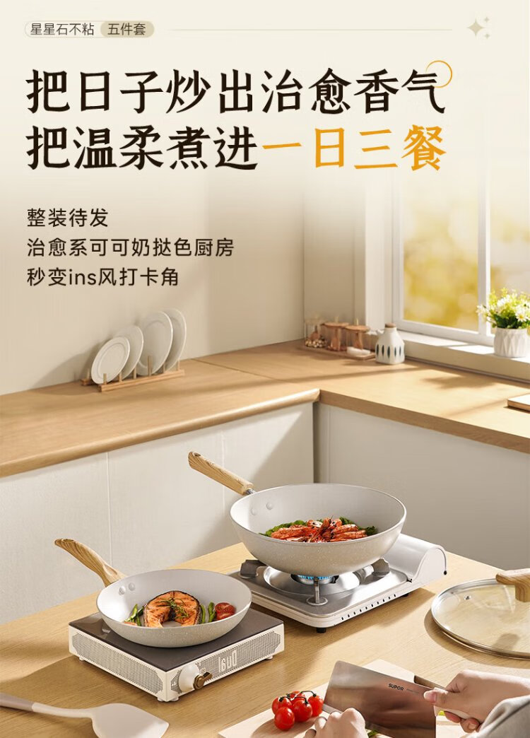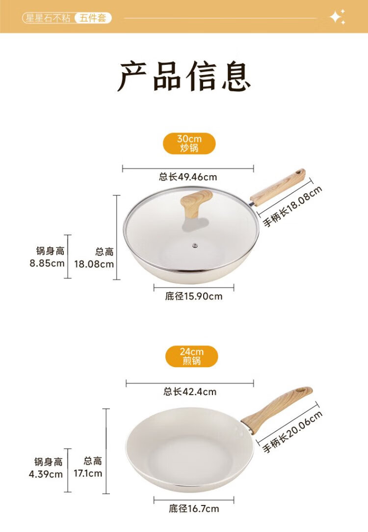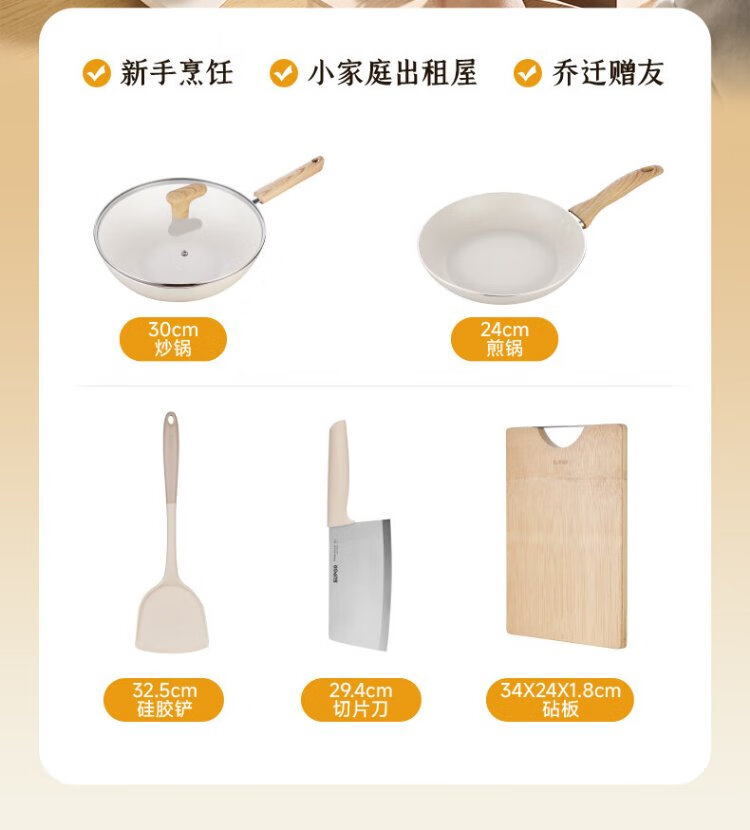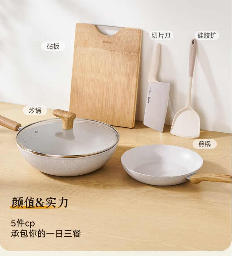 SUPOR pot set, non-stick pot, wok, frying pan, knife, plate and spatula, five-piece set, home kitchen combination set, wok + frying pan + knife + plate + spatula, 5-piece set
