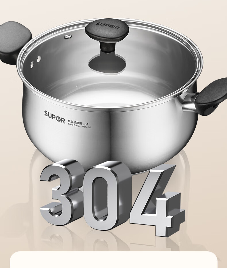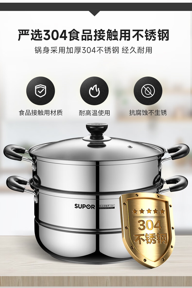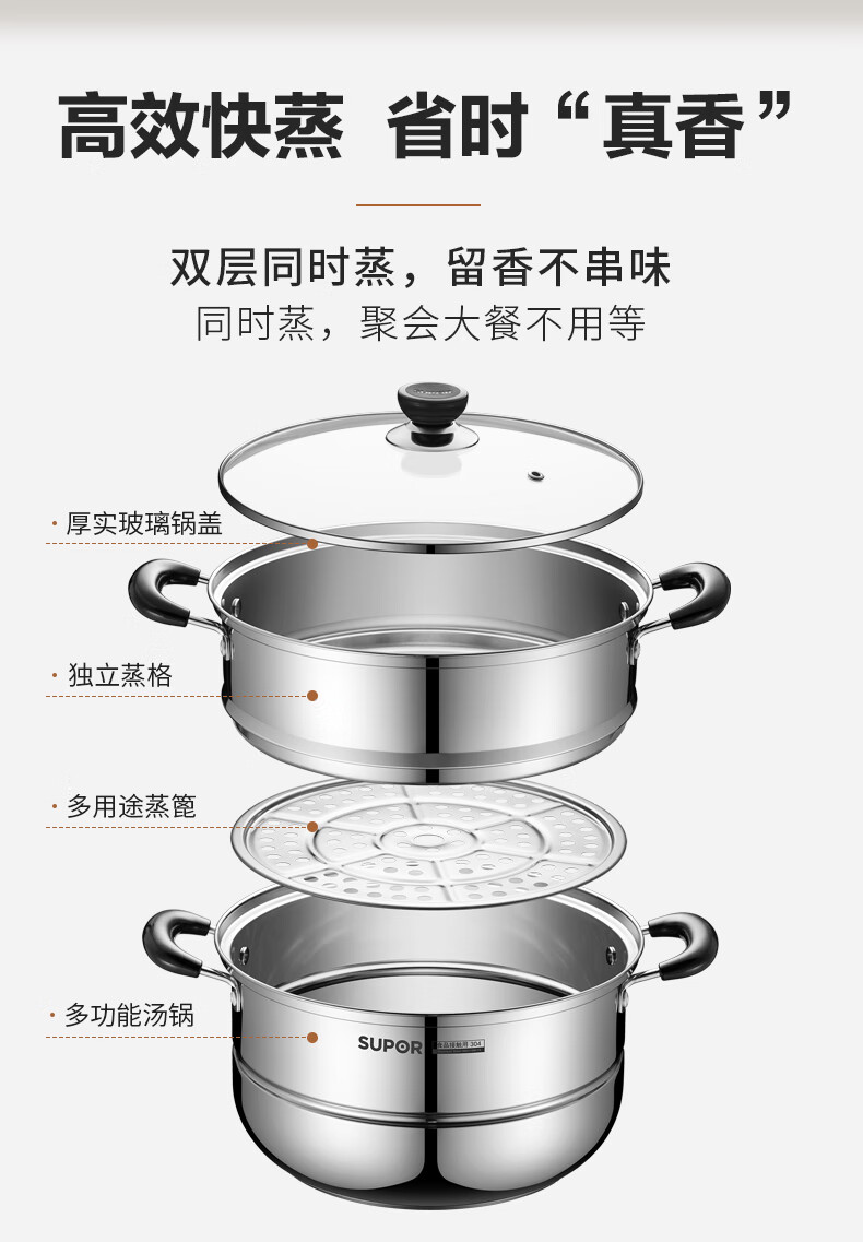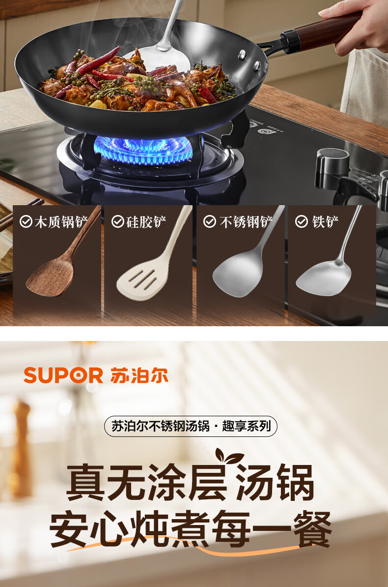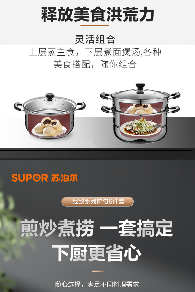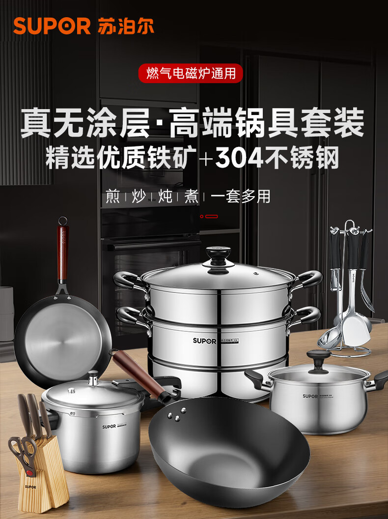 SUPOR uncoated iron pot wok frying pan set frying pan 304 stainless steel stew steamer soup pot pressure cooker stir-fry + fry + soup + steam + spatula + knife 6-piece set