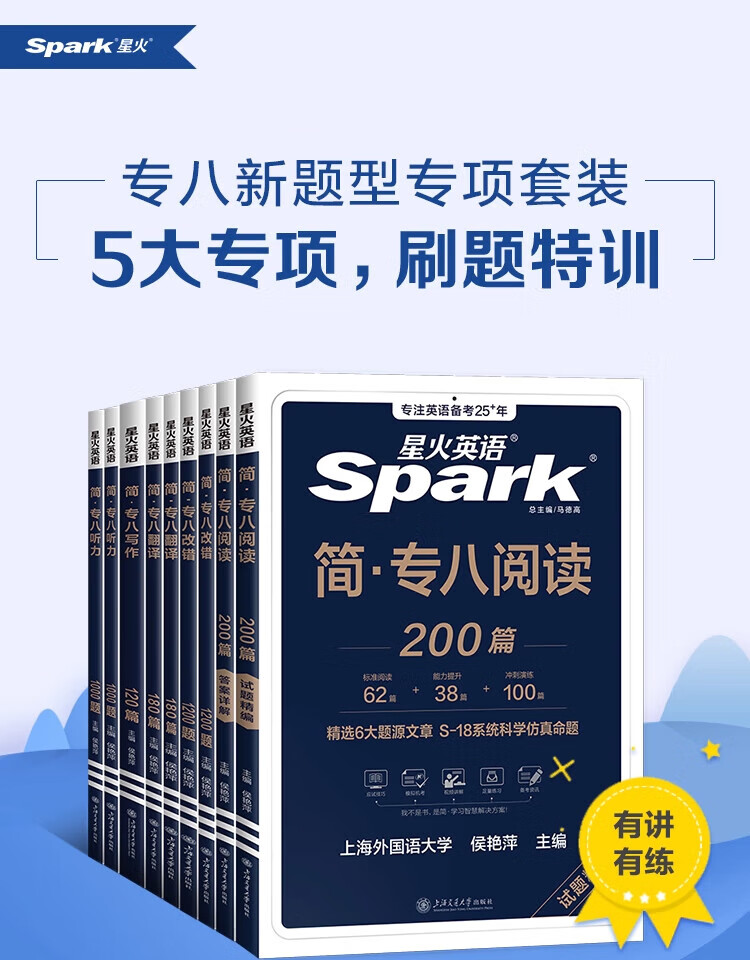 Xinghuo Special 8 echter Prüfungsvorbereitungstest 2026 Englisch-Hauptfach achte Ebene Lese- und Hörfehlerkorrektur Übersetzung und Schreiben Spezialtraining vollständiger Satz an Informationsvokabular Wortbuch tem8 Englisch Spezialstufe 8 Lese- und Hörverständnis echte Testübungen Geisteswissenschaften 2026 Spark Special 8 Lesen 200 Artikel heiße Empfehlung