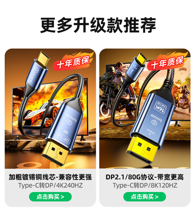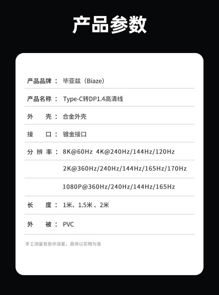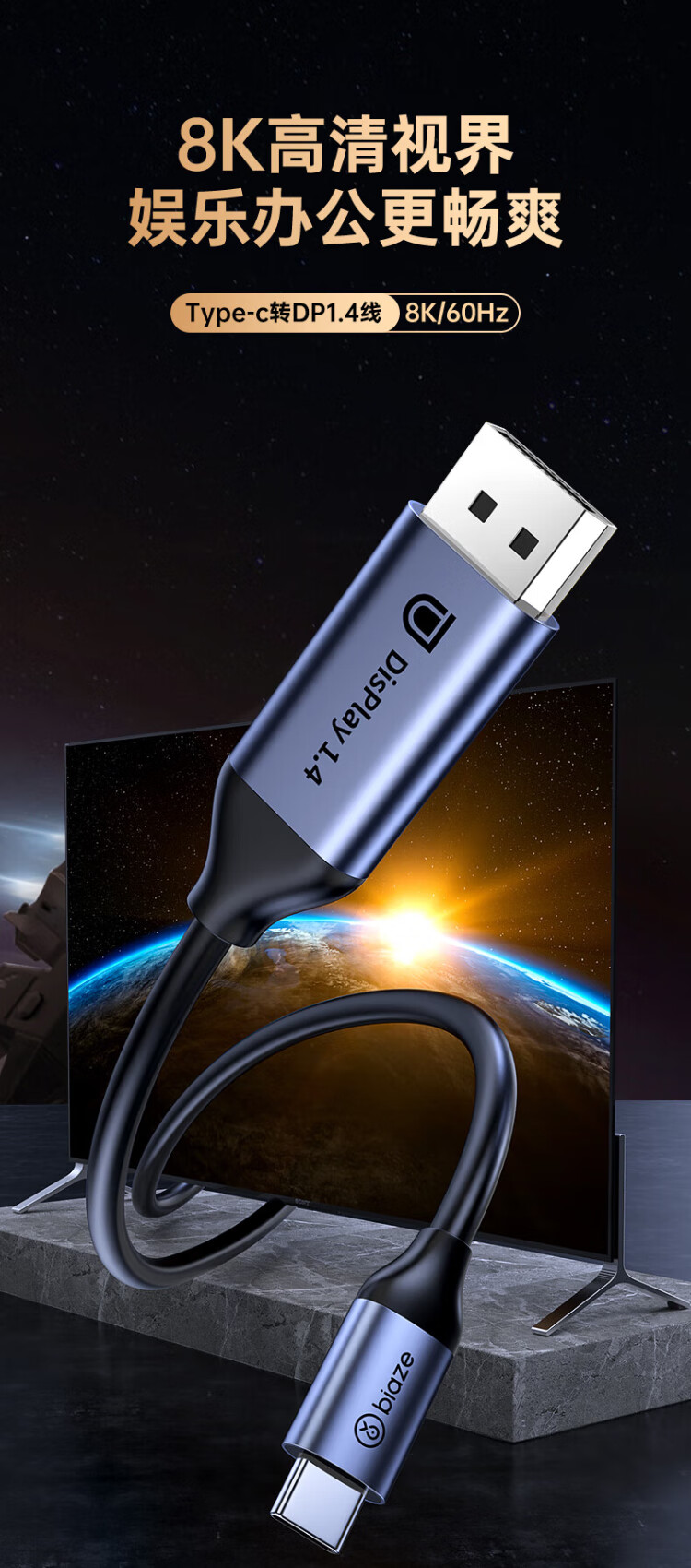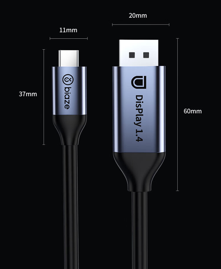 毕亚兹 Type-C转DP1.4线 雷电4/5转接头USB-C转换器扩拓展8K60/4K/240投屏笔记本电脑手机iPad平板 1米