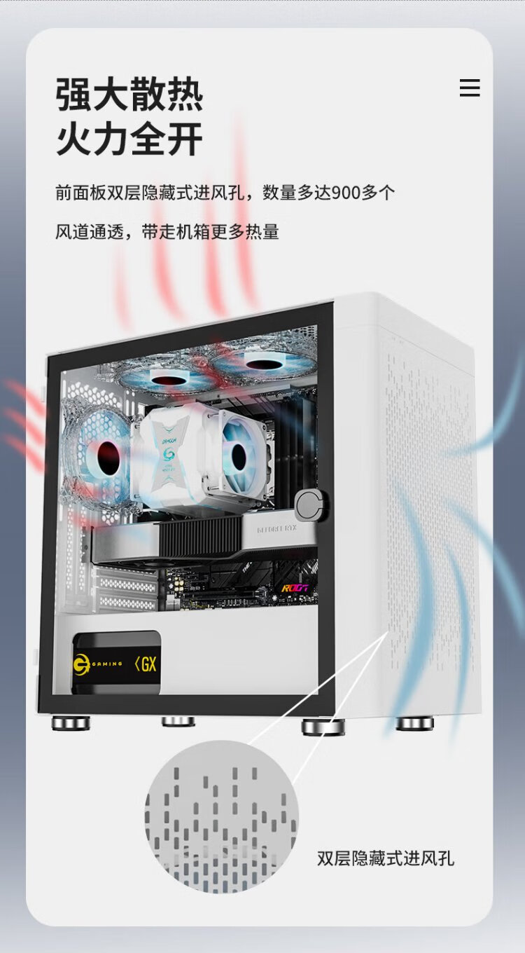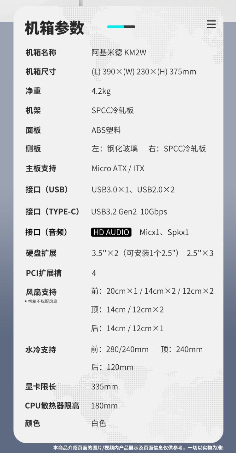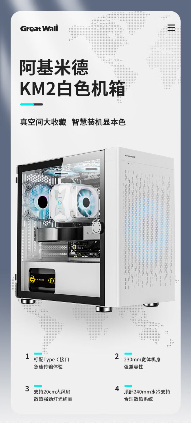长城(Great Wall)阿基米德2白电脑机箱(Type-C 3.2/20CM风扇位/MATX主板/240水冷位/玻璃侧透/宽体/5080)