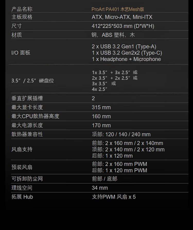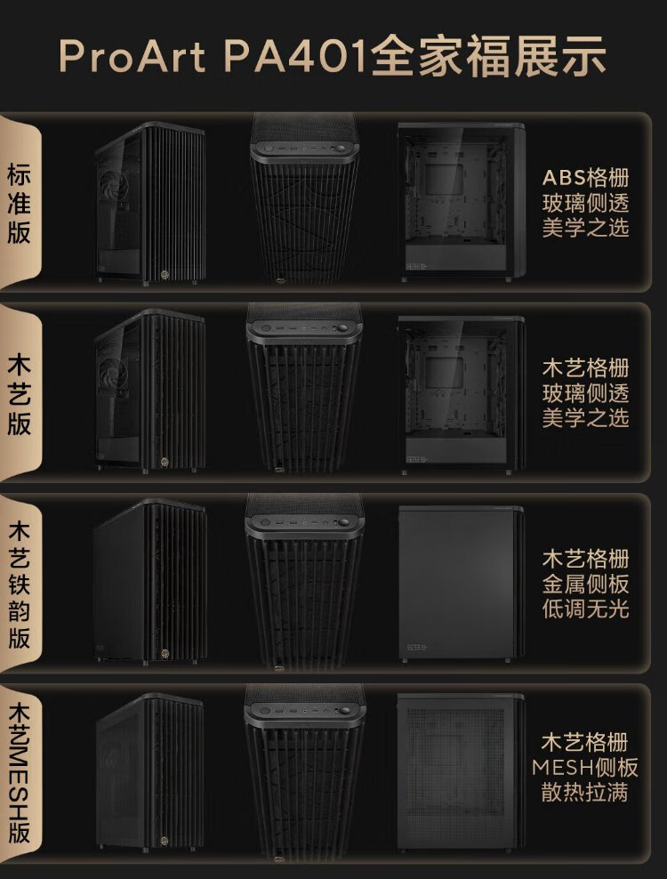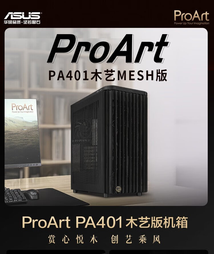 华硕ProArt创艺国度PA401木艺MESH版机箱 木艺前进气格栅/免工具拆装/电源按键锁/PWM一键设置