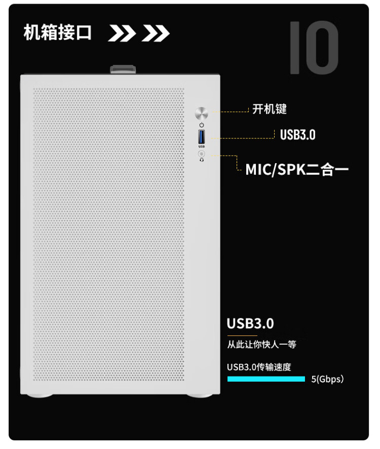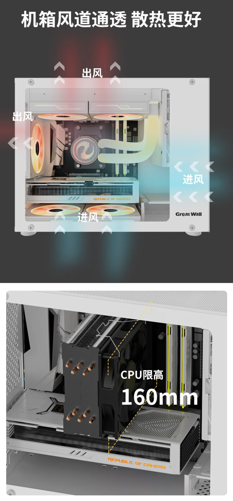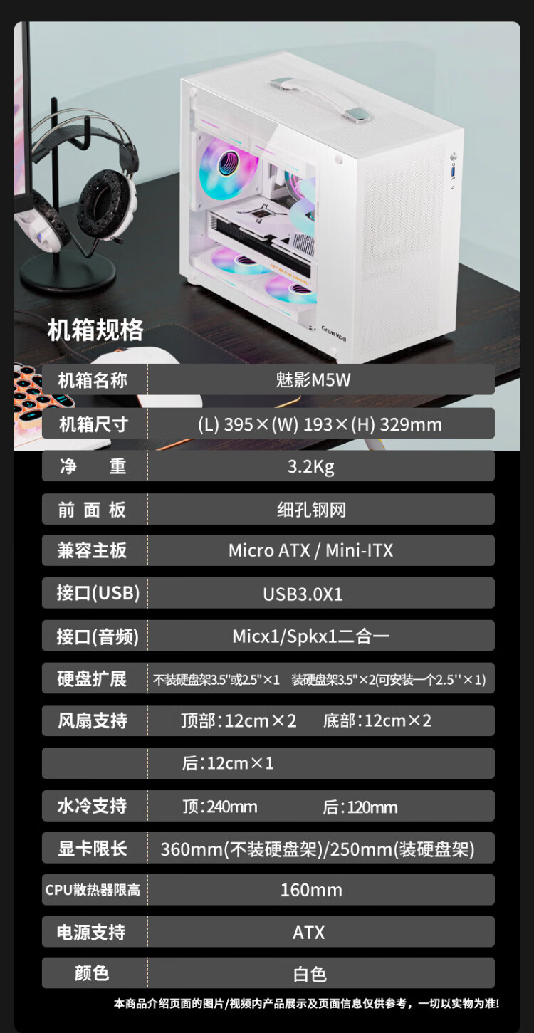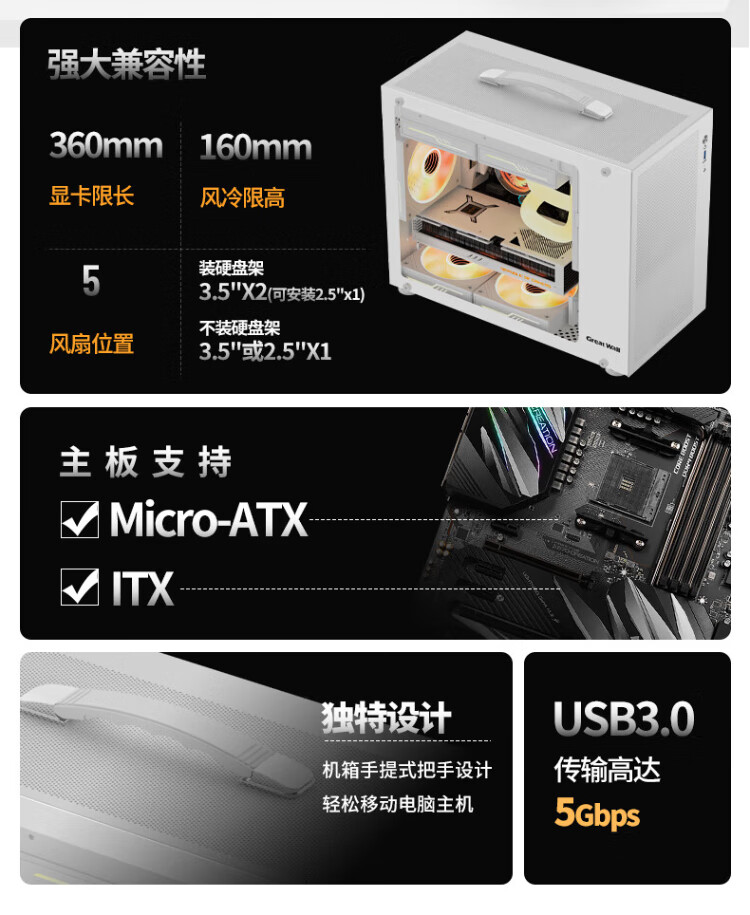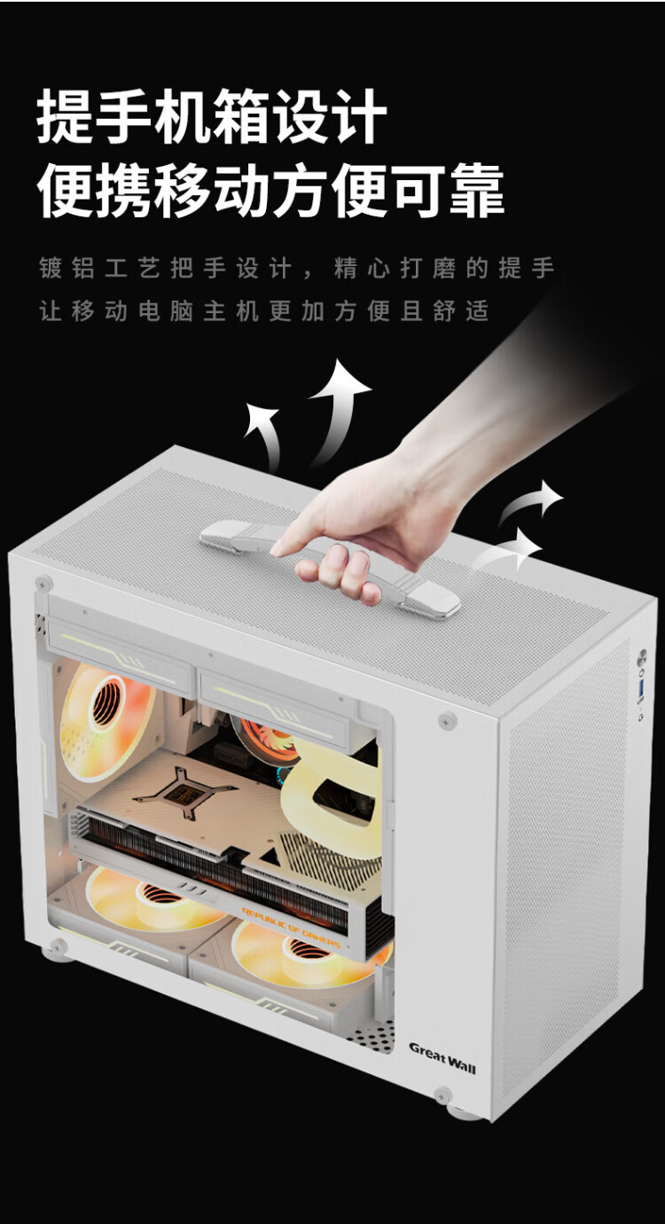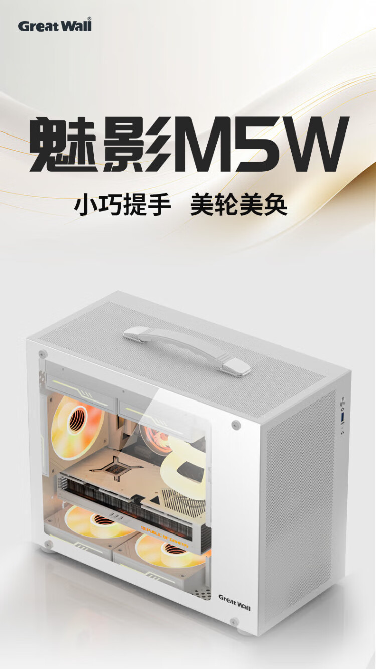 长城(Great Wall)魅影M5W白色电脑机箱(镀铝提手/金属面板/玻璃侧板/MATX主板/5风扇位/USB3.0/240水冷/5080显卡)