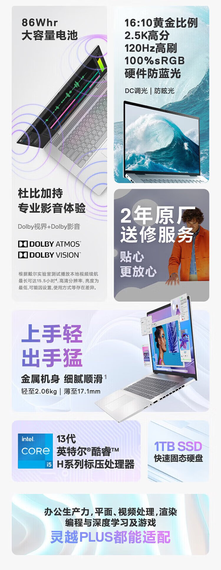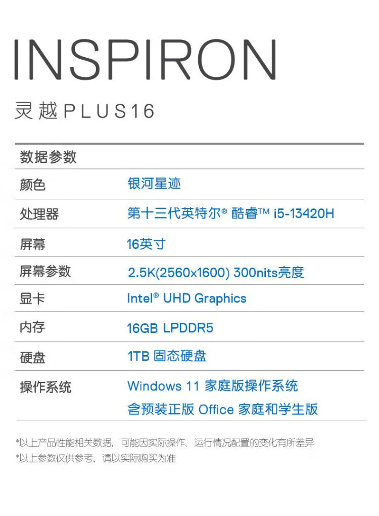 Dell (DELL) Inspiron 16Plus 16-Zoll-Großbild-Kreativ-Notebook 20 % Zuschuss für Designer, Studenten, Bürobearbeitung, Spielbearbeitung und Grafik, dünner und leichter Laptop der 13. Generation, Standarddruck i5-13420H, 2,5K-Augenschutzbildschirm, silberner 16G-Speicher, 2 TB Hochgeschwindigkeits-Solid-State-Anpassung
