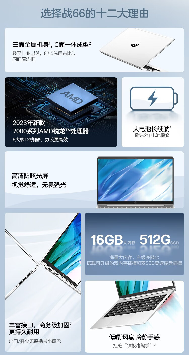 惠普(HP)战66六代 七代 八代AMD锐龙版商务办公轻薄笔记本学生游戏设计长续航AI高性能笔记本电脑定制 锐15 R7-7735U高清屏+指纹解锁 32G内存1T固态