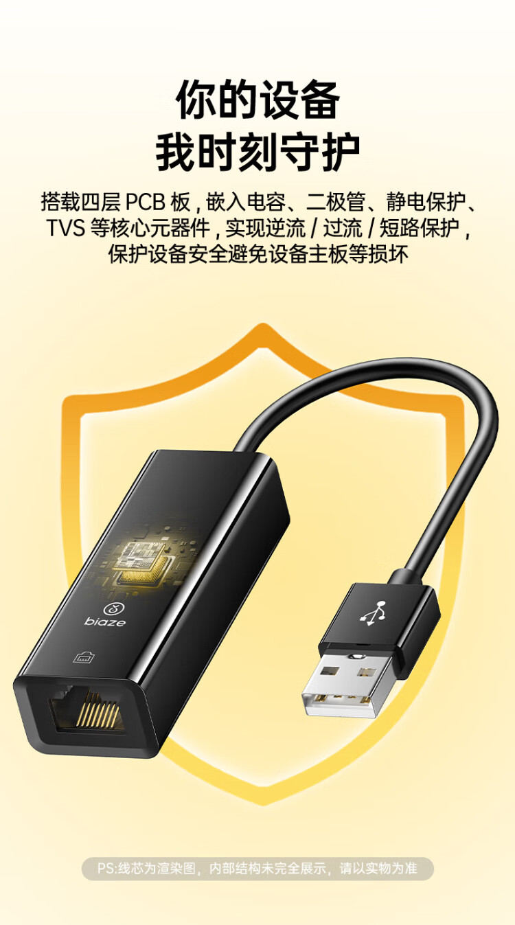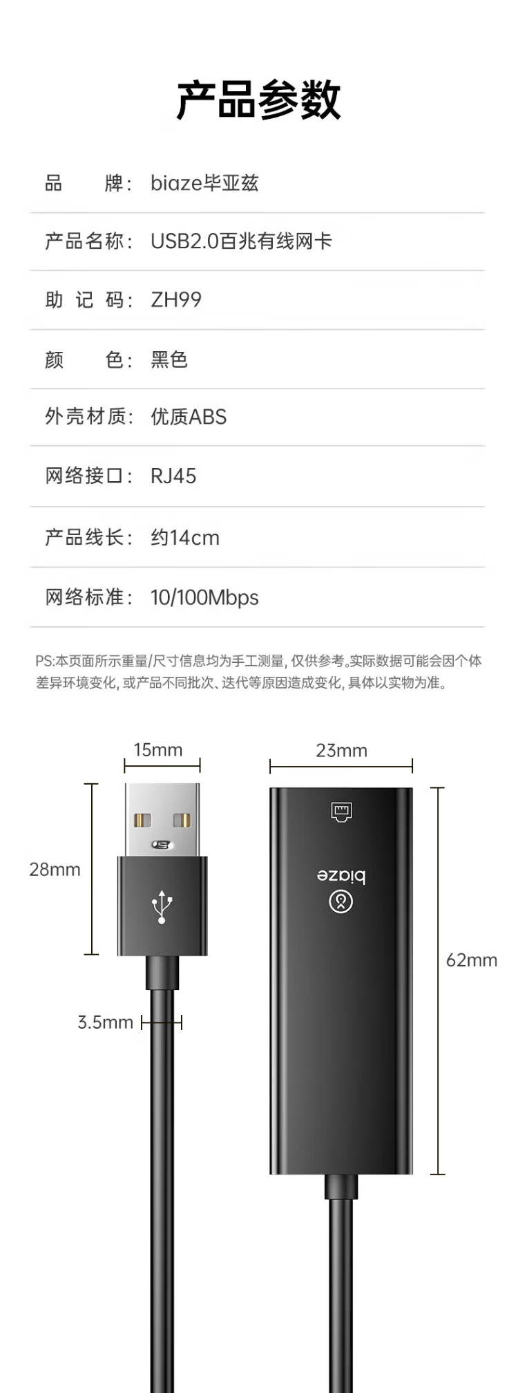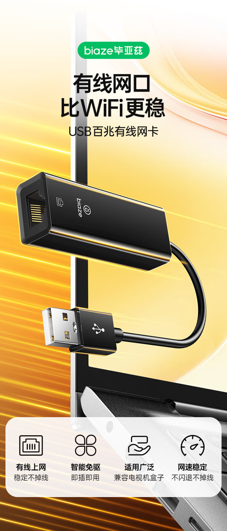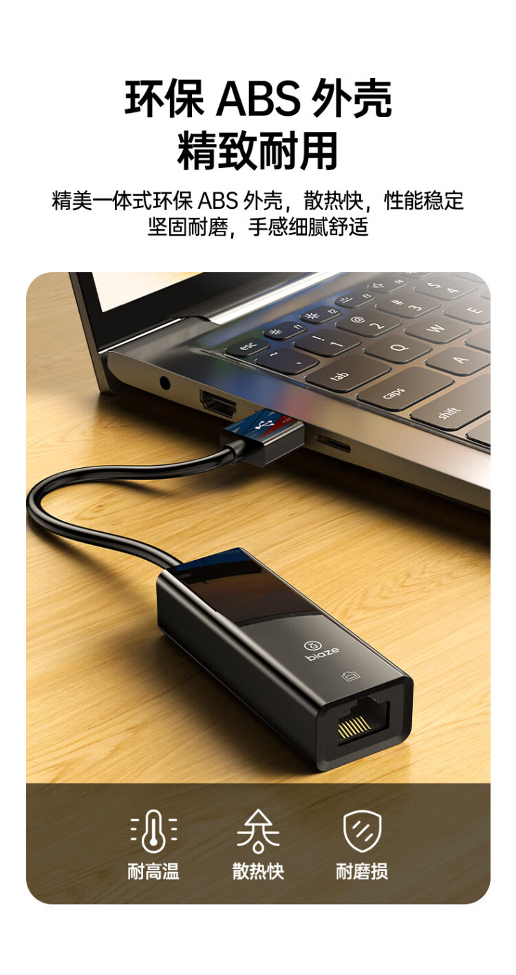 毕亚兹 USB转网口RJ45网线转换器 百兆有线网卡网线转接头苹果Mac华为笔记本电脑小米外接外置坞免驱动