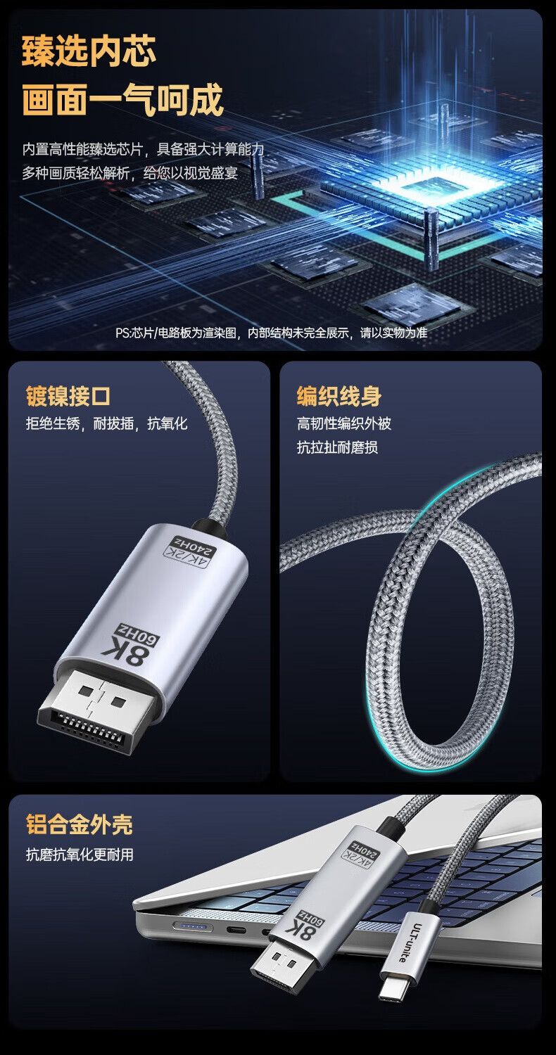 Кабель ULT-unite Type-C — DP1.4, совместимый с преобразователем Thunderbolt 4/5, адаптер HD USB-C, 8K60 Гц, подходит для ноутбуков Apple и Huawei, 8K, 60 Гц, C — DP1.4 — бюджетная модель, длина 1 метр
