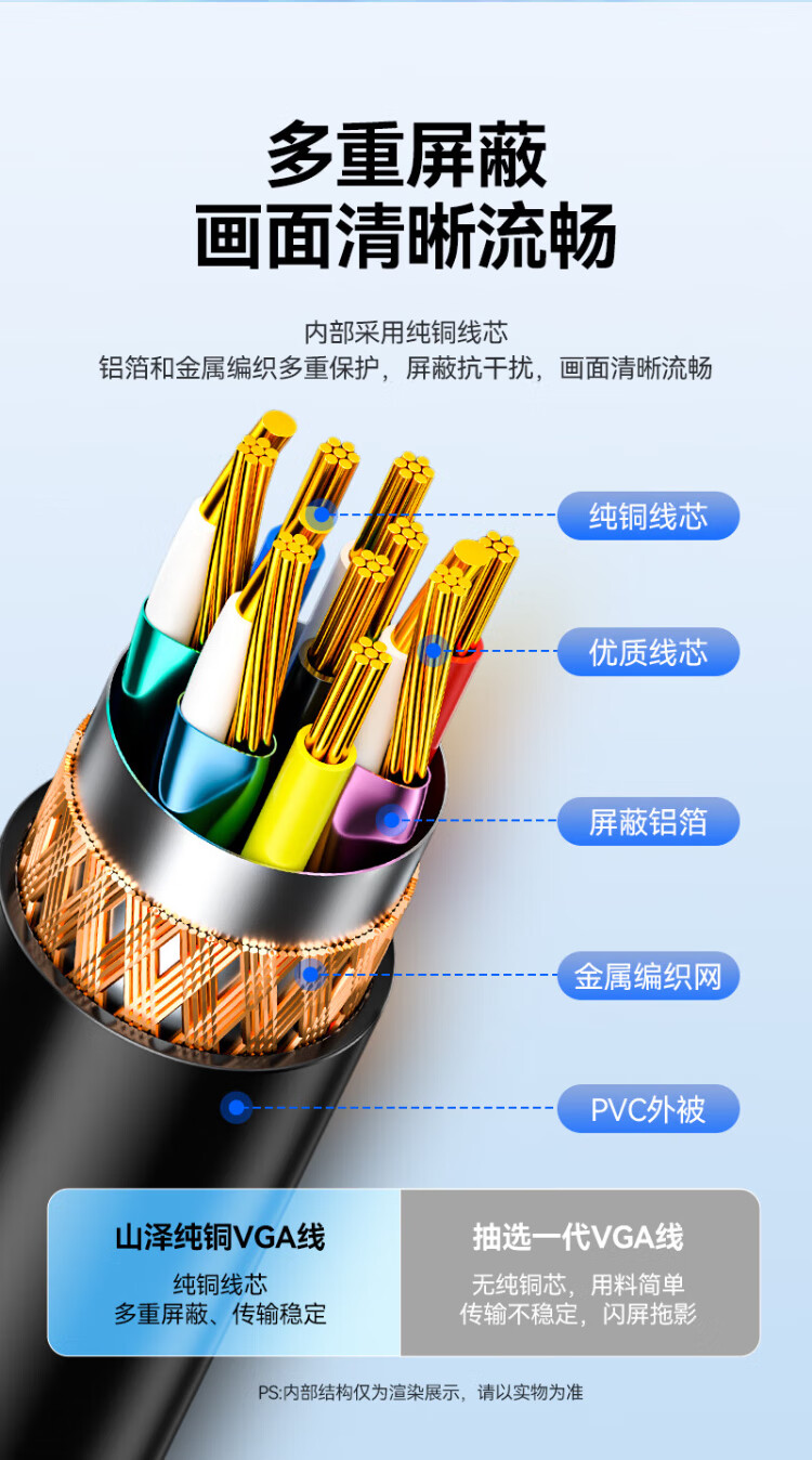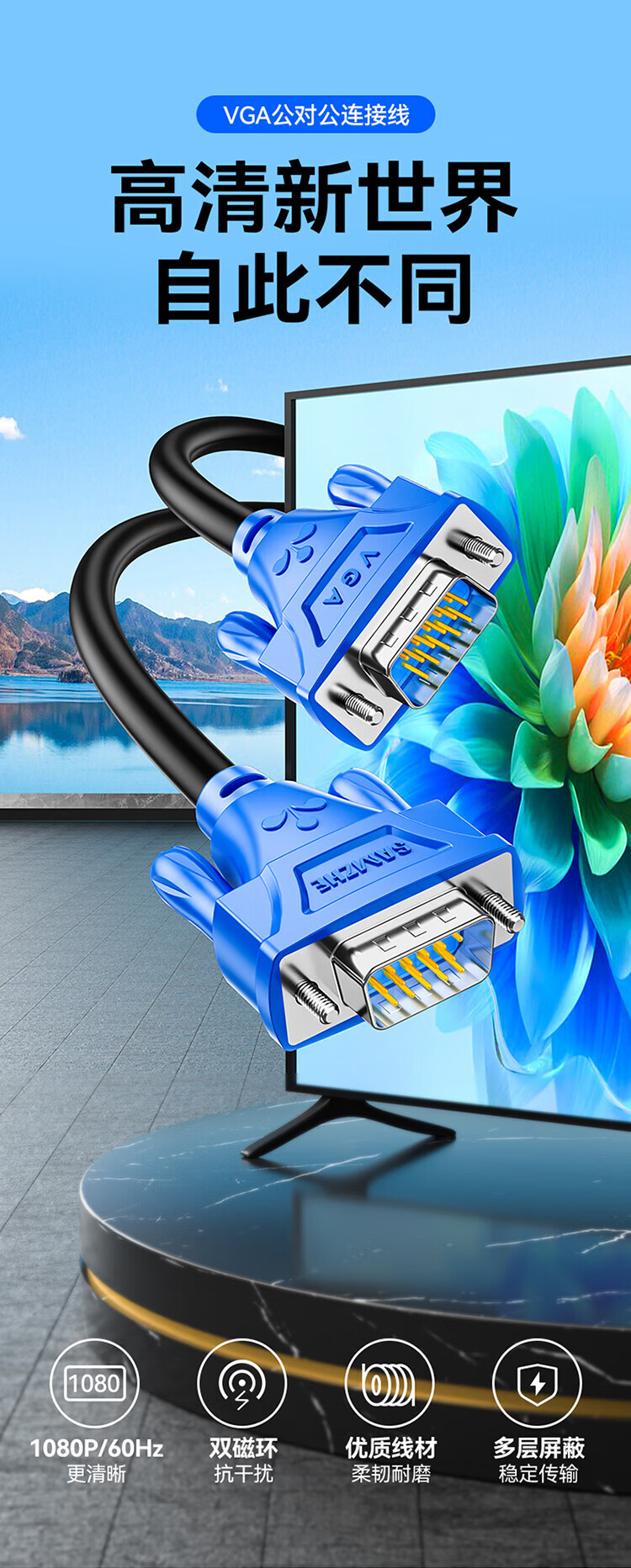 山泽VGA线 高清双磁环蓝头vga连接线 3+6铜芯电脑主机接投影仪显示器视频线数据信号线 1.5米 VM-1015