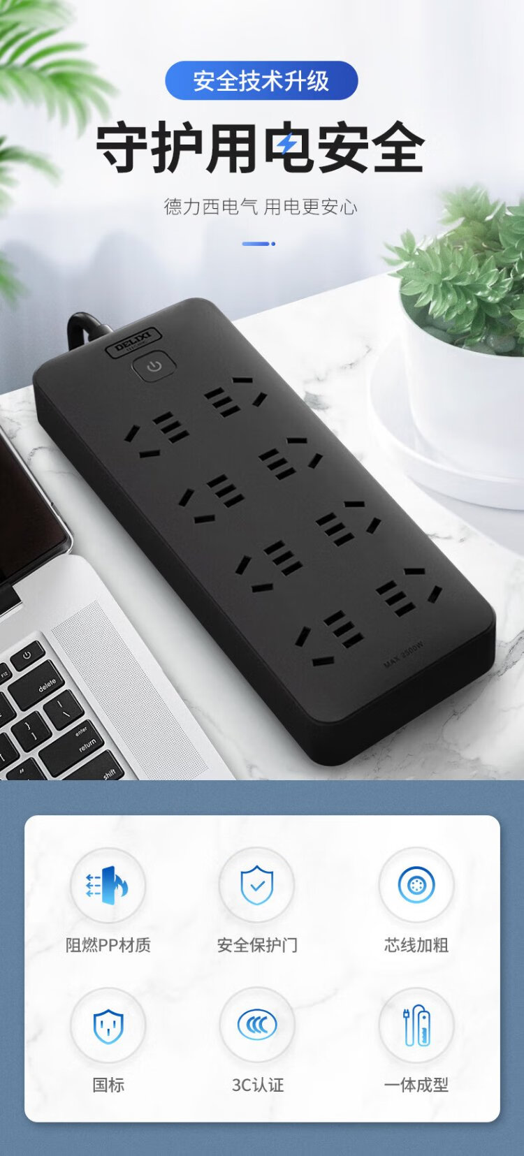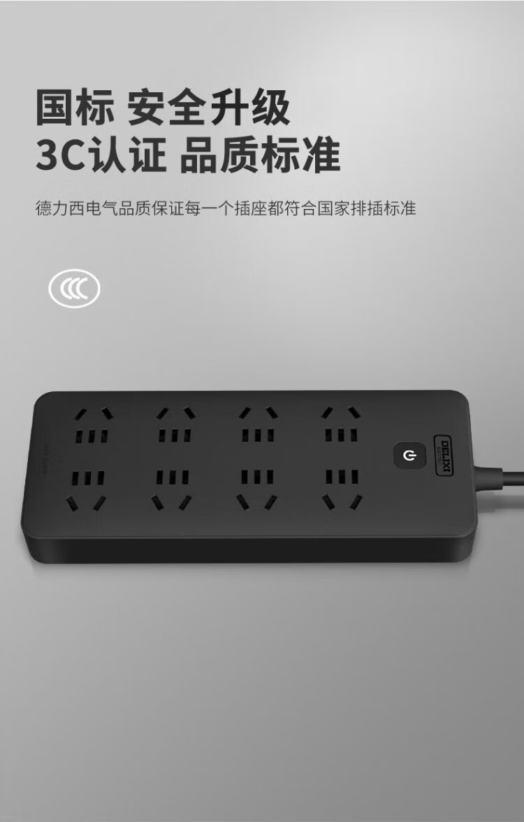 DELIXI national standard socket/socket board/socket strip/socket strip/pull line board/socket board/connection board 6-position combination master switch, total length 1.8 meters, black