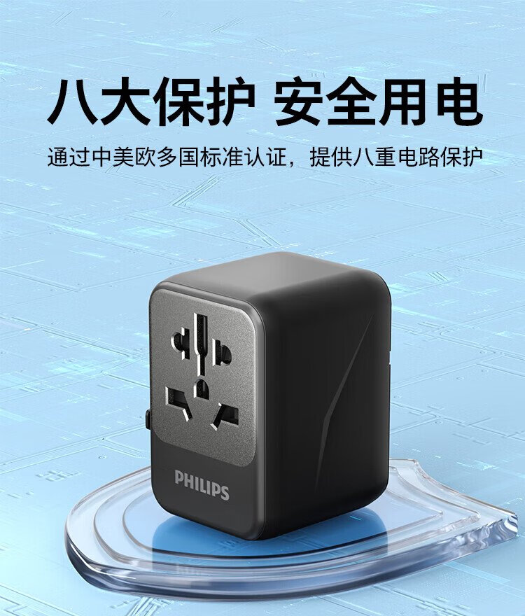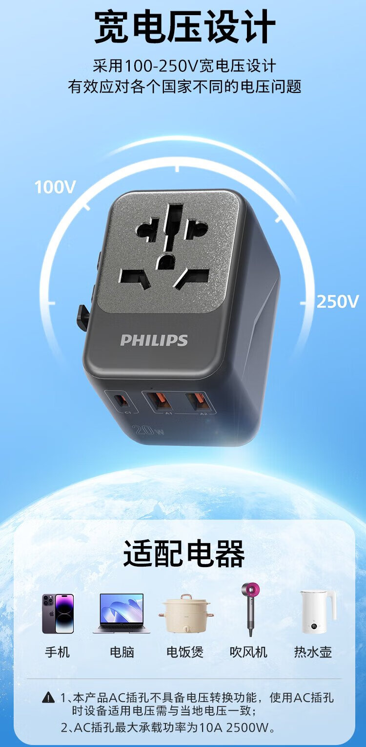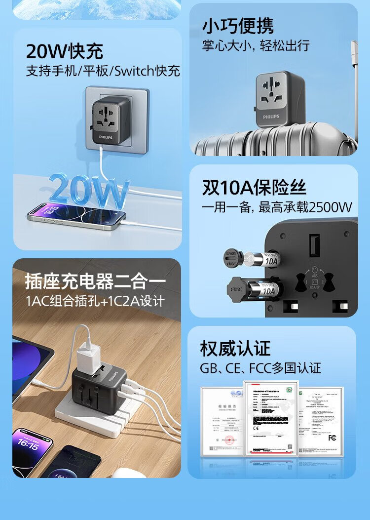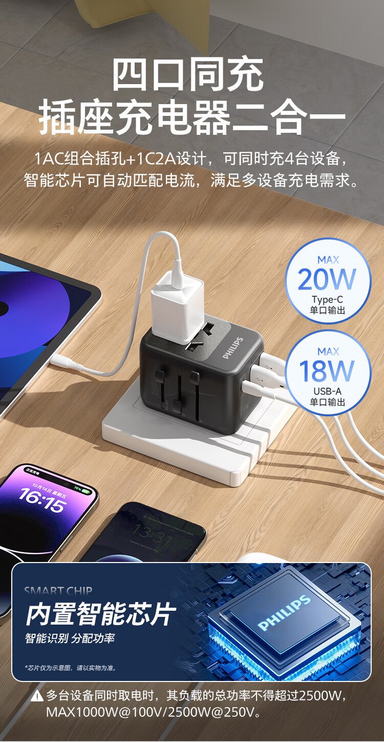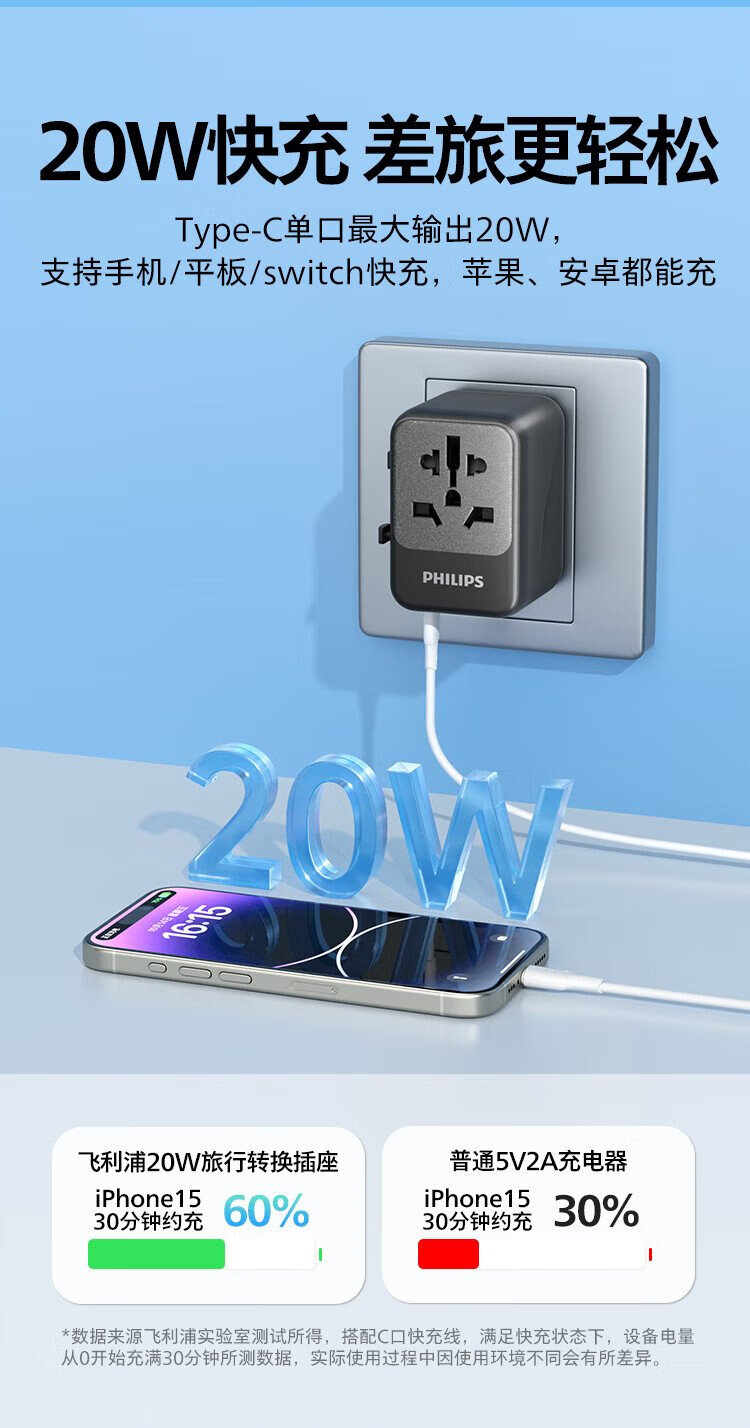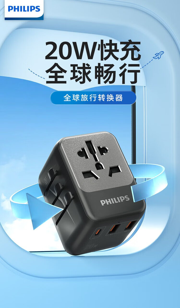 飞利浦(PHILIPS)20WPD快充 转换插头全球通用转换器国际旅行转换器 出国留学转换插头日韩港澳欧洲美标澳标英标