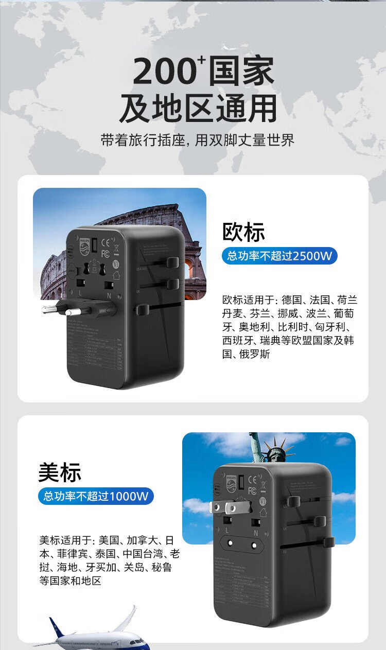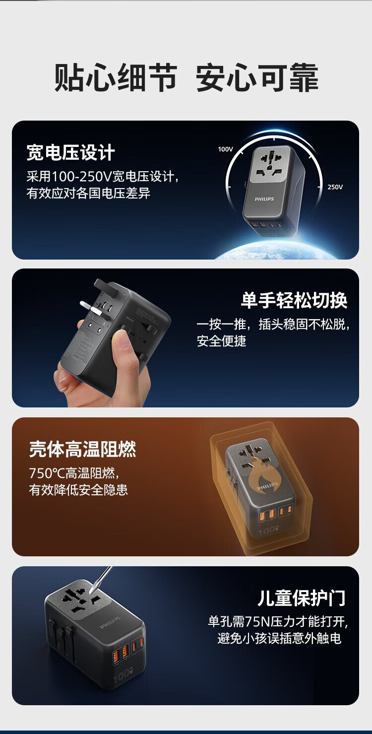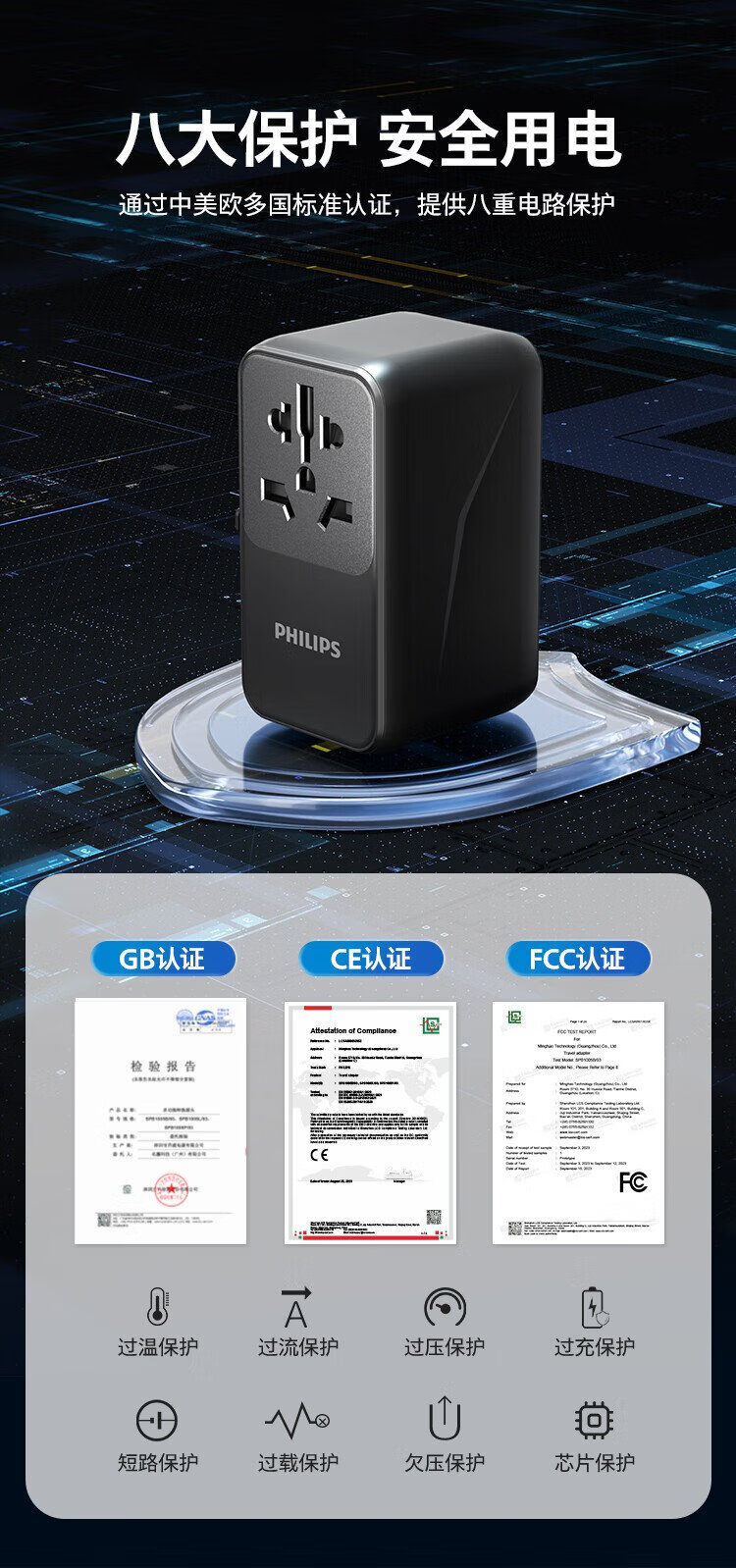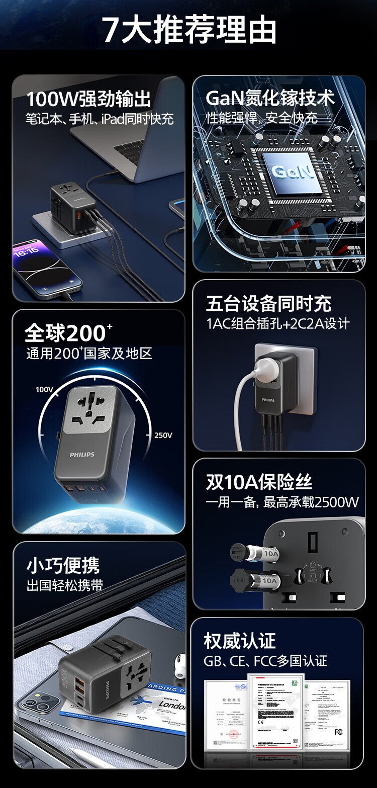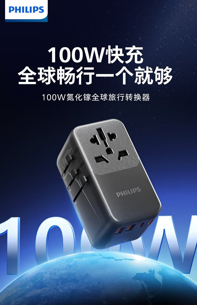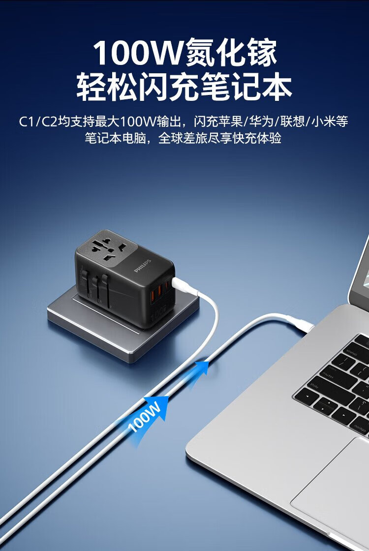 飞利浦(PHILIPS)转换插头留学多国旅行全球通用插头转换器氮化镓100WPD快充笔记本USB港澳日韩东南亚欧洲美澳英标