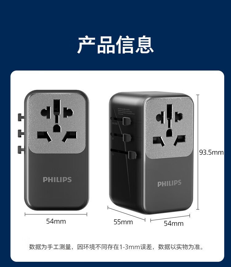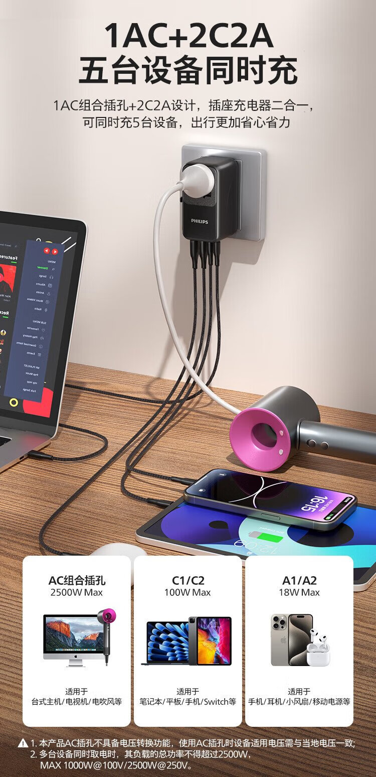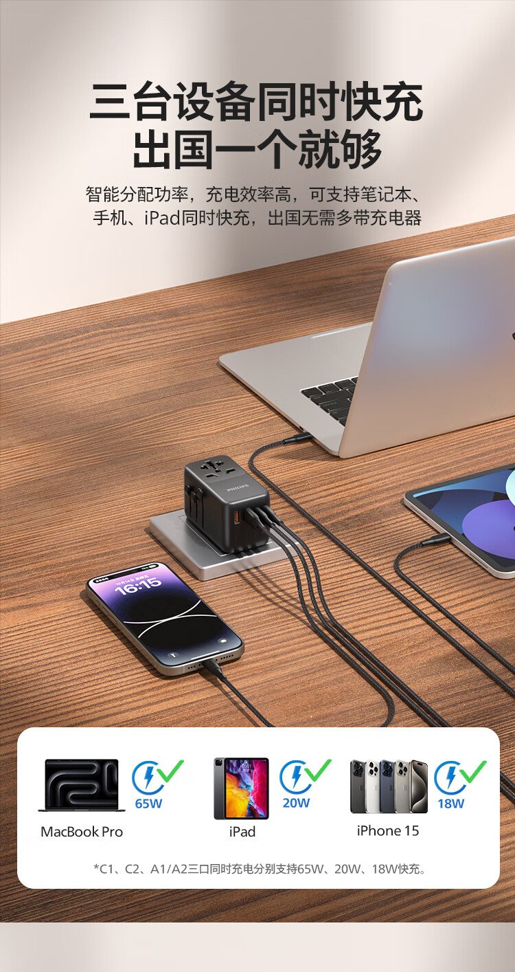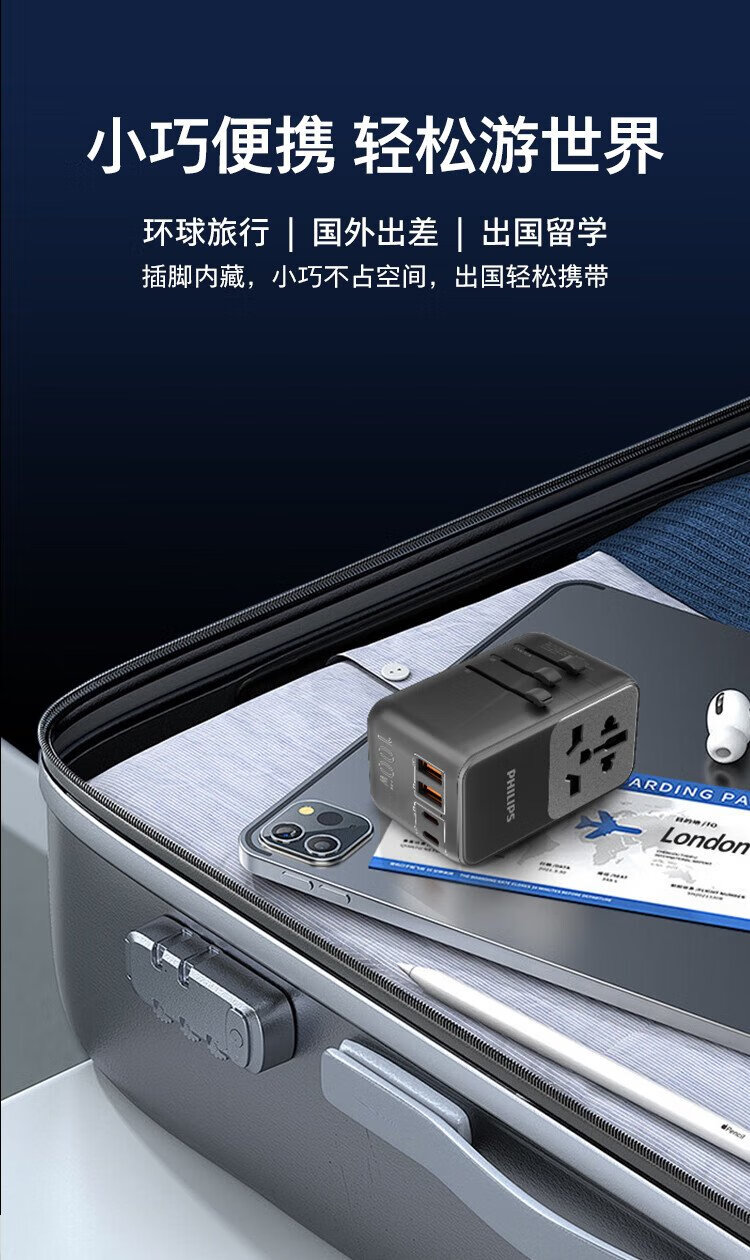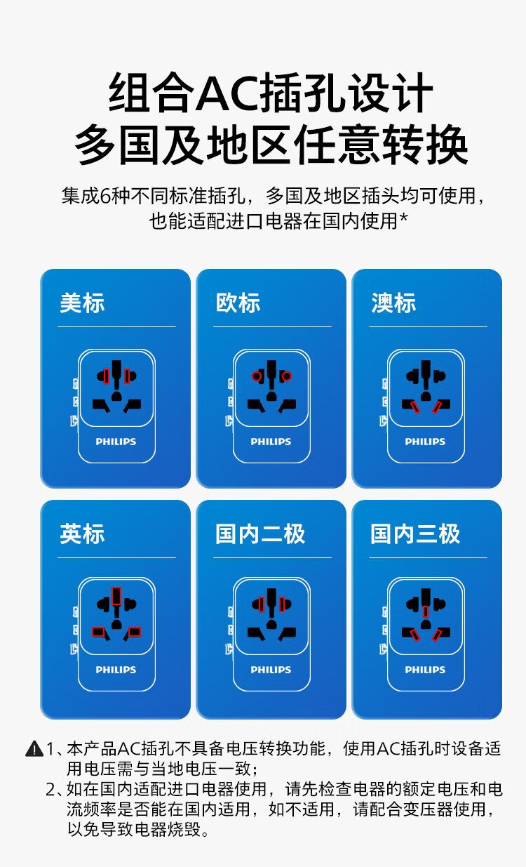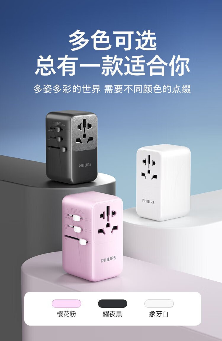 飞利浦(PHILIPS)转换插头留学多国旅行全球通用插头转换器氮化镓100WPD快充笔记本USB港澳日韩东南亚欧洲美澳英标