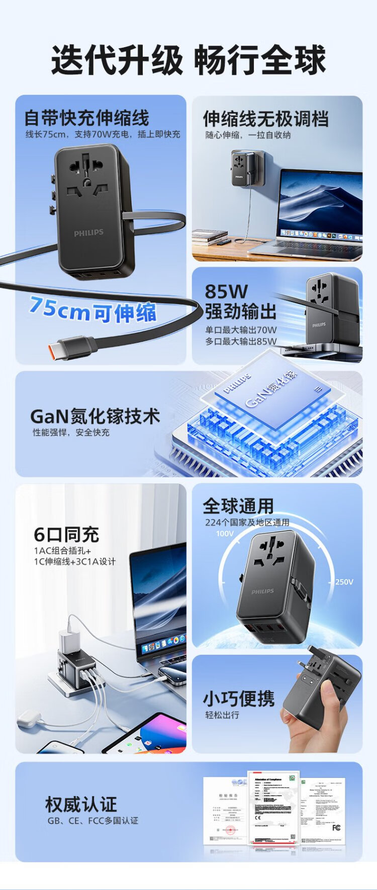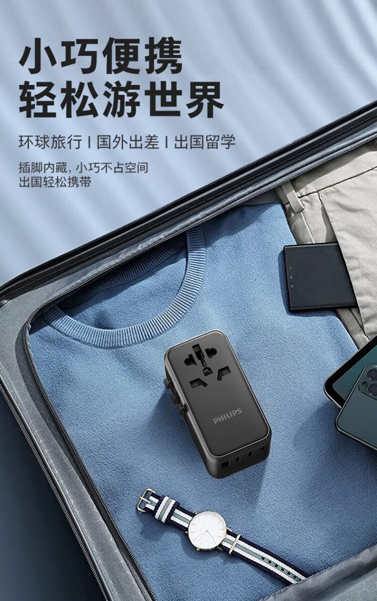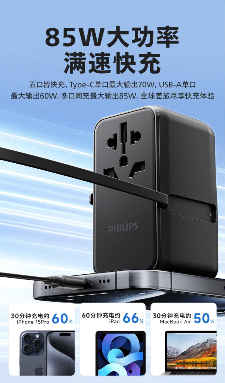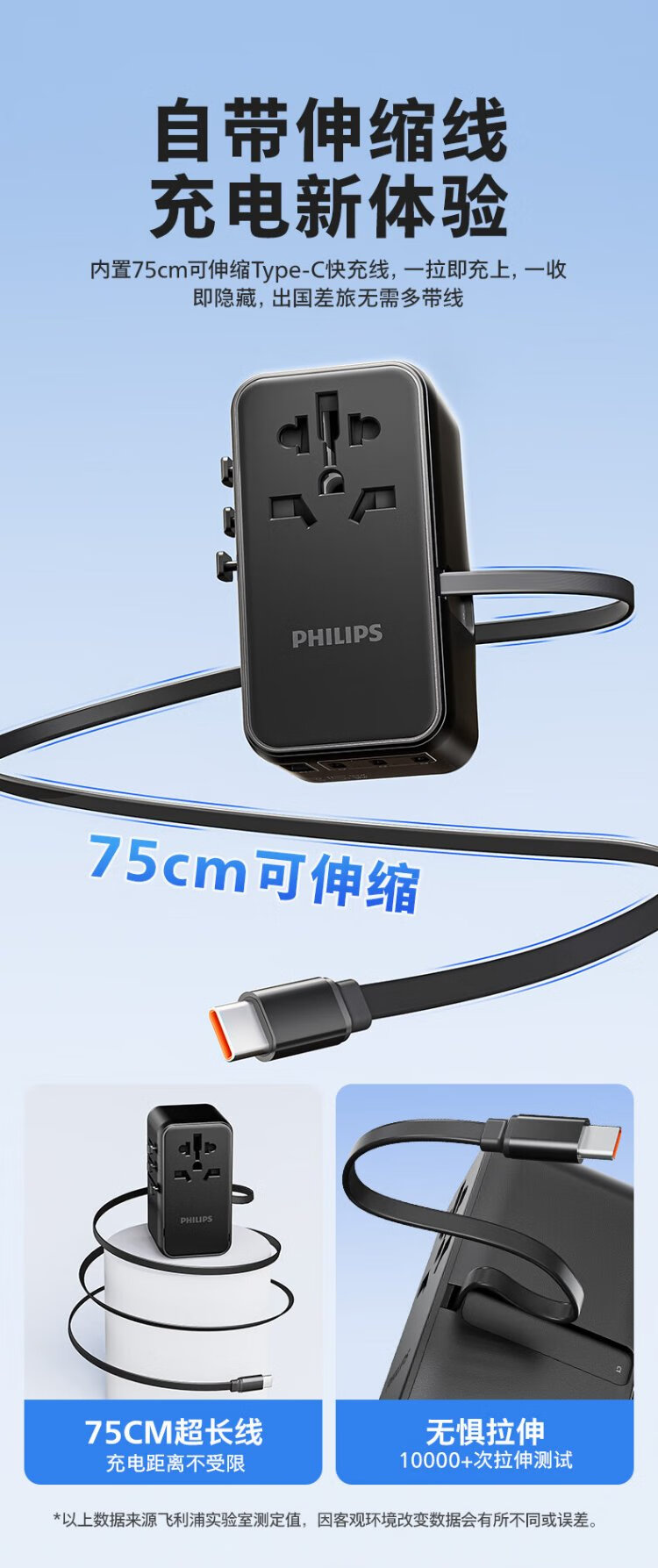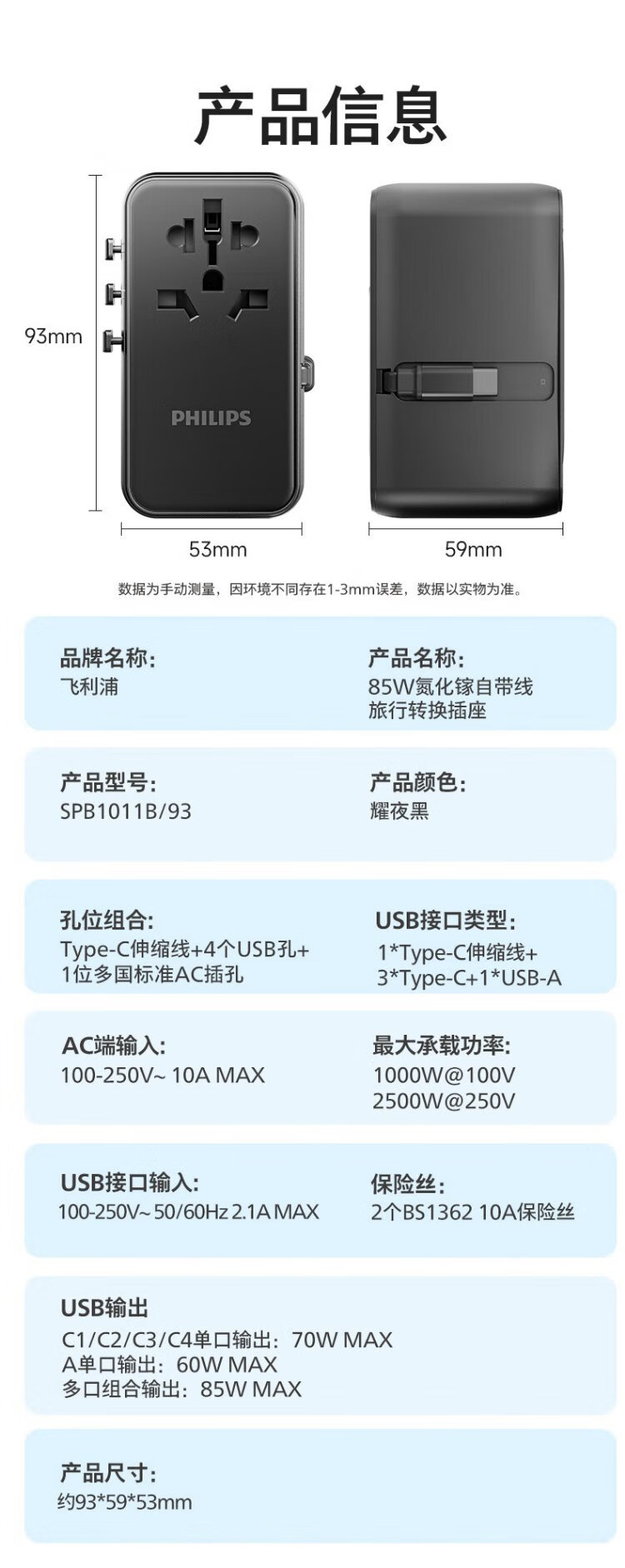 Philips (PHILIPS) 85-W-Schnellladestecker für Übersee/multinationaler Universal-Reisesteckdosenkonverter/Standard für Großbritannien, Europa, Amerika, Australien, Japan und Singapur anwendbar/1A3C+1C mit Kabel 1011B