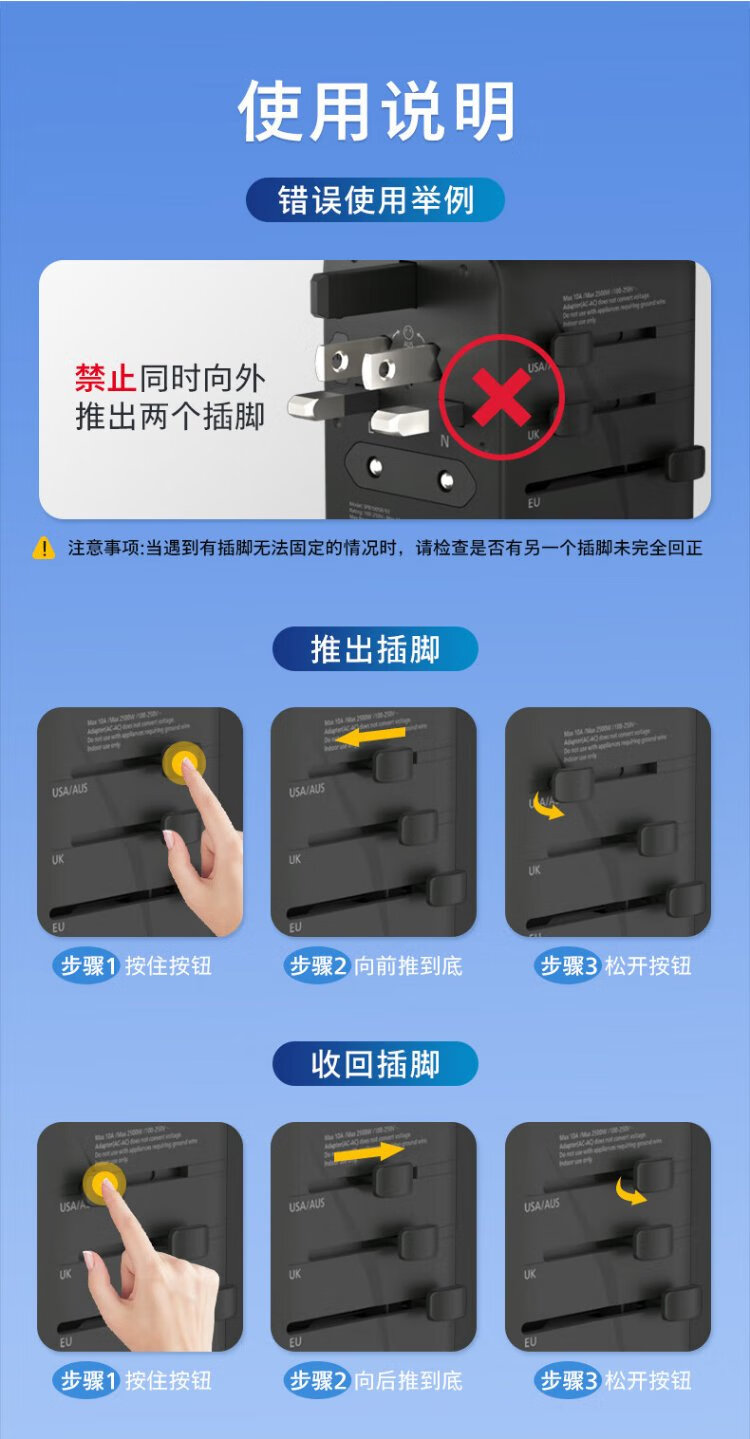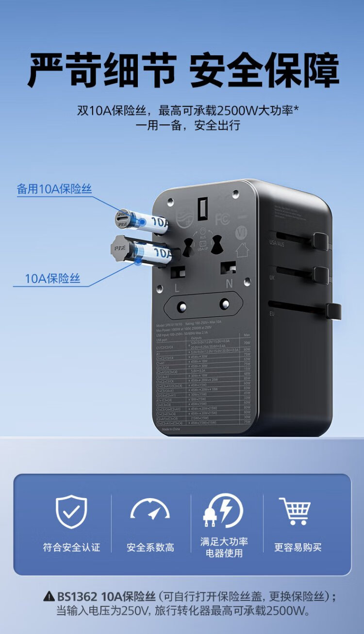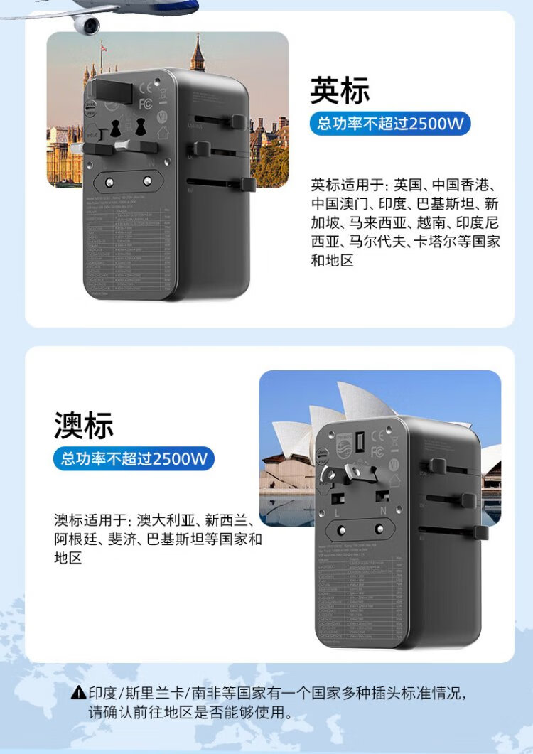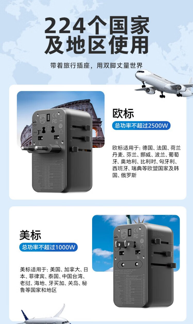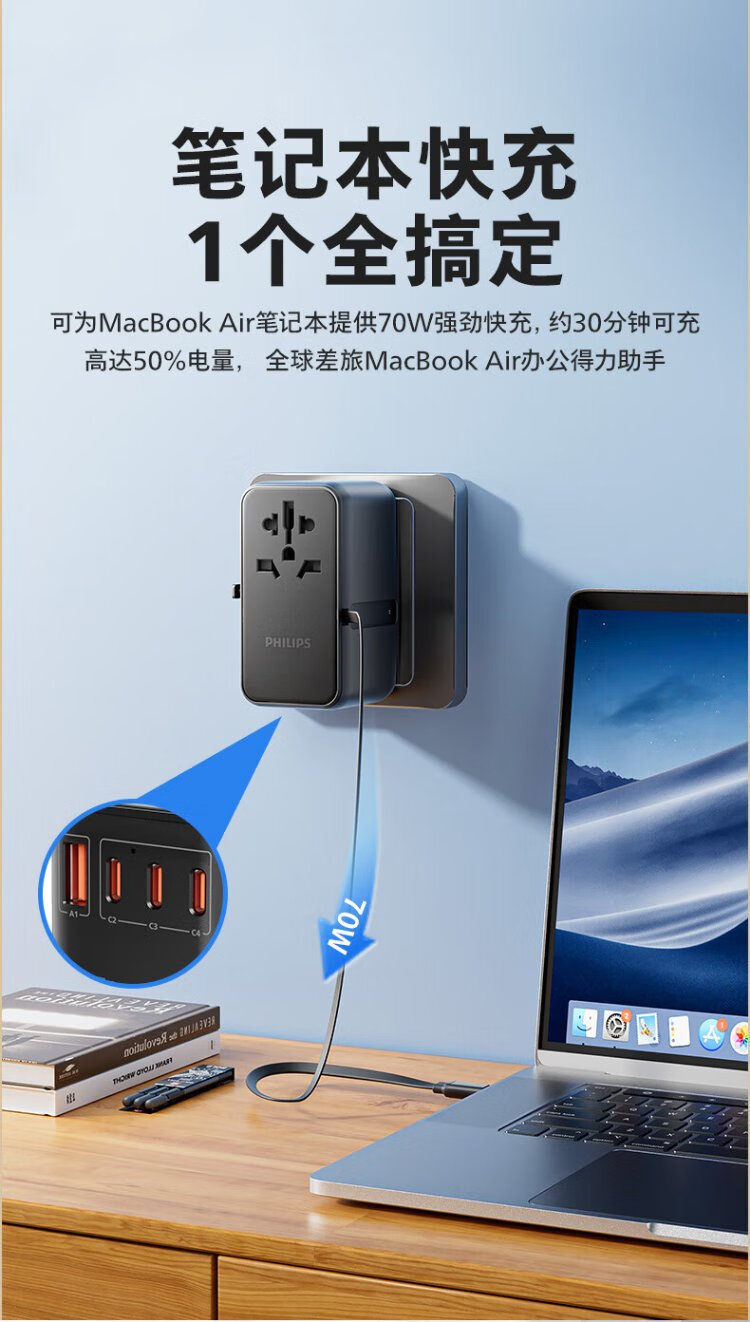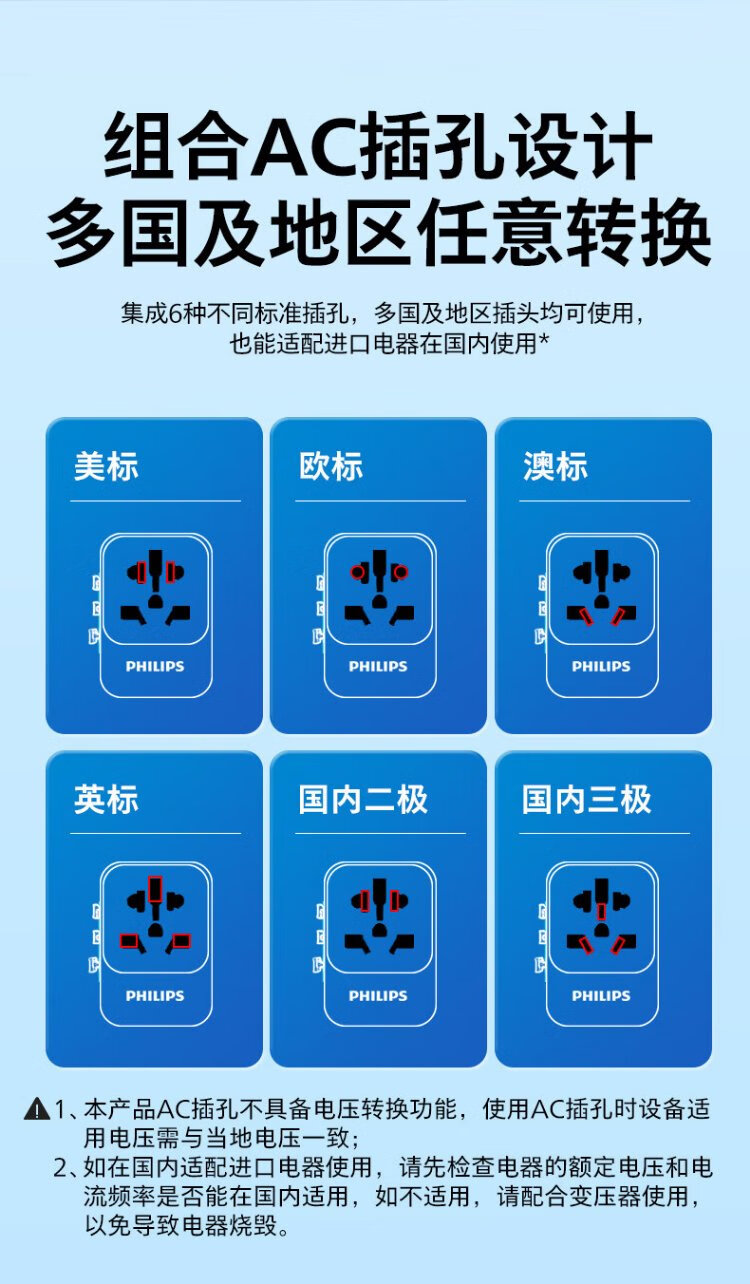 Philips (PHILIPS) 85-W-Schnellladestecker für Übersee/multinationaler Universal-Reisesteckdosenkonverter/Standard für Großbritannien, Europa, Amerika, Australien, Japan und Singapur anwendbar/1A3C+1C mit Kabel 1011B