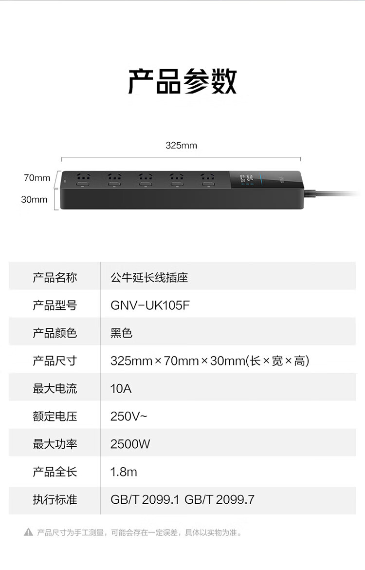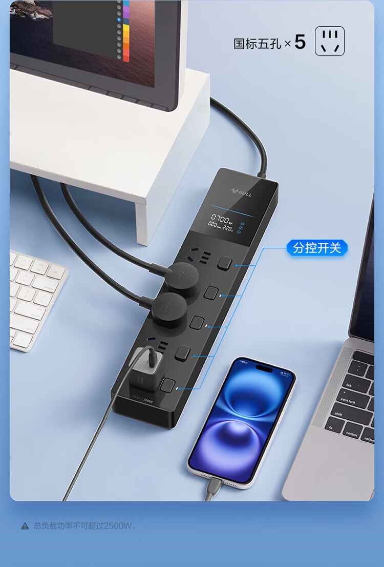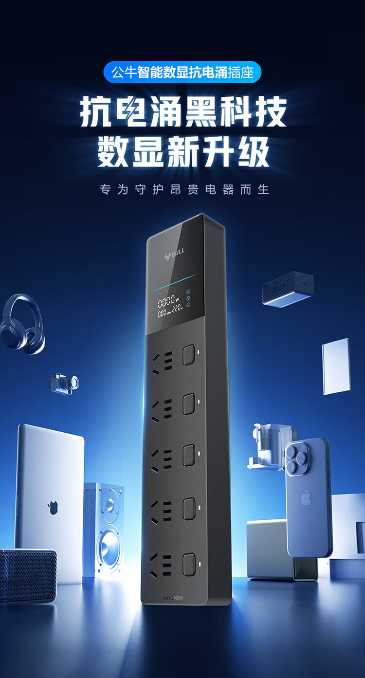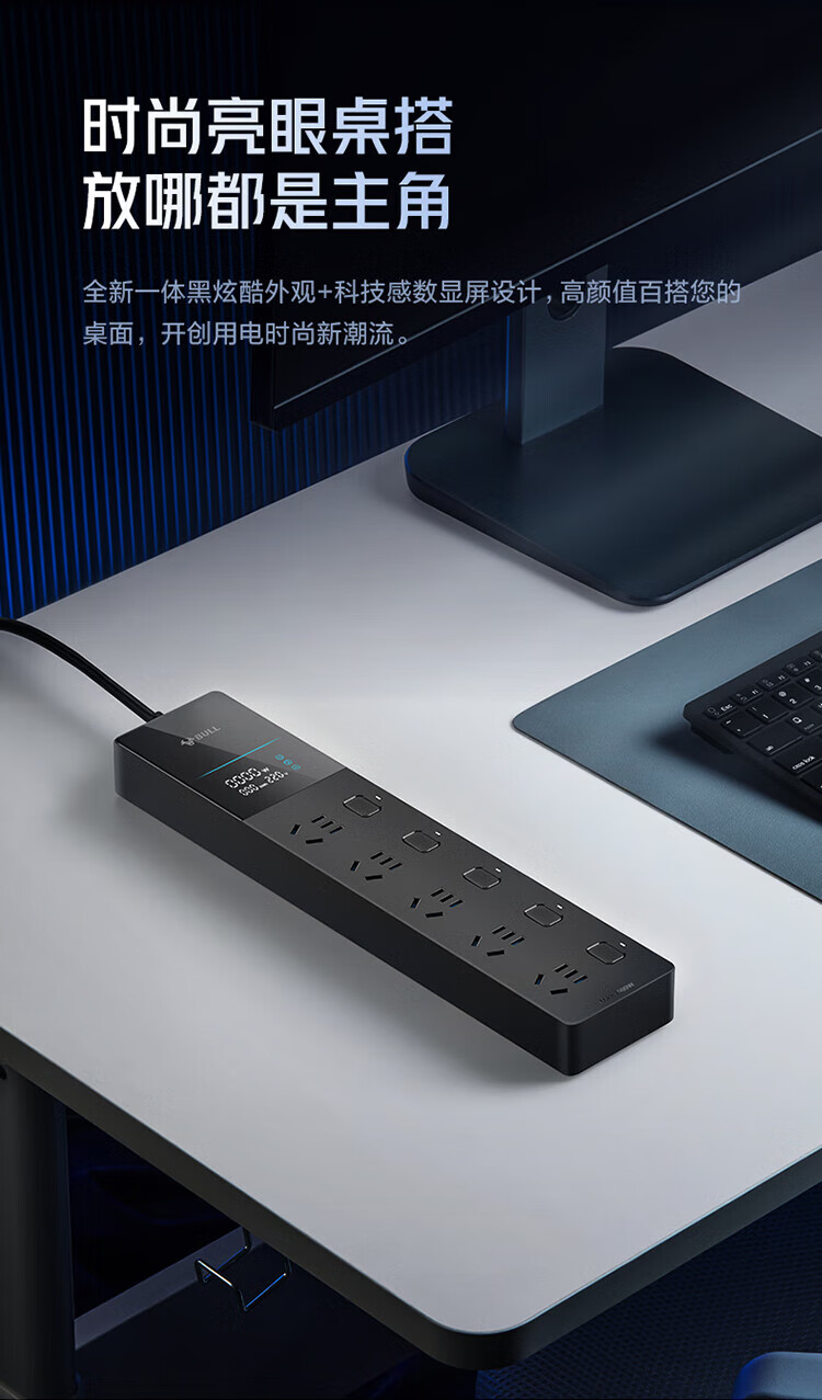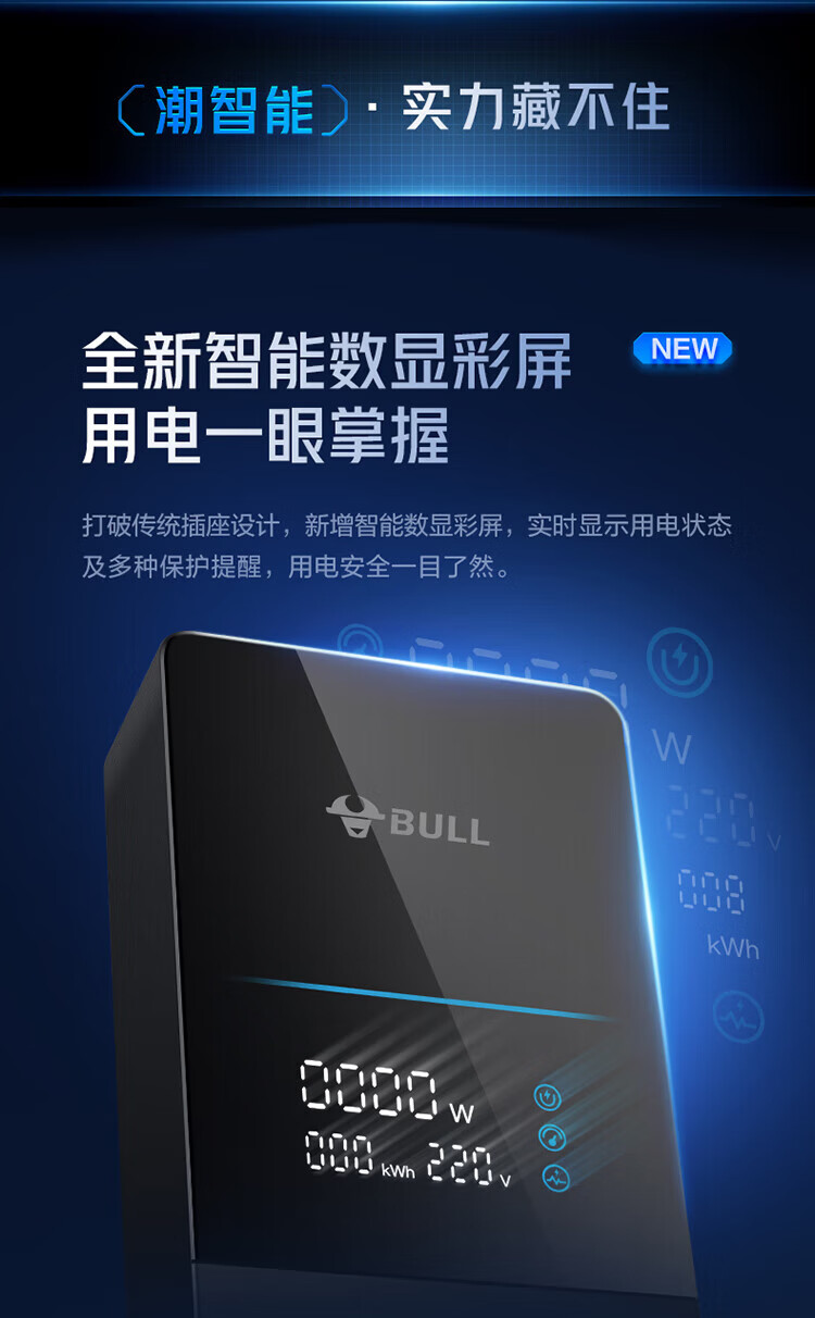 BULL intelligent digital display anti-surge and lightning protection overload protection socket/socket board/socket strip/socket strip/wiring board 5-position sub-control switch with total length of 1.8 meters GNV-UK105F