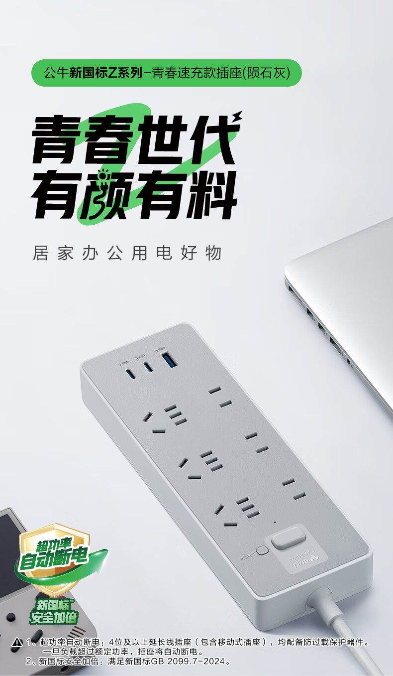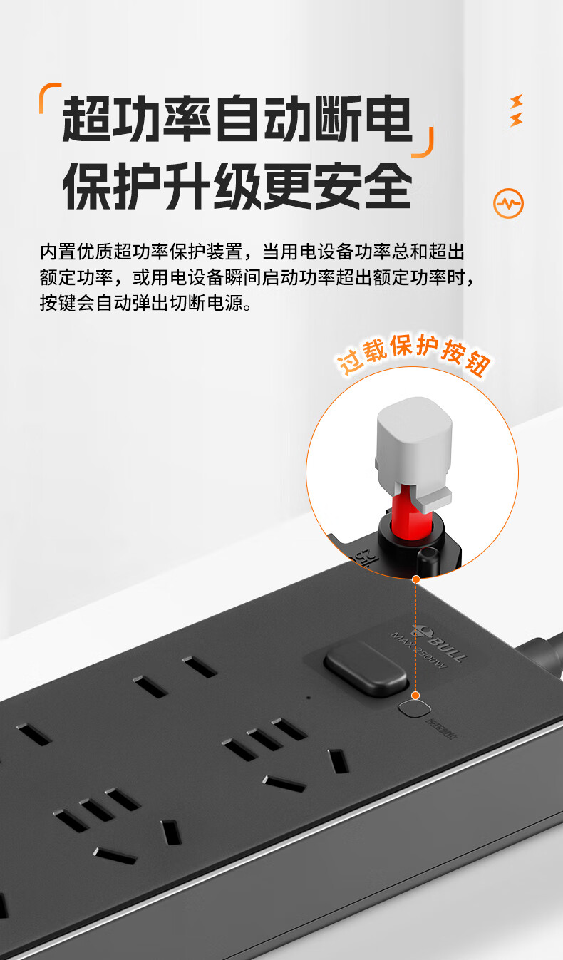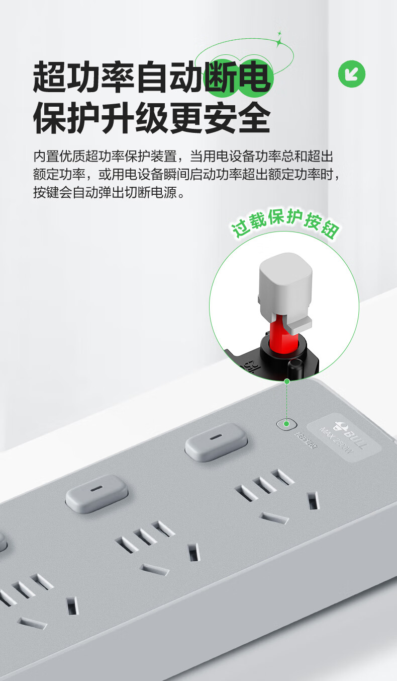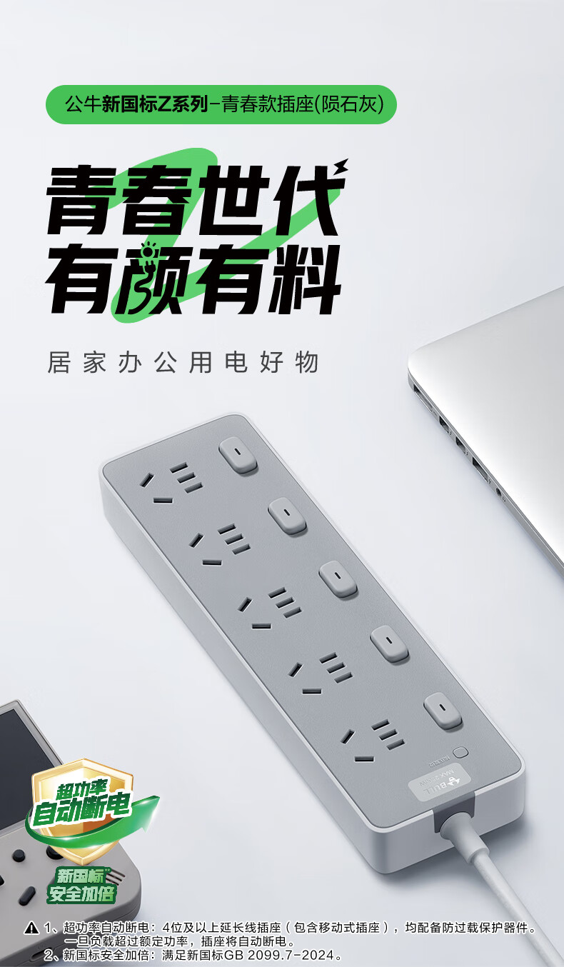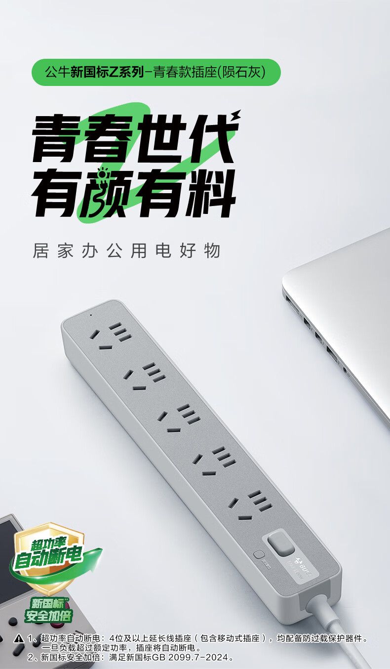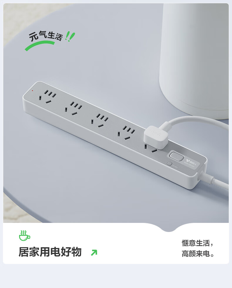 Bull (BULL) socket basic model master control switch drag strip porous long line multi-functional electrical plug-in board with child protection door/new national standard/row plug/wiring board gray Z generation series four-socket master control 1 meter-Z1221J meteorite gray