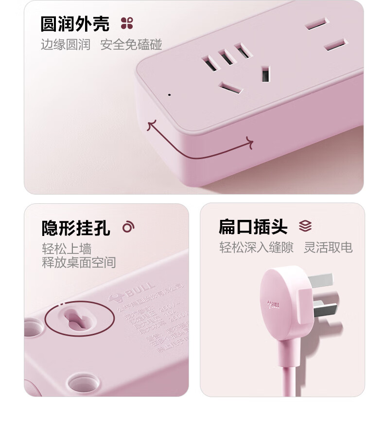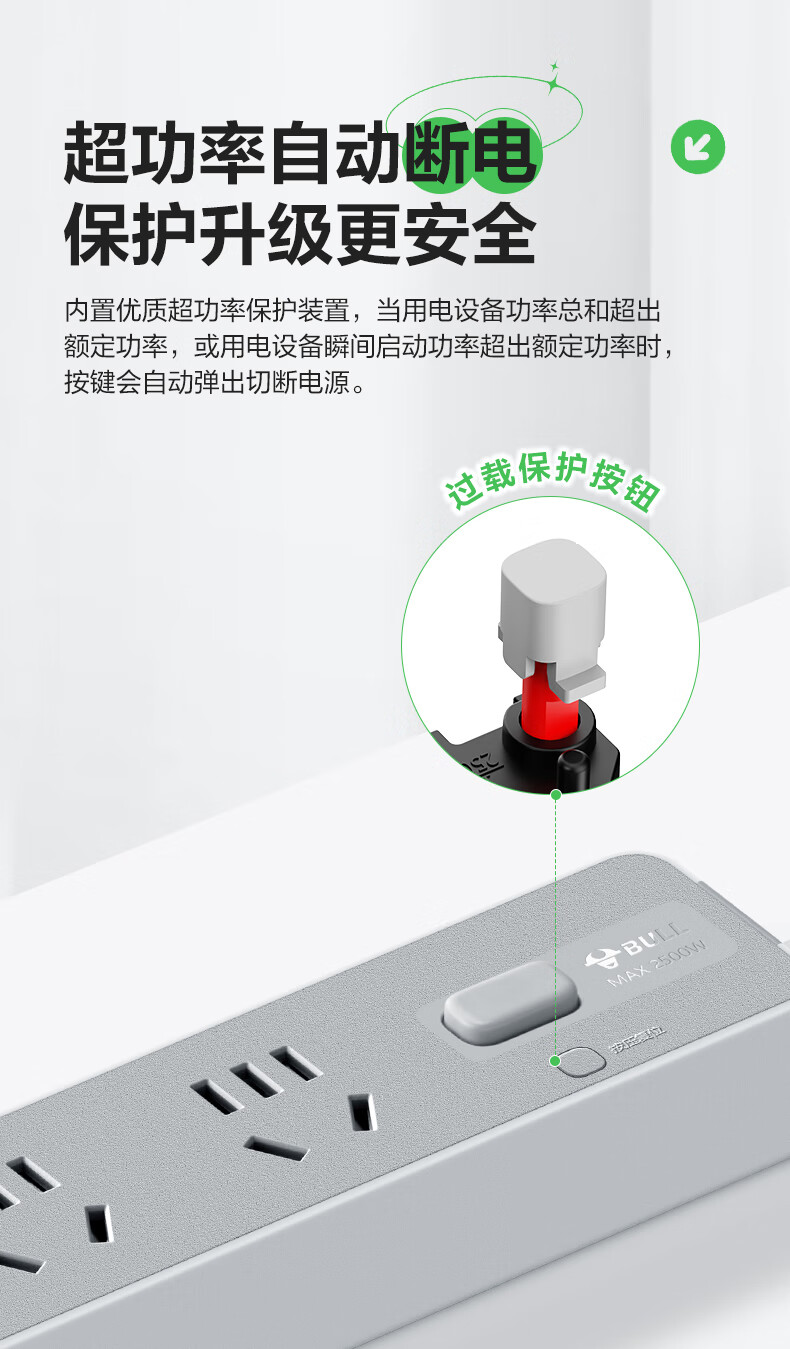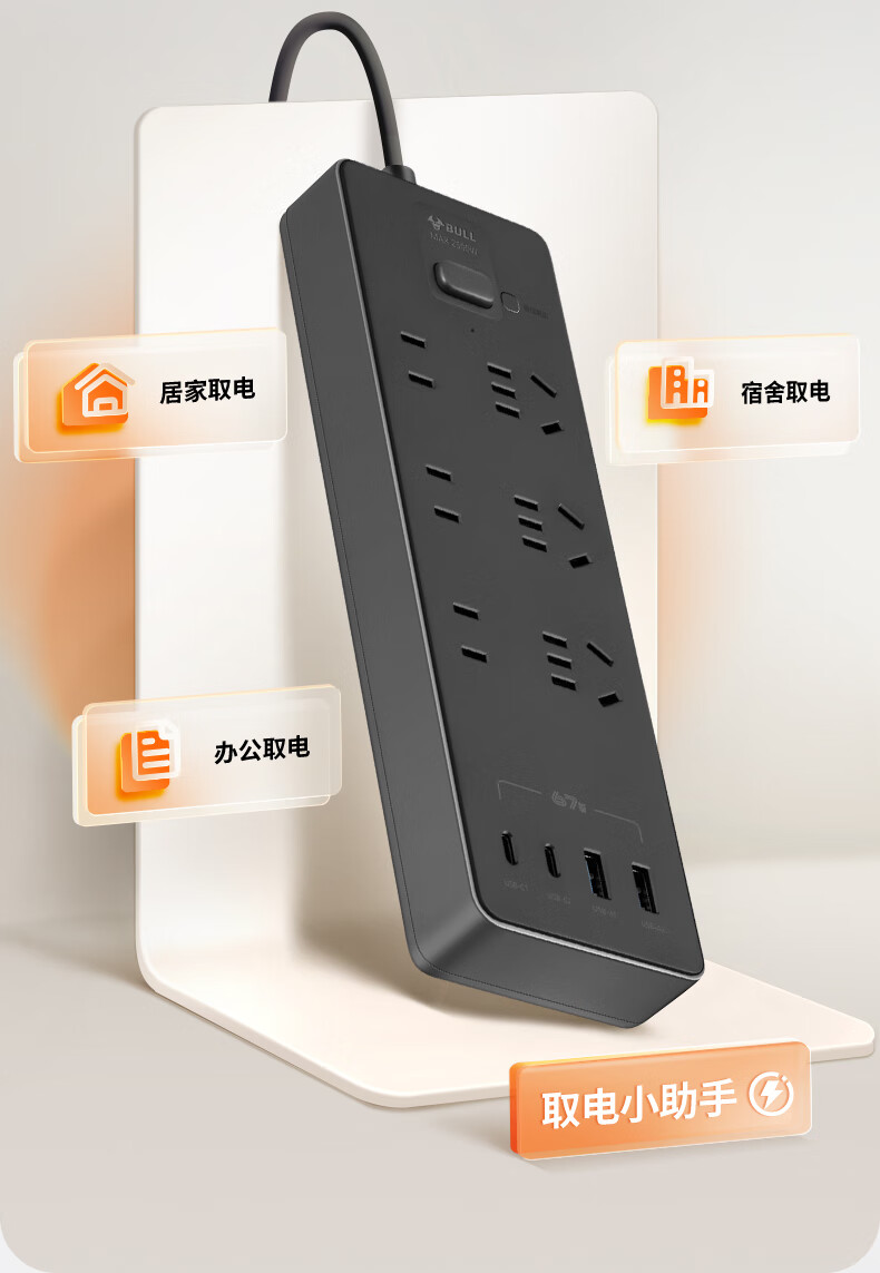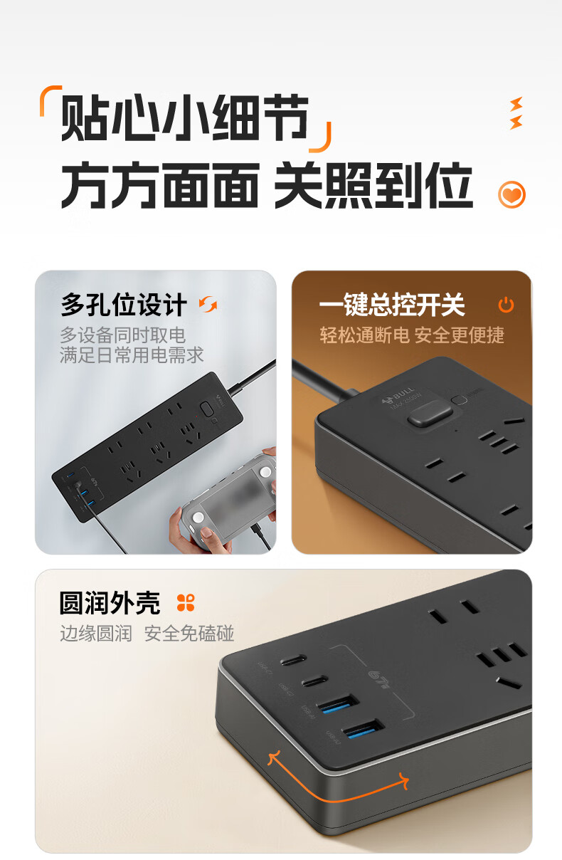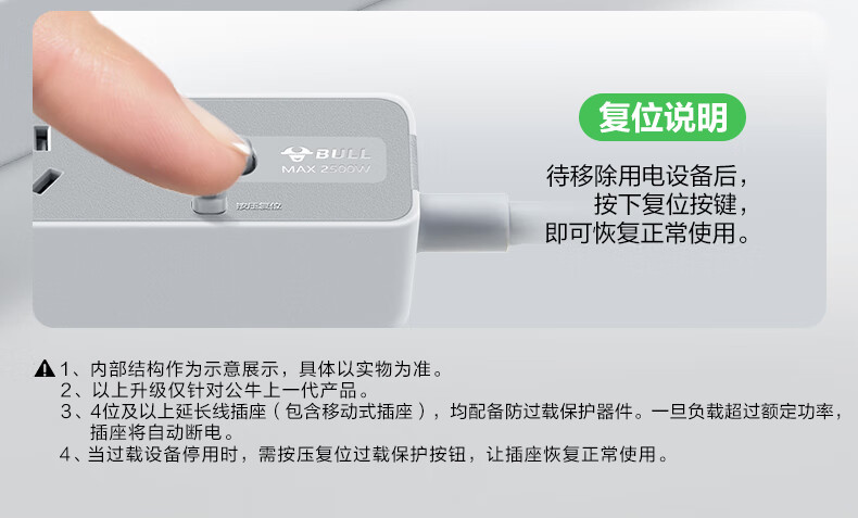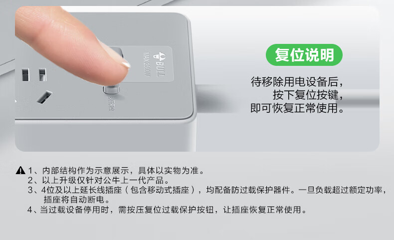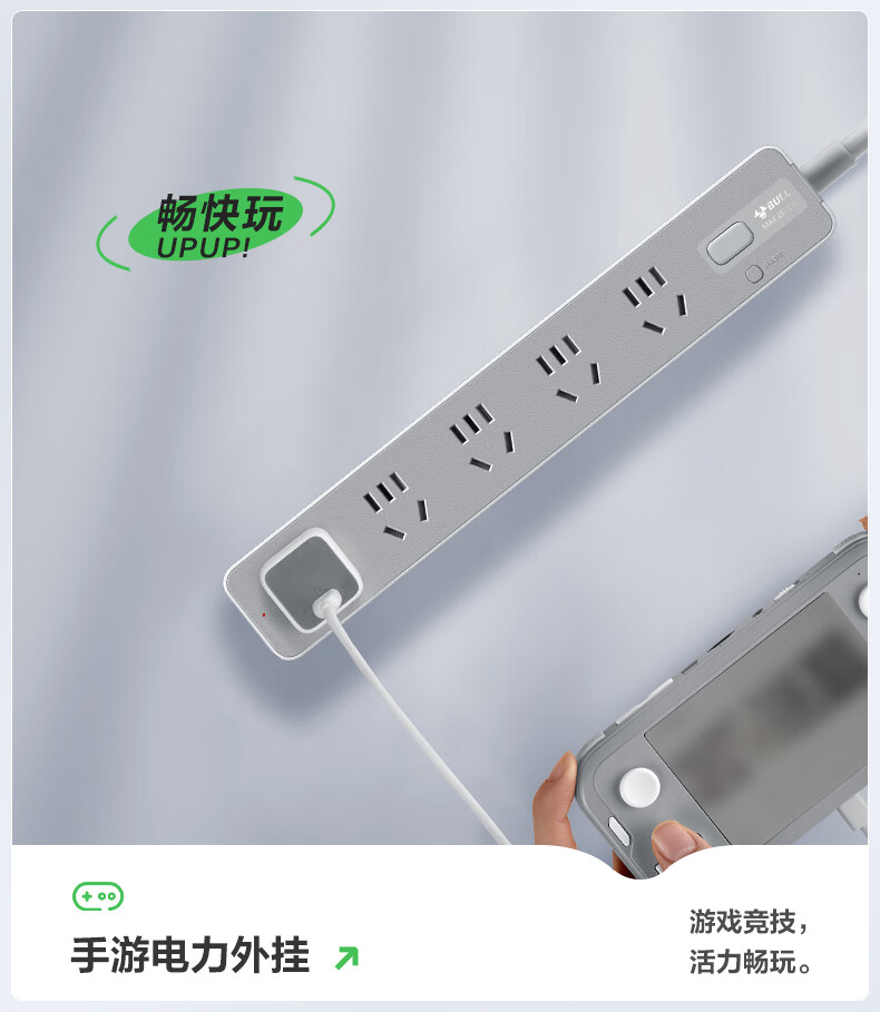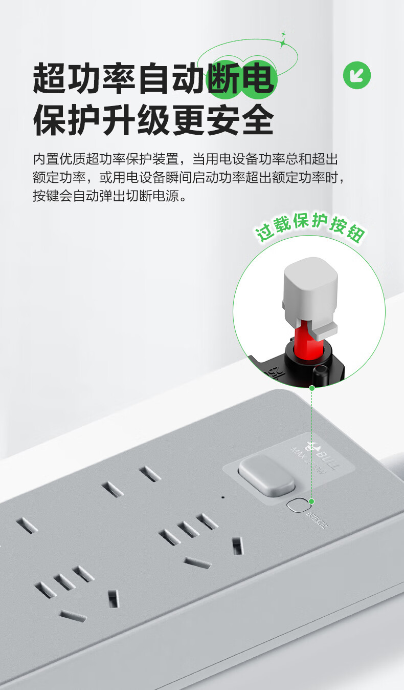 Bull (BULL) socket basic model master control switch drag strip porous long line multi-functional electrical plug-in board with child protection door/new national standard/row plug/wiring board gray Z generation series four-socket master control 1 meter-Z1221J meteorite gray