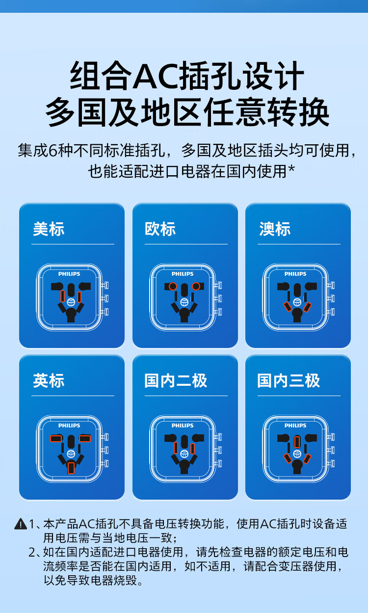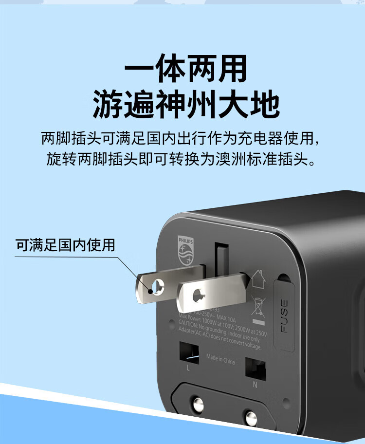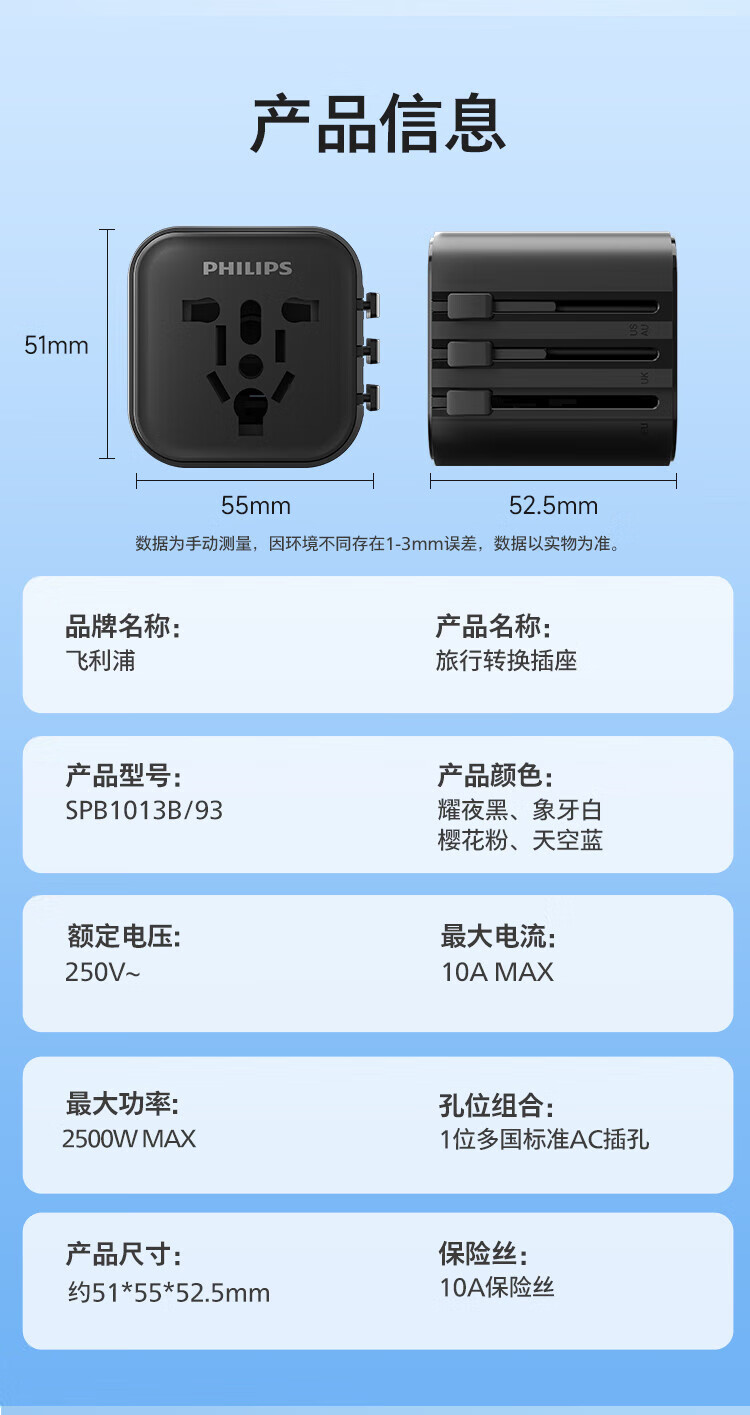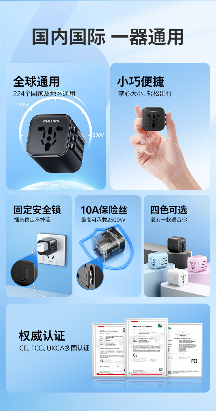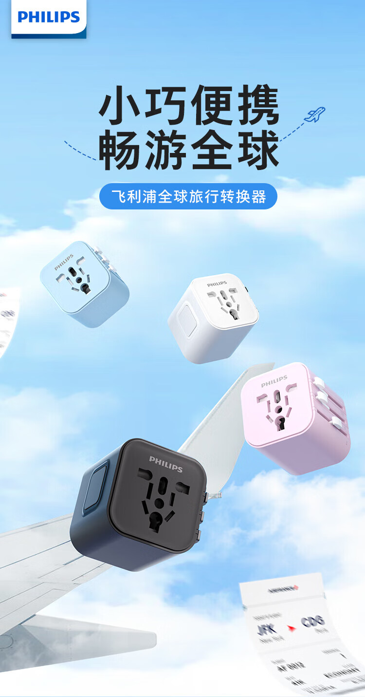 Philips Global Universal Adapter Plug Universal Multi-Country Travel Socket Adapter Suitable for Europe/UK/Hong Kong and Macao/USA/Japan/Malaysia Overseas Overseas Adapter Barbie Fan Hot Style