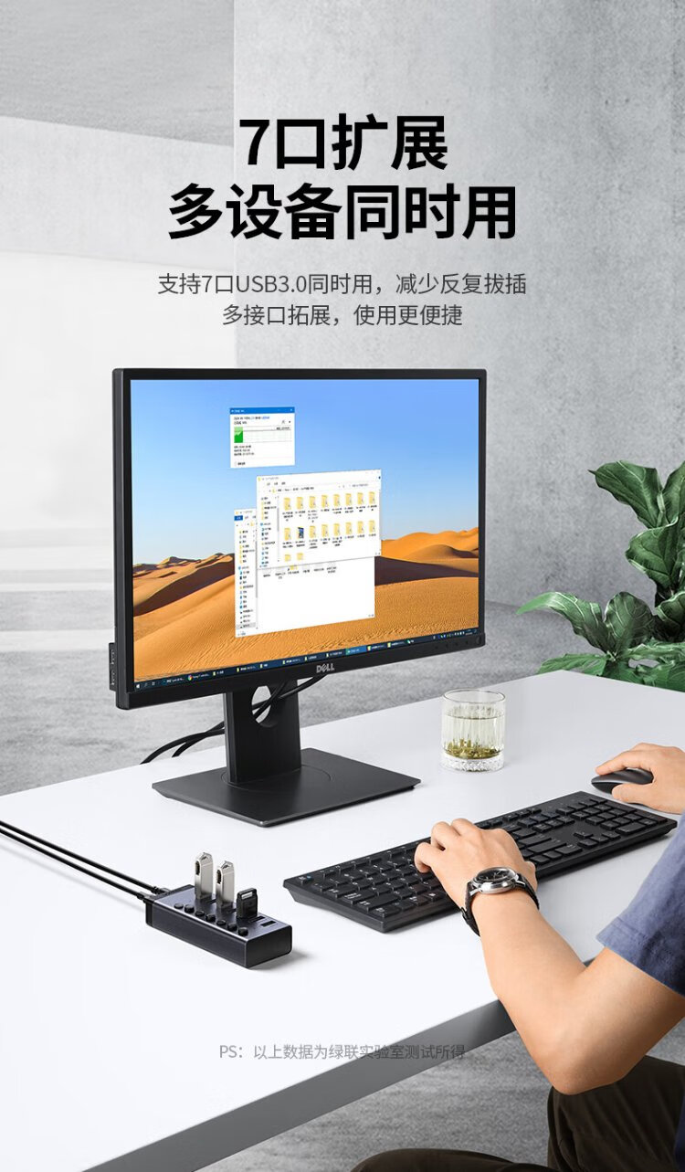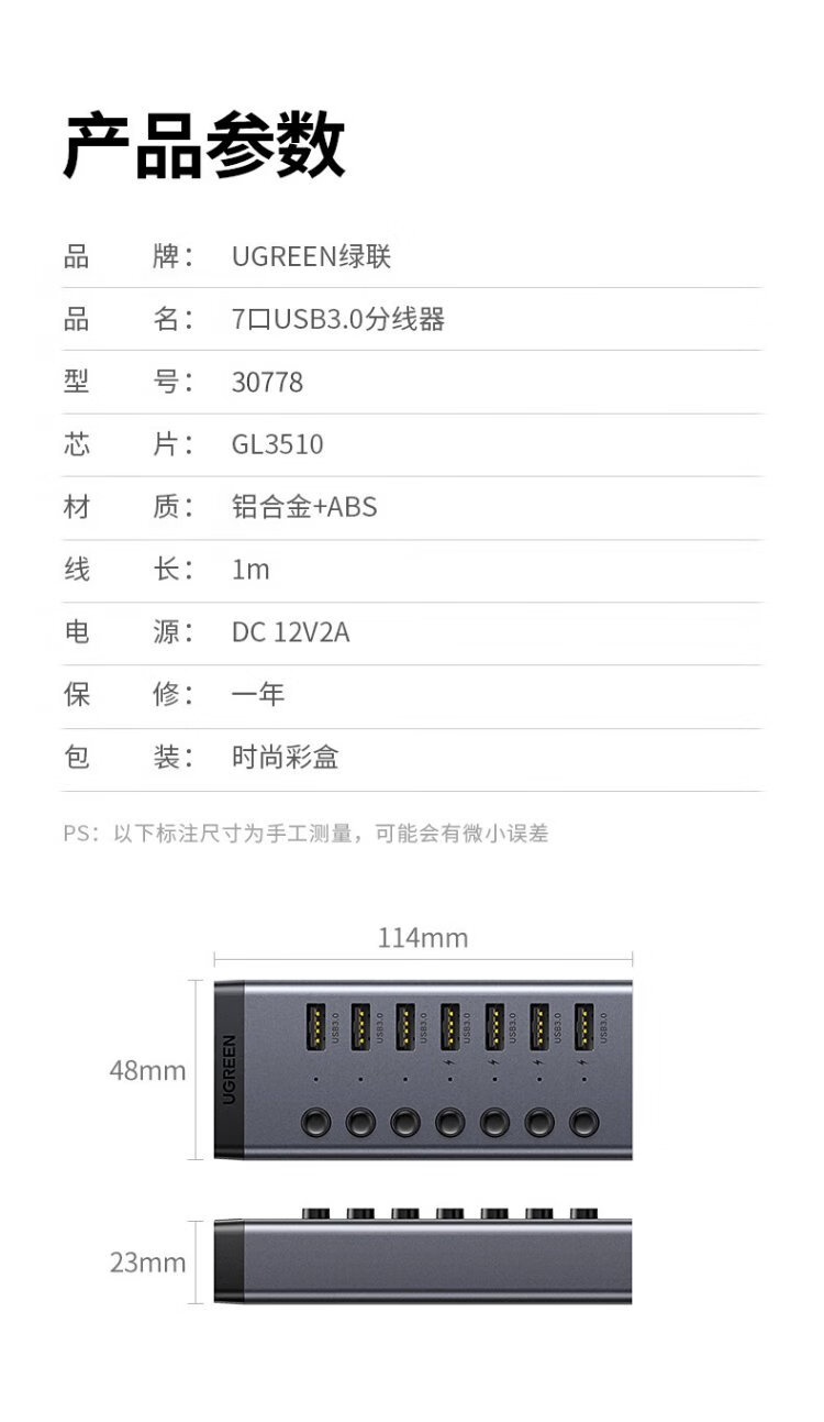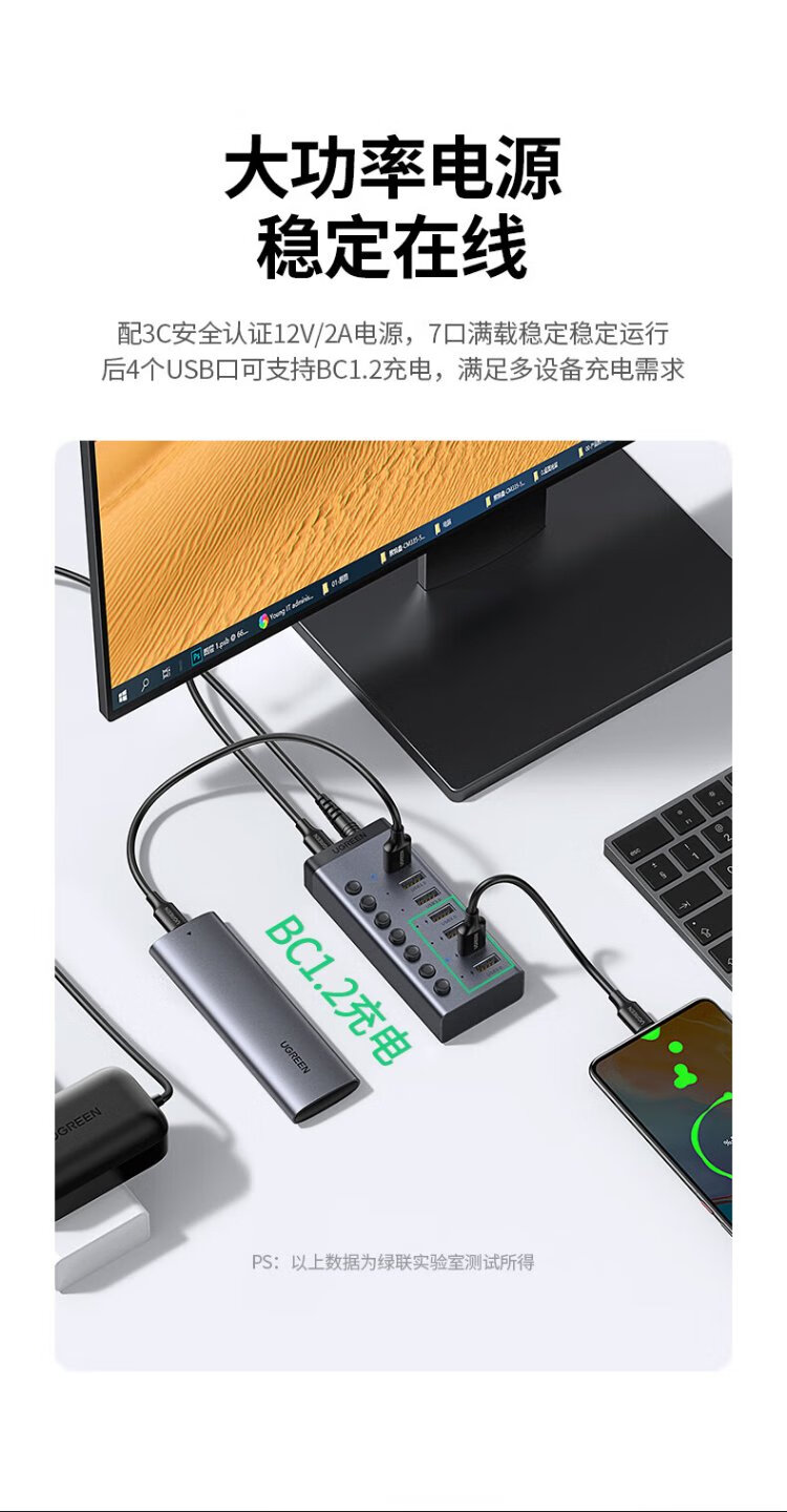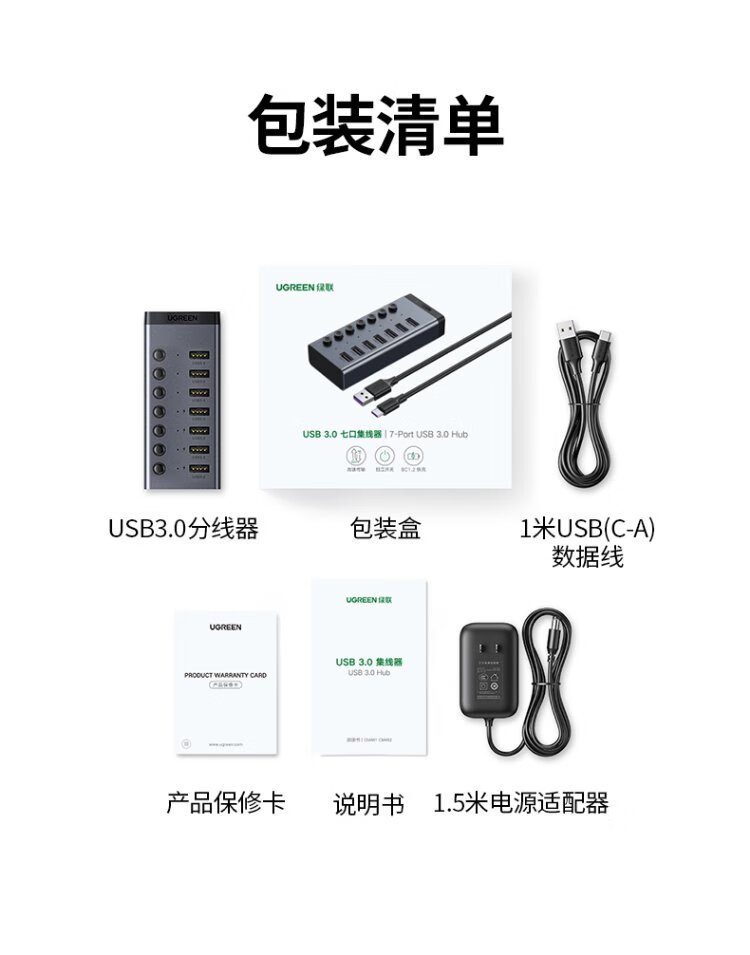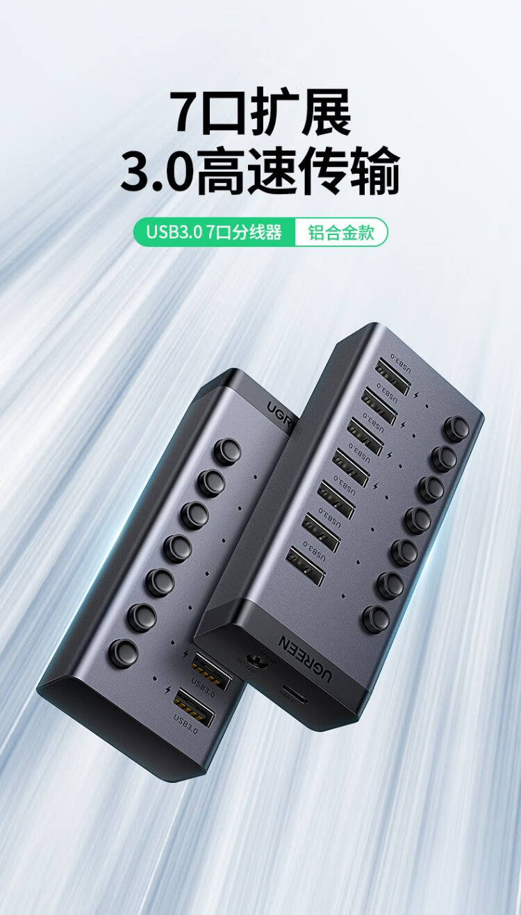 绿联 USB3.0扩展器分线器一拖七口高速扩展坞 笔记本台式电脑接硬盘键鼠HUB延长线拓展坞配12V2A电源